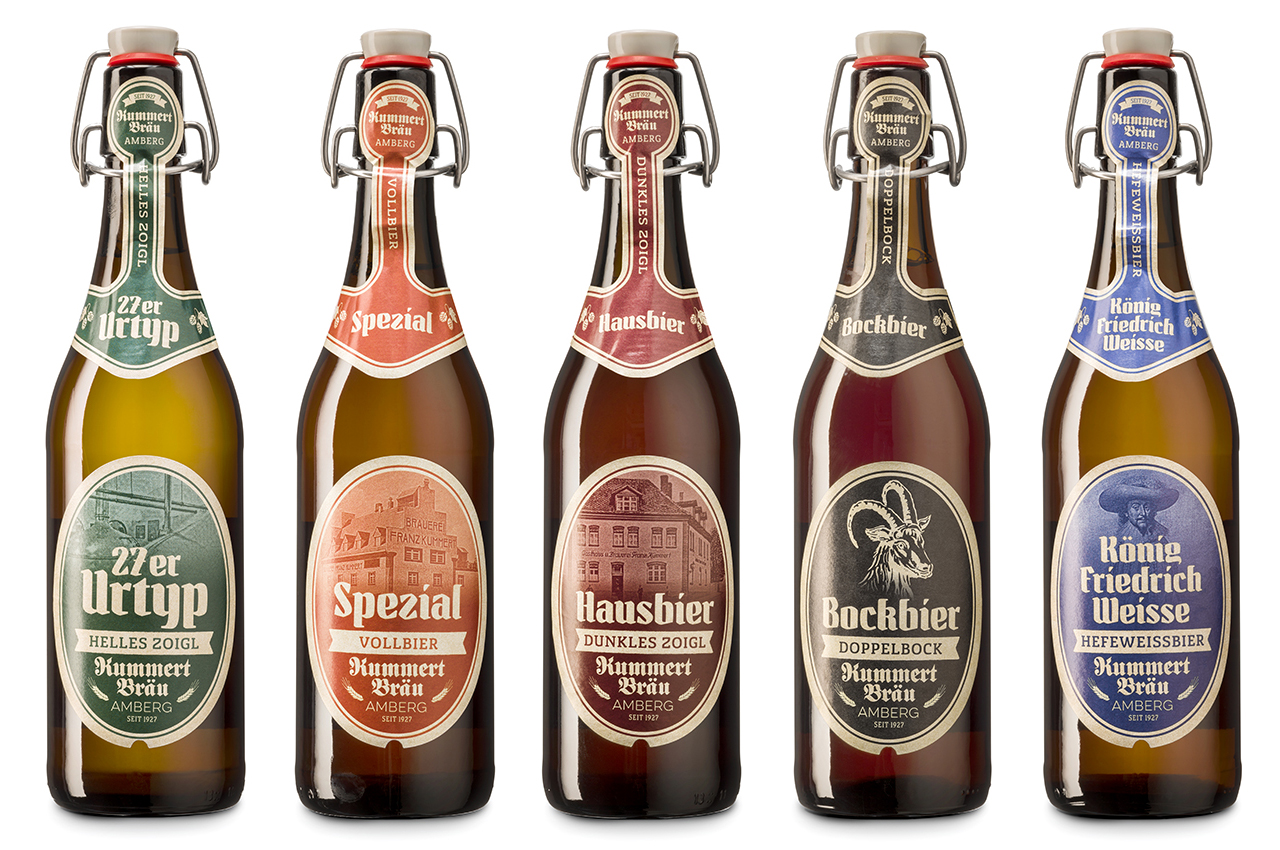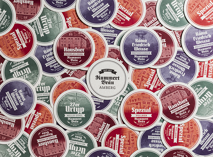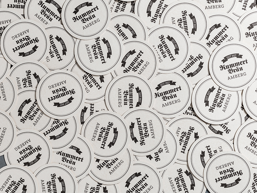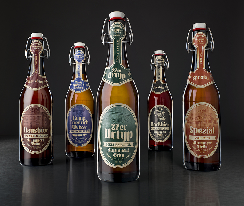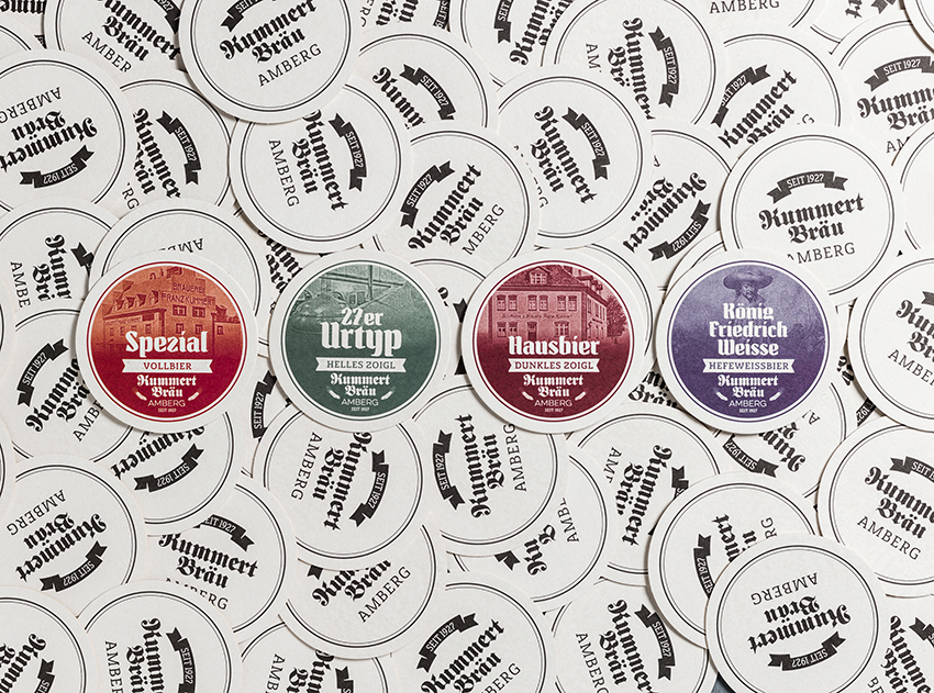 New labels for five beer varieties in historic brewing bottles for the Kummert brewery in Amberg, Bavaria. In addition to the three labels (belly, back, temple), we designed six-packs, beer glasses, and beermats. The fonts in use are Eveleth, Guillemet, and Sancoale. The brewerey’s logo is in Fette Fraktur with a romanized ‘K’.
