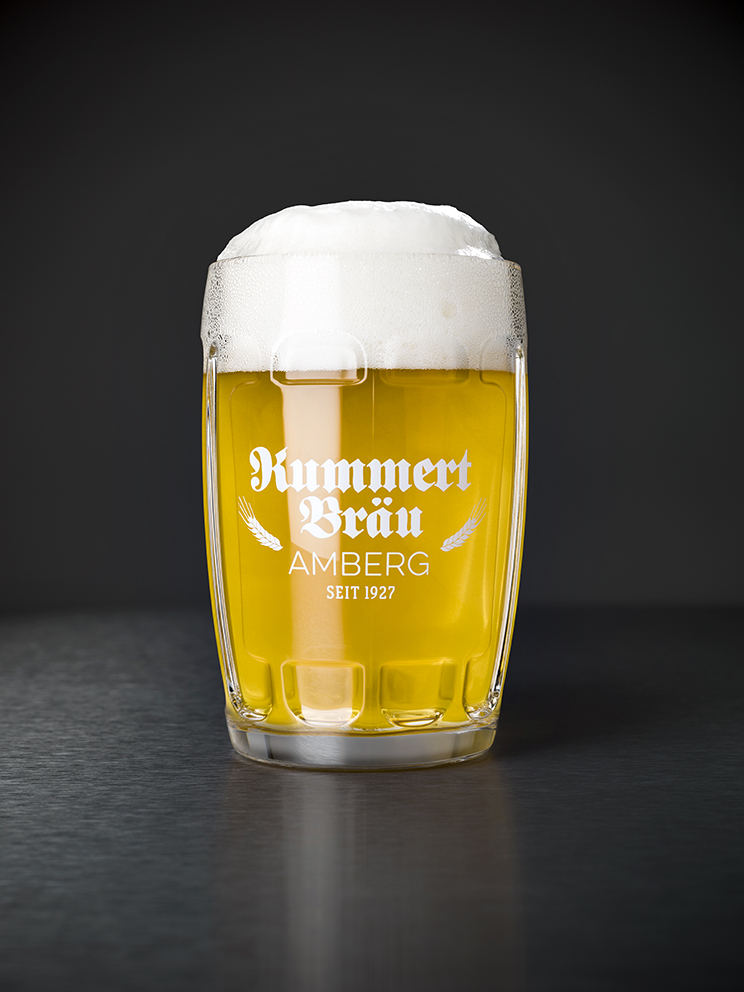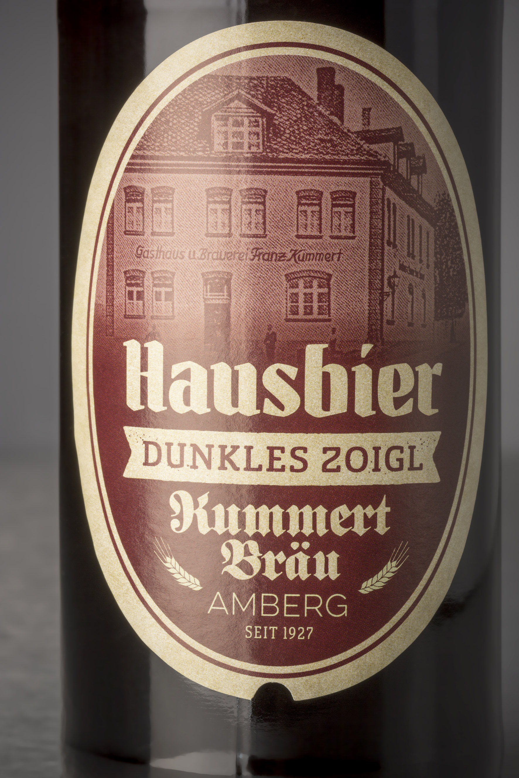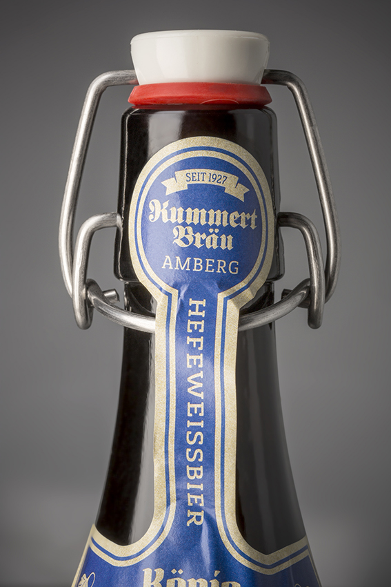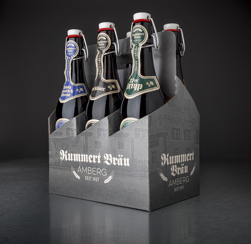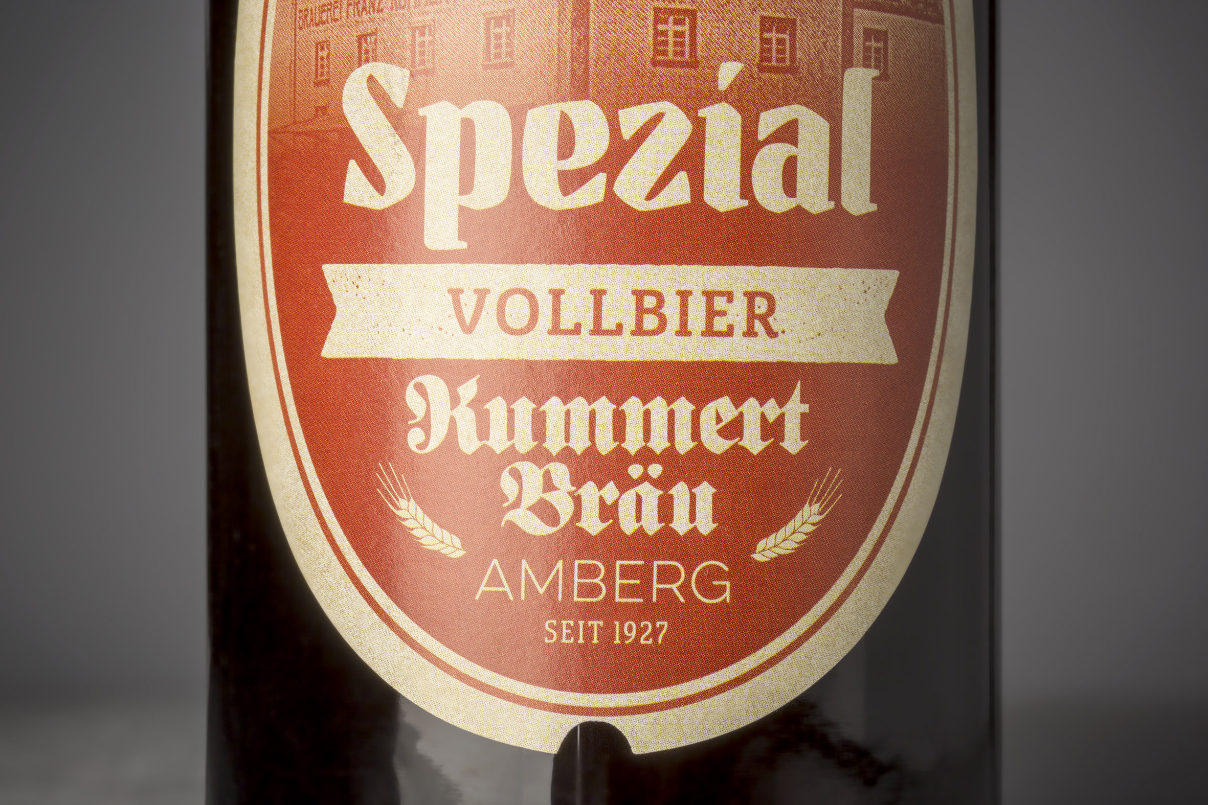 New labels for five beer varieties in historic brewing bottles for the Kummert brewery in Amberg, Bavaria. In addition to the three labels (belly, back, temple), we designed six-packs, beer glasses, and beermats. The fonts in use are Eveleth, Guillemet, and Sancoale. The brewerey’s logo is in Fette Fraktur with a romanized ‘K’.
