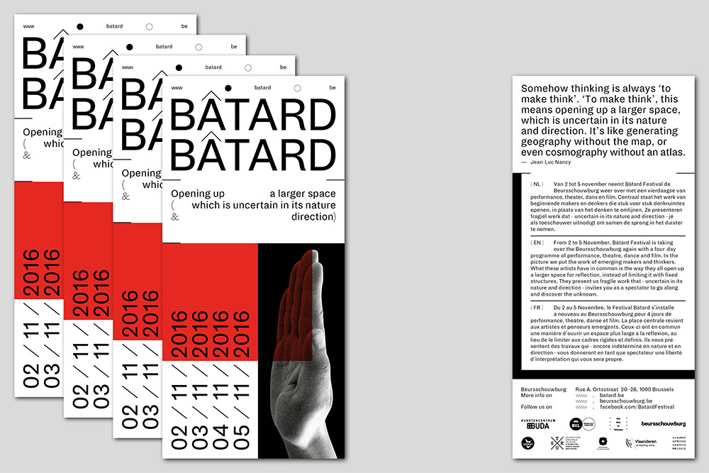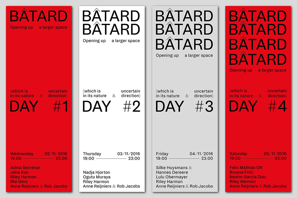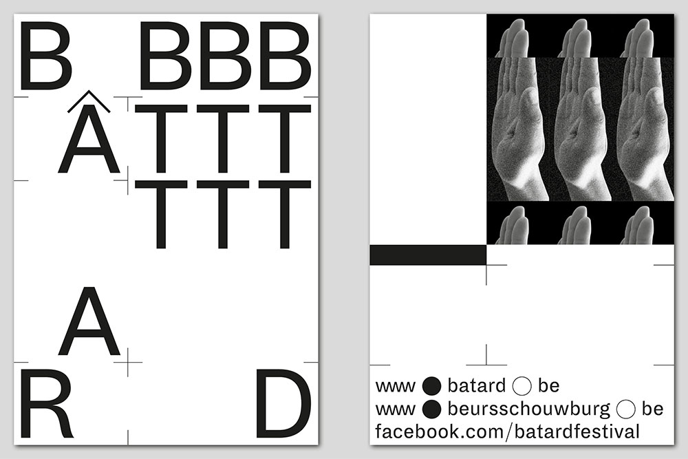 When crafting the identity for art festival Bâtard 2016 the amazingly talented Ines Cox and Ward Heirwegh used Schick Toikka’s grot Dia, endlessly repeated and set to large fields of dark red. Cox uses the alternative, razor-sharp diacritics and punctuation found in the typeface to cut through the bold graphics. The capital ‘Â’ in Bâtard has even been modified to further accentuate the contrast.