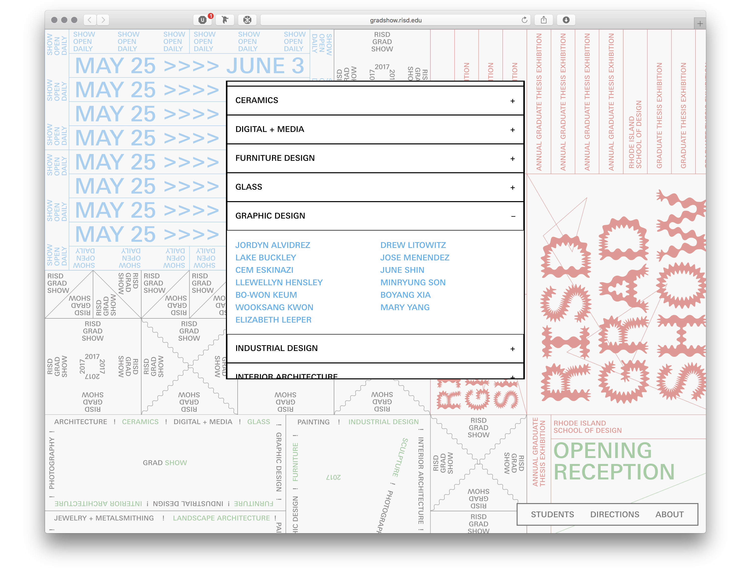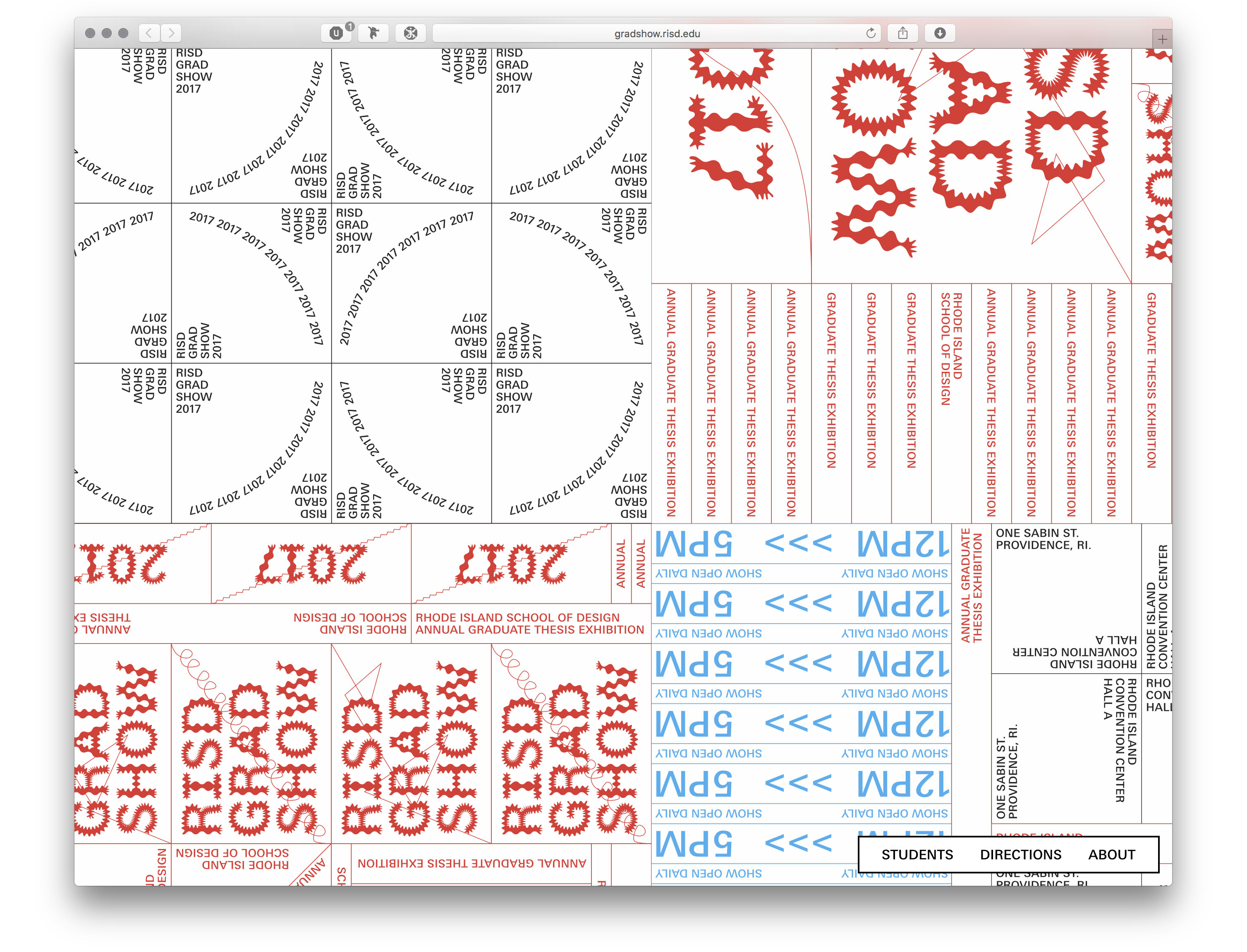 The website for the RISD Grad show 2017 is like an abstract typographic map that just begs to be dragged around and explored. Univers (530) twists and turns, repeating information into the digital infinity. See also the RISD ’16 Senior Show website.