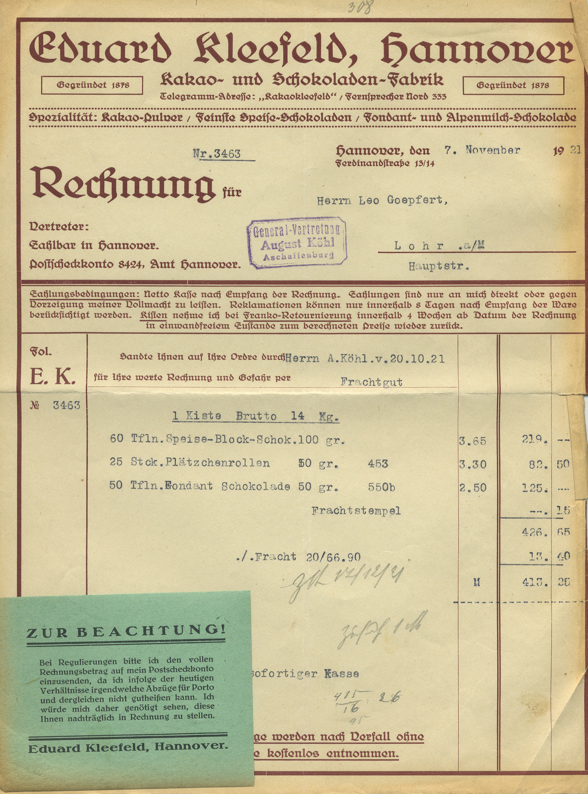 Leo Göpfert had ordered 60 bars of cooking chocolate, 25 rolls of cookies, and 50 bars of fondant chocolate for his shop in Lohr/Main.
