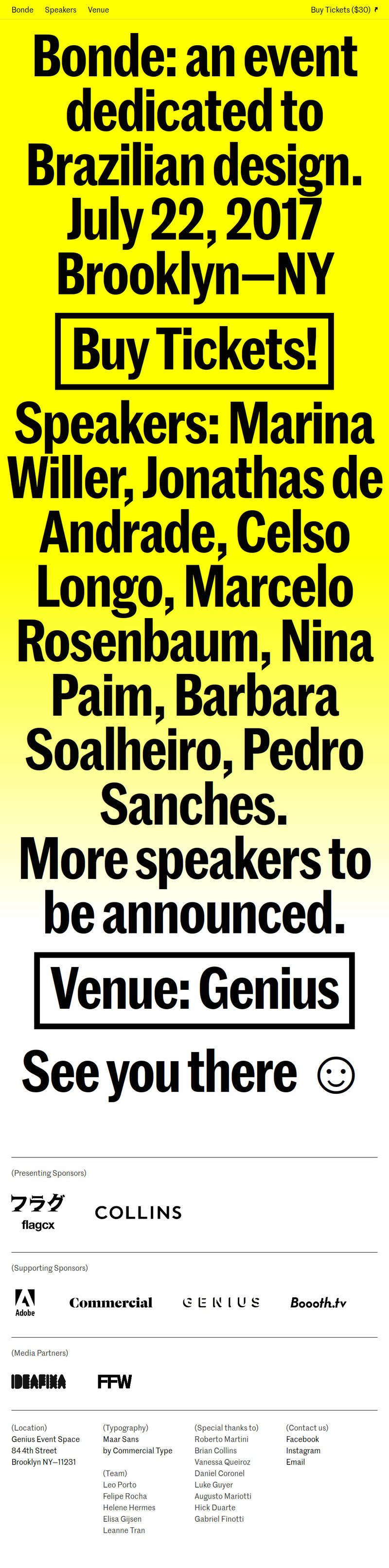Bonde — Brazilian Design Conference 2017 website Contributed by Love Lagerkvist on Jun 2nd, 2017. Artwork published in 2017. Source: www.bonde.nyc License: All Rights Reserved. The website for the 2017 edition of Bonde brings out the best characteristics of Marr Sans. Typefaces More about Marr SansGet Marr Sans Formats Web (5633) Topics Graphic Design (3012) Designers/Agencies Leo Porto (3) Felipe Rocha (3) Helene Hermes (1) Elisa Gijsen (1) Leanne Tran (1) Tagged withyellow (404)gradients (843)web footers (100)conferences (113)design conferences (85)center-aligned text (1912)one typeface, one size (413)type in a box (710)big type (1734) Artwork location Brazil (560) United States (9927) New York City (2916) In SetsRefs (miguel anønimo) (37)colour/type (Matthijs Sluiter) (48)Sans (Lucas Bevilaqua) (185)Exhibition (Lucas Bevilaqua) (374)Web & Type (Juan Ortega) (84) Post a comment Name Email – will not be published Website Your response Submit Comment More Marr Sans in use Architecture on Stage2018PolytechnicContributed by Polytechnic Per B Sundberg (IKEA)2018Malmsten HellbergContributed by Stefania Malmsten Staff Pick Variazioni sul silenzioc. 2020Alessandro AntoniniStefania GalantinoGiorgia GiacominiContributed by CAST Sponsor More in Graphic Design The Inland Printer, Jan 19351935Contributed by Stephen Coles 8 Faces website2012ParavelContributed by Noël Maasdam Kommune/Communec. 2019Chiara SchwarzEric SchwarzContributed by Plain Form LARGO Inc.2024unknownContributed by TypeType More in Web Abercrombie & Fitch website (2016)c. 2016Contributed by Ryan Fernandez Inner Bloom2024GRUND—Creative StudioContributed by NaN Staff Pick Pamipe2022Onmi DesignContributed by TypeType Staff Pick Coppin Dockrayc. 2015Studio ThomasContributed by Studio Thomas More Fonts In Use Battle of Vimy Ridge Visitor Education Centre2017cl designContributed by Production Type Staff Pick Jazzdor 2010 festival posters2010HelmoContributed by Indra Kupferschmid Staff Pick Clip Books of Line Art, Volk (1960)1960Harry Volk Jr. Art StudioPhoto(s) by Bart Solenthaler on Flickr. Staff Pick Grecha2025Polya BoroninaContributed by Polya Boronina Staff Pick