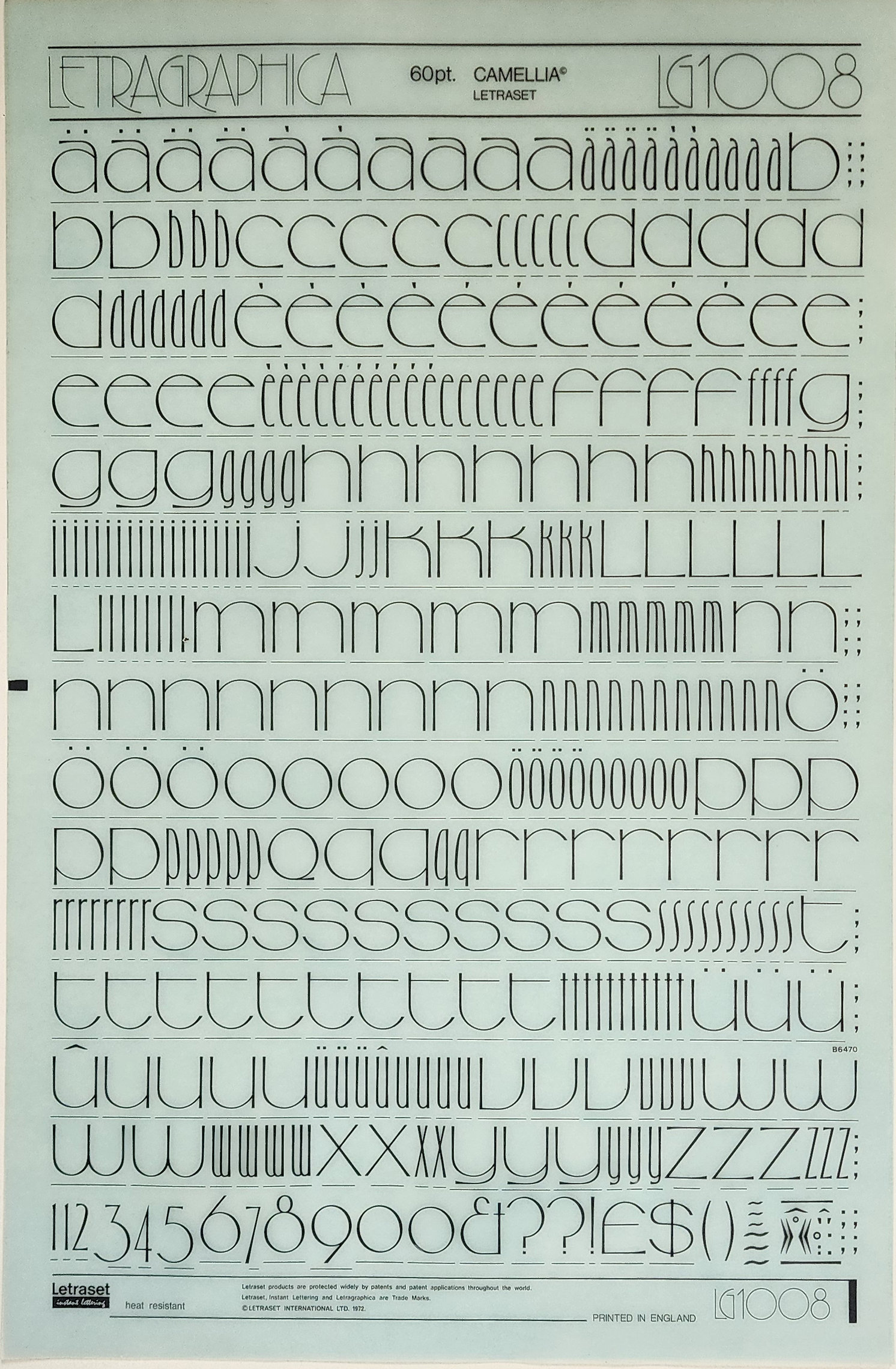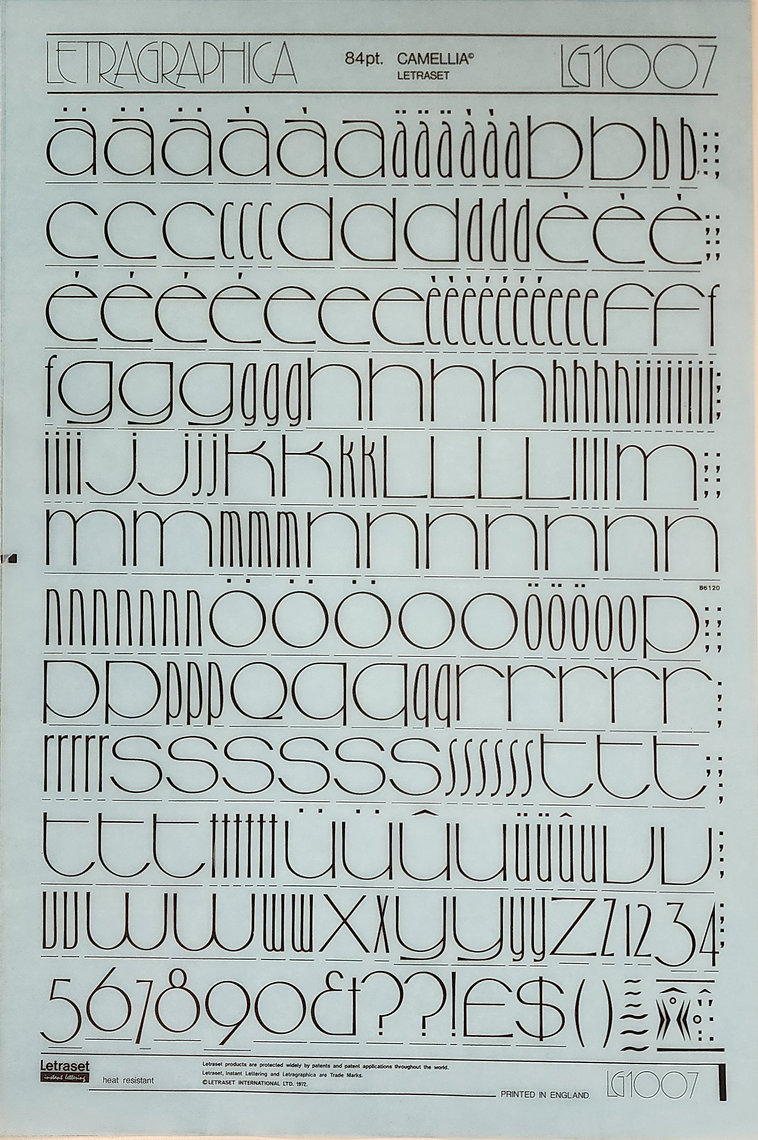 Designer Dave Field of Smart Art chose all-caps Motter Ombra for the cover. On the back, he added a second Letraset release: the track names are composed from Camellia, issued in 1972 in their Letragraphica range. Tony Wenman’s lowercase-only design offers wide and narrow forms for all letters.