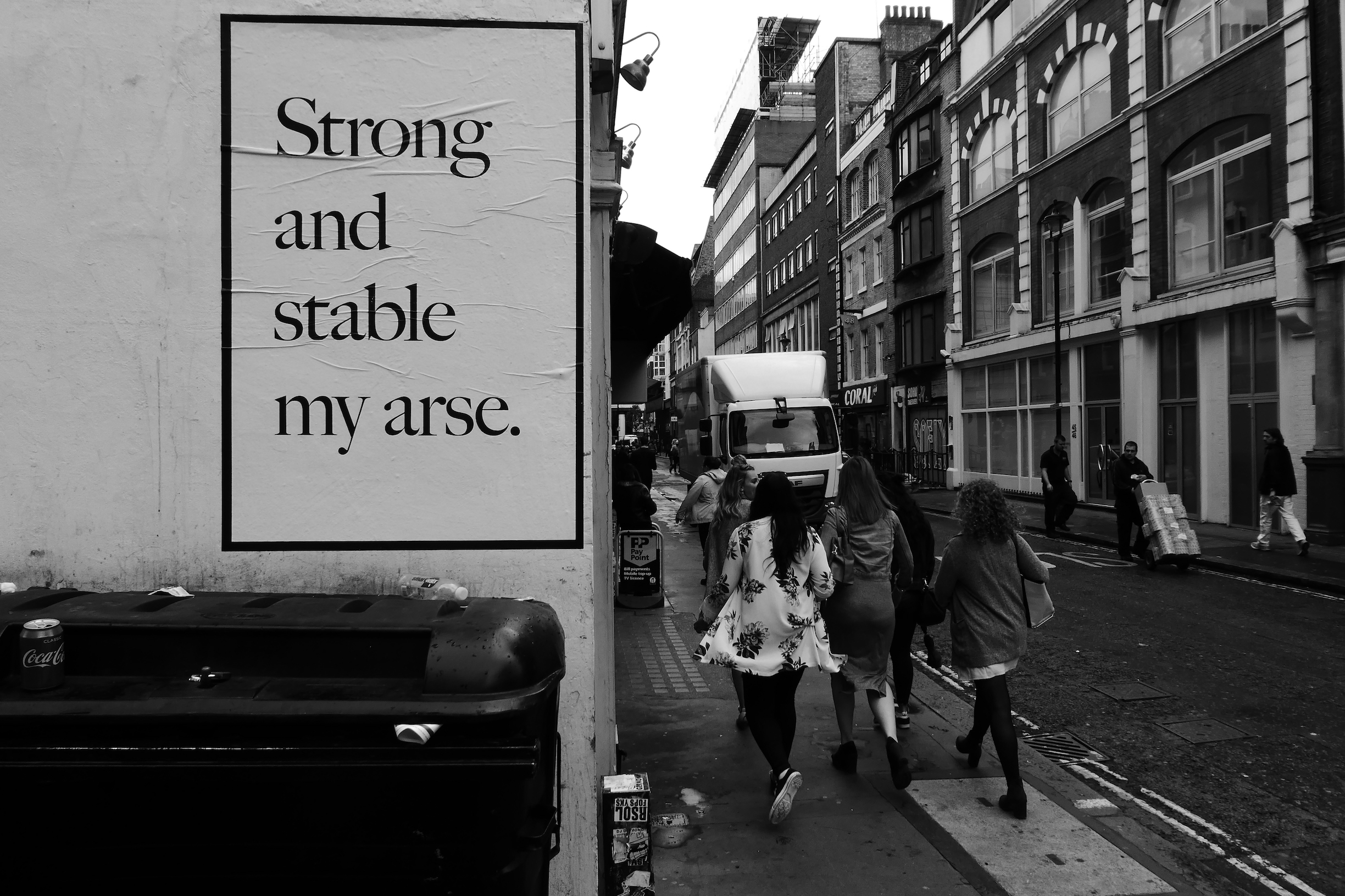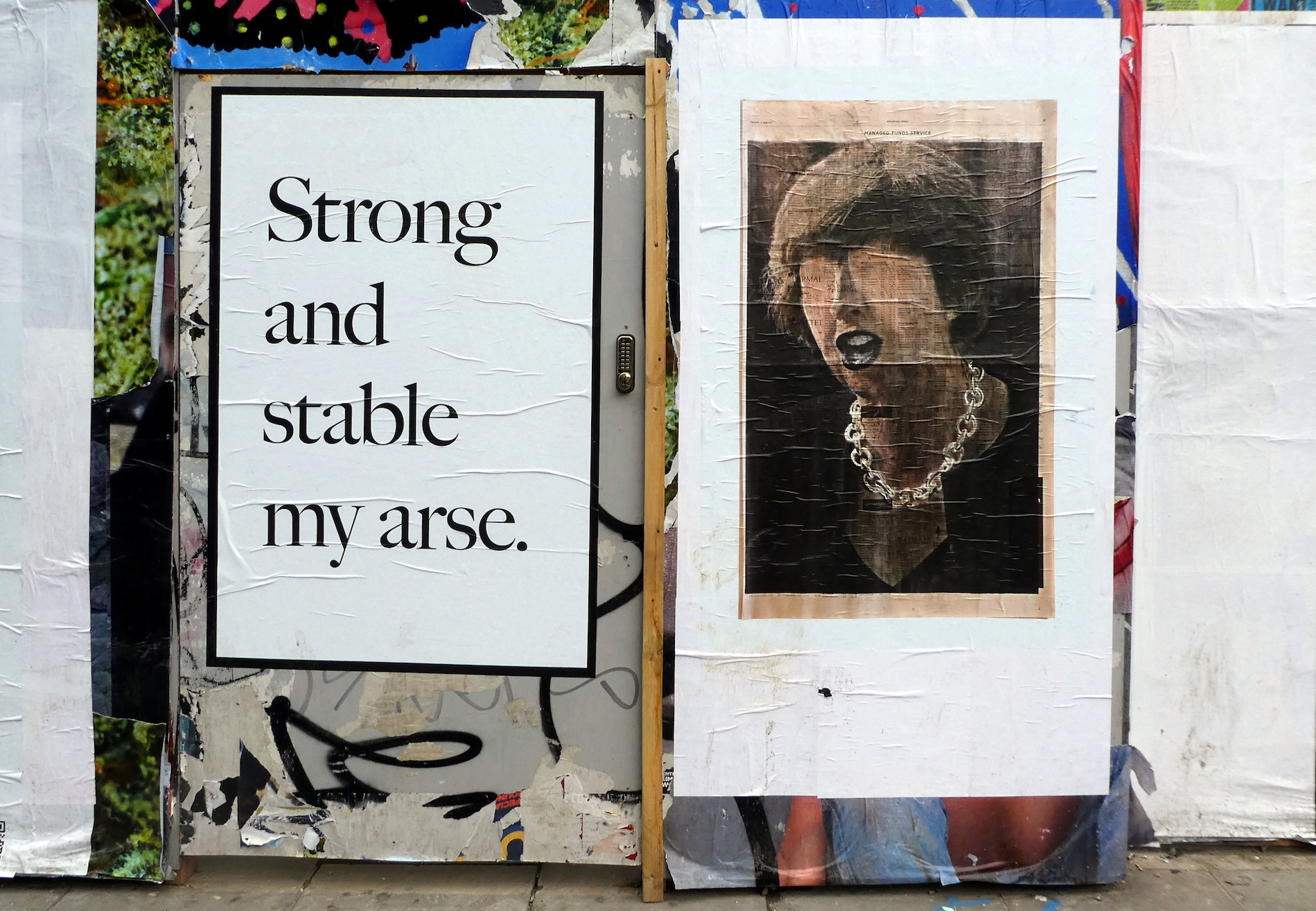Strong and stable my arse. Contributed by Laurence Penney on Jun 4th, 2017. Artwork published in May 2017. Source: www.flickr.com duncan c. License: CC BY-NC. Poster by Jeremy Deller. The words “Strong and stable” refer to the slogan repeated by Theresa May and the Conservative Party during the campaign for the UK general election of June 8, 2017. Strong and Stable My Arse (2017) 1st Edition — poster from flyingleaps Jeremy Deller behind ‘strong and stable my arse’ posters in London — Mark Brown in The Guardian ‘Strong and stable my arse’: how a campaign poster made my house a tourist attraction — Michael Hann in The Guardian Strong and Stable My Arse! — a song by Madeleina Kay Source: www.flickr.com duncan c. License: CC BY-NC. Typefaces More about Big CaslonGet Big Caslon Formats Posters/Flyers (5655) Topics Activism (1093) Politics (843) Designers/Agencies Jeremy Deller (1) Tagged withUK elections (1)elections (39)Conservative Party (UK) (2)Theresa May (2)United Kingdom (35)protest (119)big type (1709)one typeface, one size (408)period (.) (145)public art / street art (120)guerrilla art (4)borders and rules (1092) Artwork location United Kingdom (3241) London (1794) In SetsTrendy Serif (Josep) (49)Serifs (Ryo Wazza) (28)Big Caslon (Peter Bedford) (8) Post a comment Name Email – will not be published Website Your response Submit Comment More Big Caslon in use The Best of Fonts In Use in 20132013Contributed by Stephen Coles Blog ABEMA: Kazuto Ioka vs Martínez, “The Great Revenge”2024ZYLAContributed by ZYLA Radar Radio show by DJ Ausschuss2017Jack KimberleyContributed by WELTKERN® Typefaces Sponsor More in Politics Marxism and the Mass Media by IMMRC (ed.)1980Photo(s) by Philipp Messner on Flickr. Center for Reproductive Rights visual identity2020Isometric StudioContributed by Isometric Studio Refugee Work in the Digital Economy poster seriesc. 2021John Philip SageContributed by Margot Lévêque Typefaces BeHere / 1942: A New Lens on the Japanese American Incarceration2022Folder StudioContributed by 205TF More in Posters/Flyers Yoko Ono – Growing Freedom exhibition and catalogc. 2019PrincipalContributed by Swiss Typefaces Staff Pick Monkey Baa Theatre Co.c. 2023Universal FavouriteContributed by Universal Favourite “Berlin tanzt” campaign2014DONHimmelspachContributed by Florian Hardwig Geldmattie2018Mosterd & coContributed by Matthijs Sluiter More Fonts In Use Khruangbin & Leon Bridges – Texas Sun album art2020Aaron Lowell DentonContributed by Bryson Stohr Staff Pick CSI television seriesc. 2000Contributed by Greg Thompson Staff Pick Andy Warhol Ephemera posters2018Bureau 205Contributed by 205TF Staff Pick Plus magazine, Issue 12019Alex Hunting StudioContributed by Alex Hunting Studio Staff Pick
