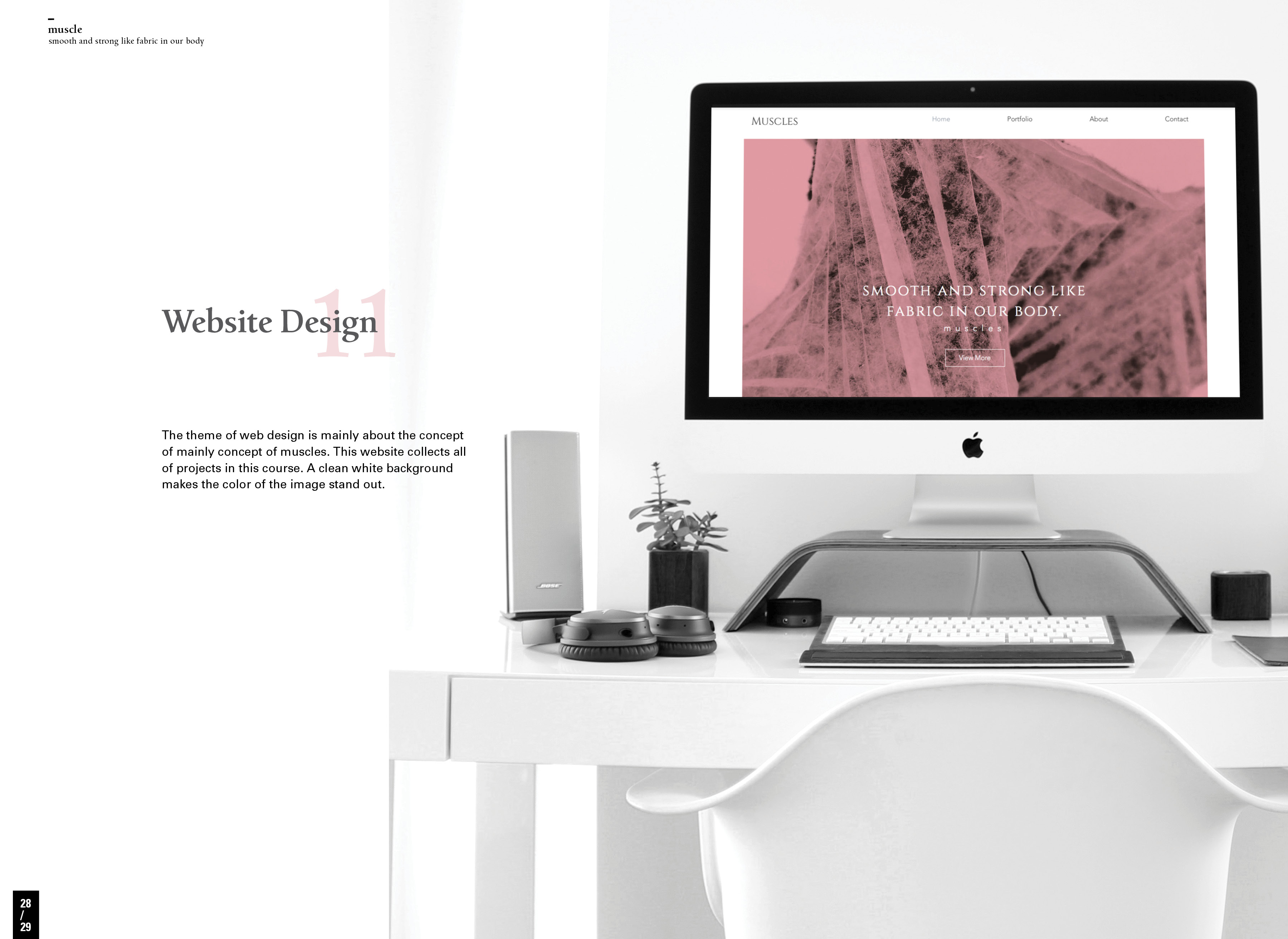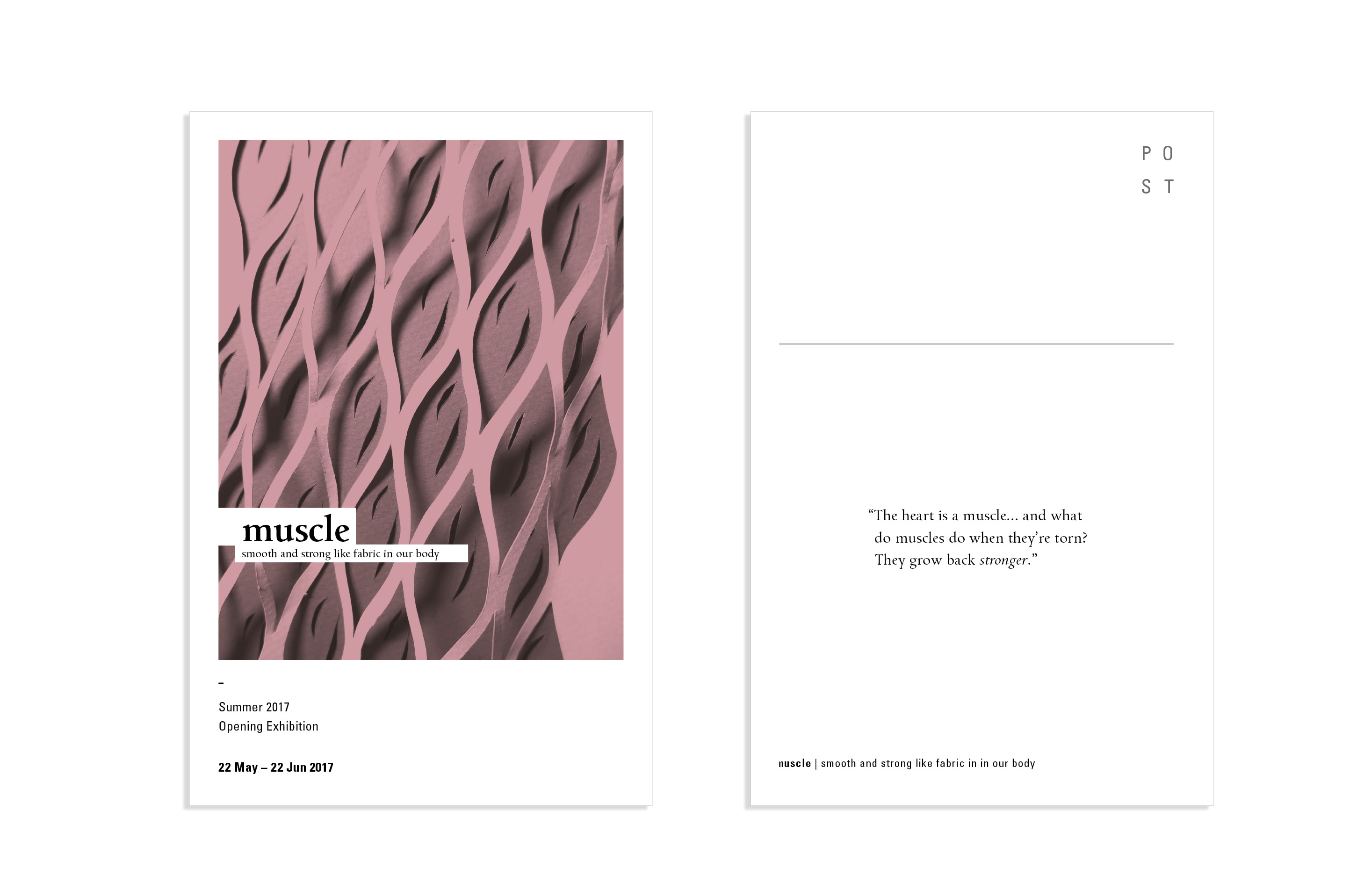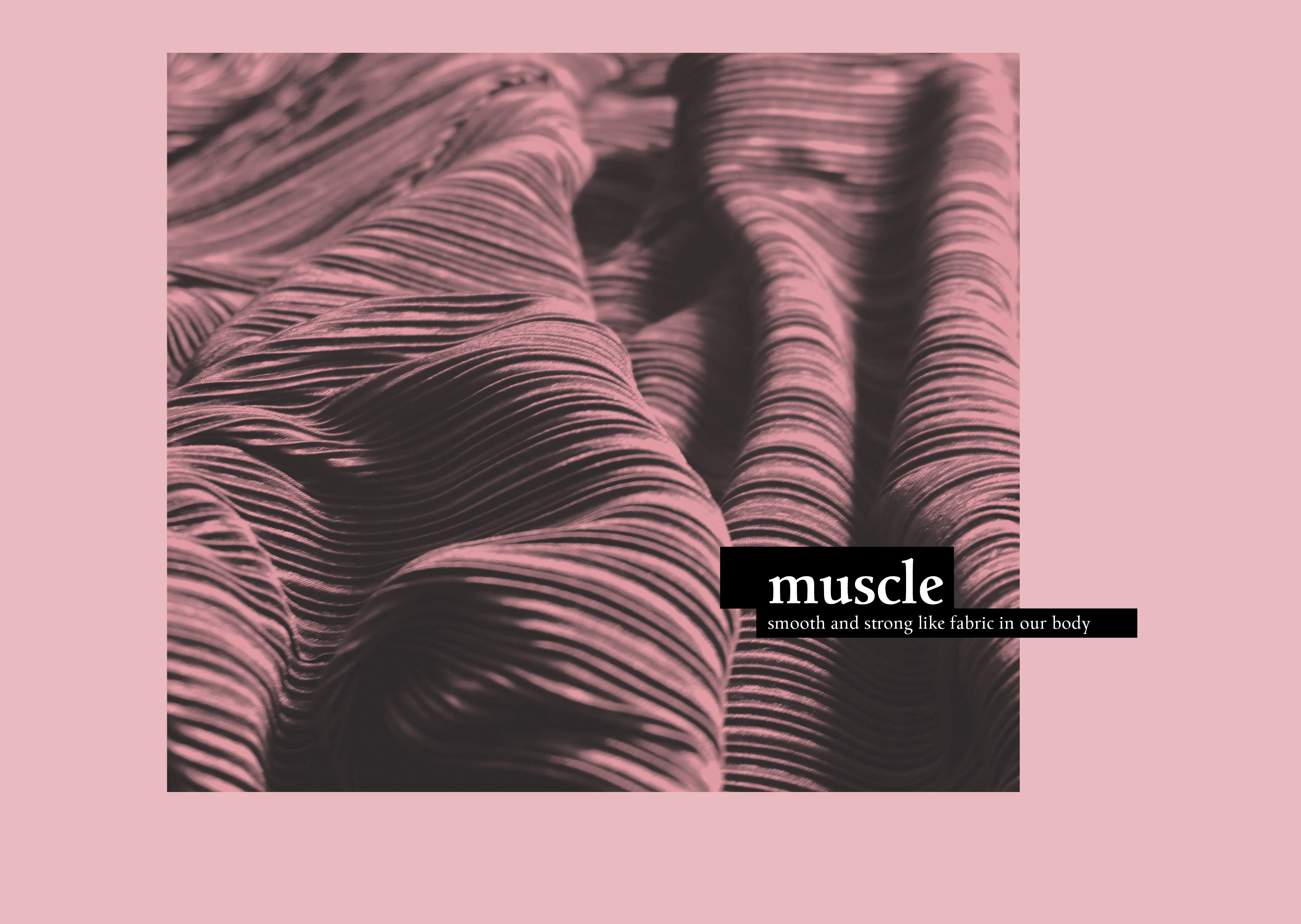 This is a graphic design school project made at the Academy of Art University, San Francisco. The assignment was to focus on a natural phenomenon, i.e. a non-artificial event in the physical sense, and therefore not produced by humans, although it may affect humans. Also eligible as a concept was any human sense or property like vision or taste or skin. I chose muscles because they are smooth and strong like fabric in our body.