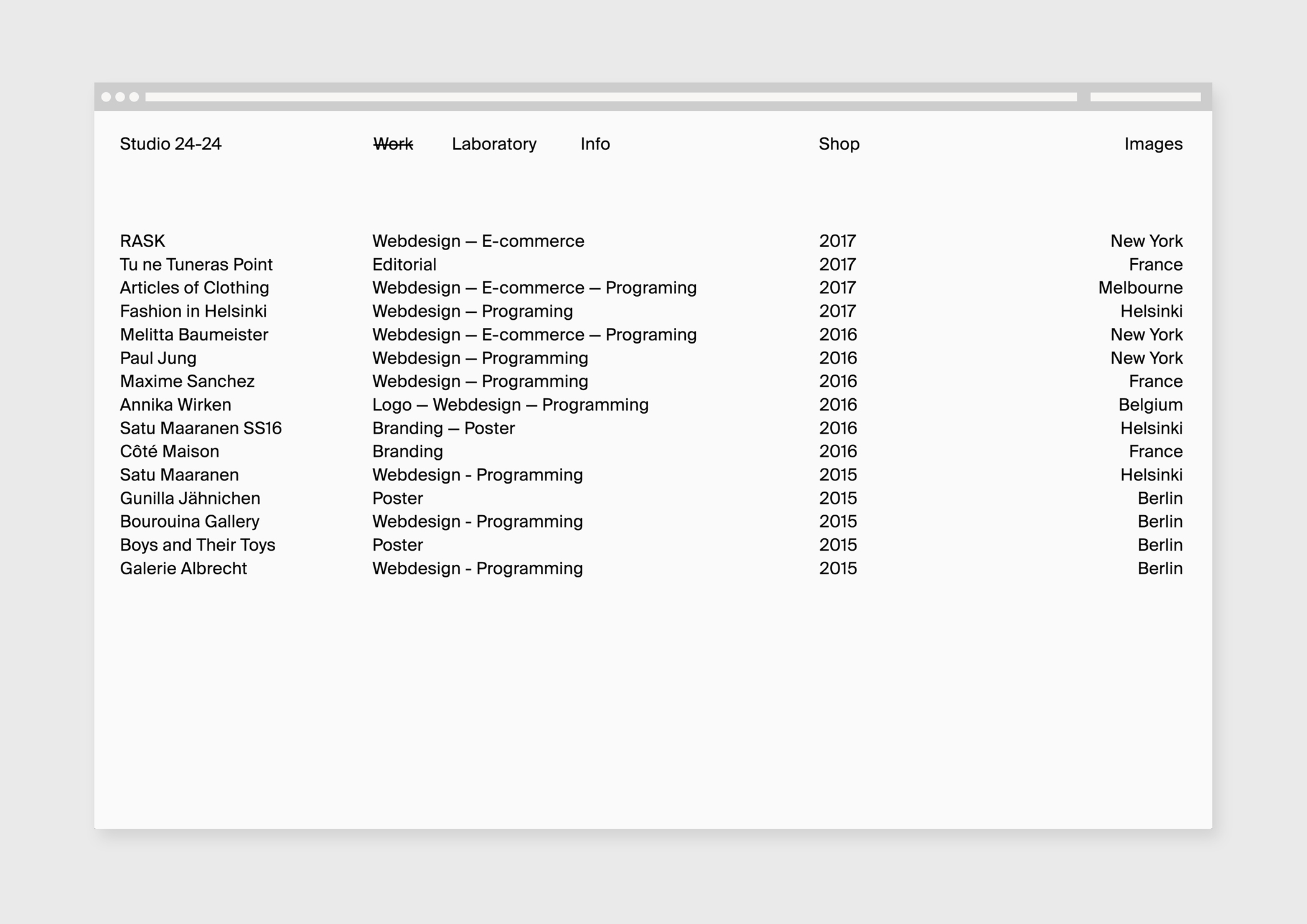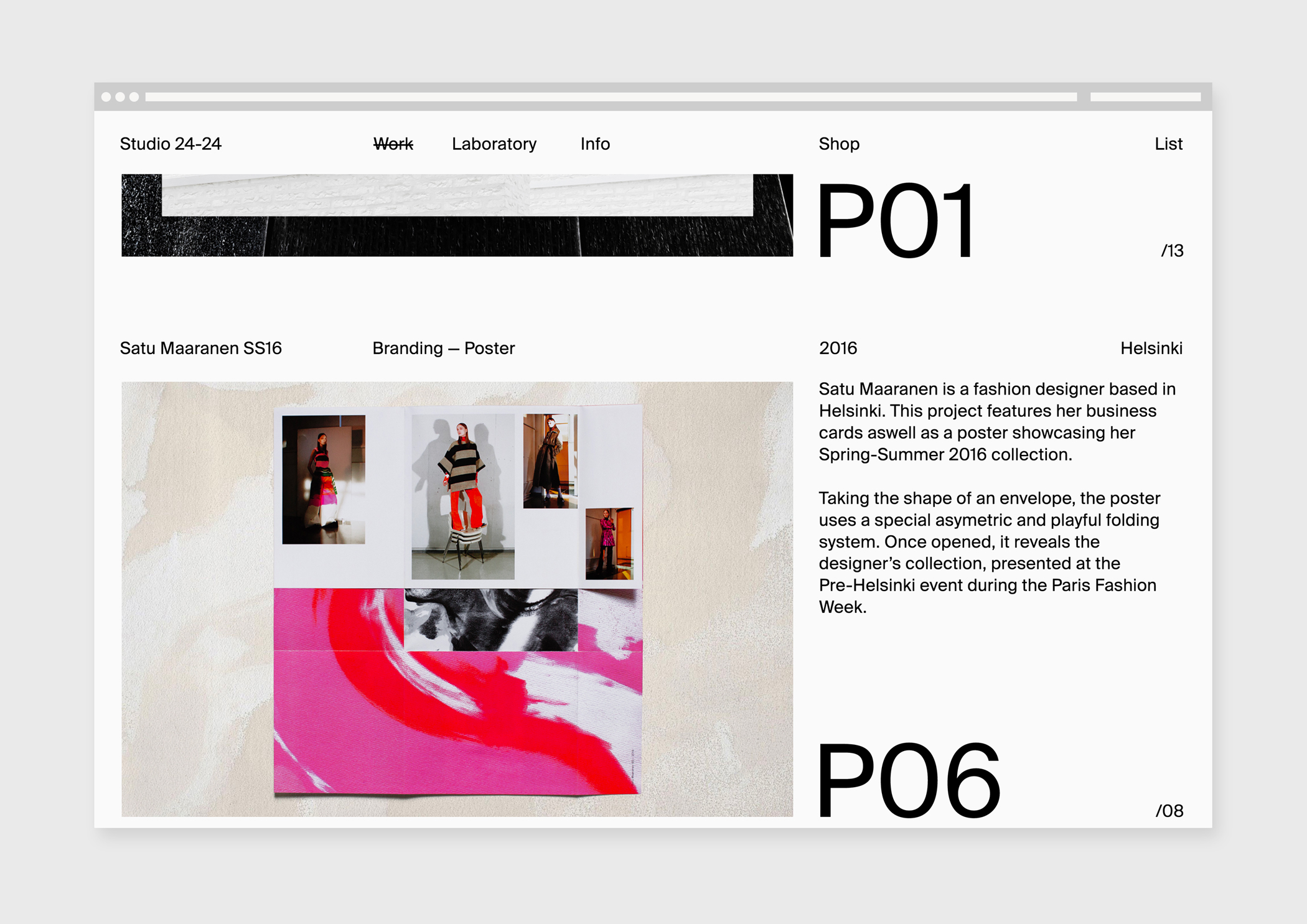 Studio 24/24 Contributed by Swiss Typefaces on Jun 11th, 2017. Artwork published in circa 2015. Source: studio24-24.com Studio 24/24. License: All Rights Reserved. Suisse Int’l in use on the website of Berlin-based Studio 24/24, founded by Antoine Enault + Ondine Vermenot. Source: studio24-24.com Studio 24/24. License: All Rights Reserved. Source: studio24-24.com Studio 24/24. License: All Rights Reserved. Source: studio24-24.com Studio 24/24. License: All Rights Reserved. Source: studio24-24.com Studio 24/24. License: All Rights Reserved. Typefaces More about Suisse Int’lGet Suisse Int’l Formats Web (5557) Branding/Identity (8349) Topics Graphic Design (2980) Designers/Agencies Studio 24/24 (10) Tagged withportfolios (760)websites (3509)minimalist (526)design studios/agencies (490)reversed type (3333)repetition (771) Artwork location Germany (3829) Berlin (1138) In Setssmooth (Karo Konieczna) (524)pf (Karo Konieczna) (61)Genial (Leonel Demetrio) (53)Inspiración (Leonel Demetrio) (49)B&W (Justin Brown) (88) Post a comment Name Email – will not be published Website Your response Submit Comment More Suisse Int’l in use Ada | Isle2018Ali Emre DoğramacıContributed by Ali Emre Doğramacı Sunday Paper, Issue 032017Pseudo FriendsContributed by Ben Nelsen Swiss Federal Institute of Technology Lausanne (EPFL)2021EPFL MediacomContributed by Emphase Swiss Graphic Design Lab. Sponsor More in Graphic Design Milton Glaser Graphic Design monograph (The Overlook Press)1973Milton GlaserContributed by Chris Purcell The GOODList, Curator Series #5 ft. Harry Butt2023The GOODListContributed by Production Type Temple magazine #11, “Made in Japon”2023Temple OfficeMargaux SalarinoAnaïs AlliasContributed by TEMPLE The Penrose Annual, Vol. 41, title page1939Francis MeynellPhoto(s) by mikeyashworth on Flickr. More in Web Balenciaga website (2017)2017Bureau BorscheContributed by Love Lagerkvist Tom Gouldc. 2024GrafikContributed by Nick de Jardine Estée Lauder websitesc. 2015Rivington Design HouseContributed by Florian Hardwig Staff Pick WhoMadeWho – Through the Walls album art2017Bureau BorscheContributed by Balder D. Dysthe Staff Pick More Fonts In Use Lampa festival 10th anniversary2024Dārta ApsīteValters KalsersContributed by Edgar Walthert Staff Pick Topographie(s) Artificielle(s)2021République StudioContributed by République Studio Staff Pick Joray Fruit RollsContributed by Nick Sherman Staff Pick Monotype advertisement in Offset 7 (1926)1926BauhausContributed by Dan Reynolds Staff Pick