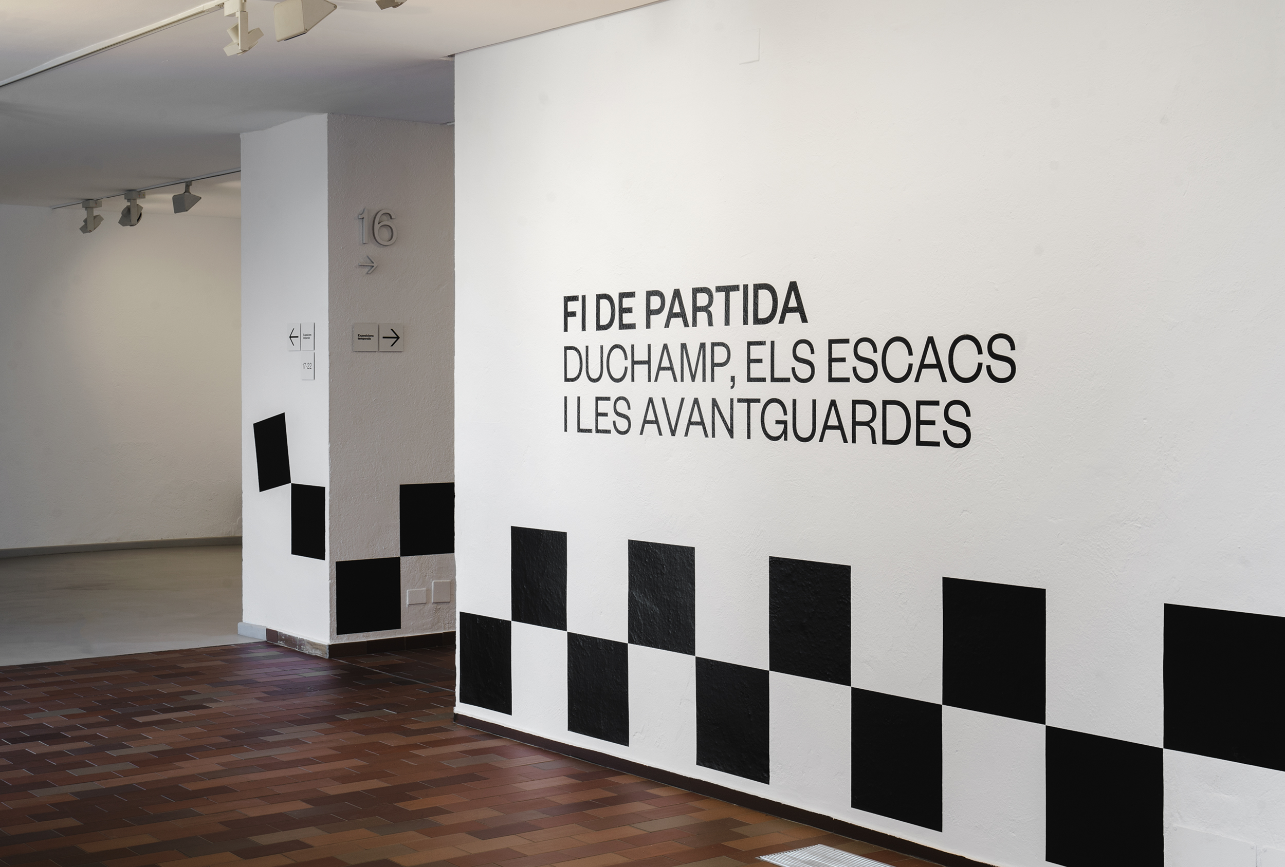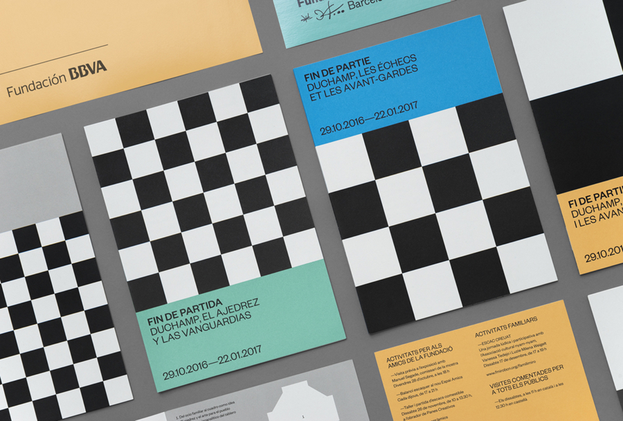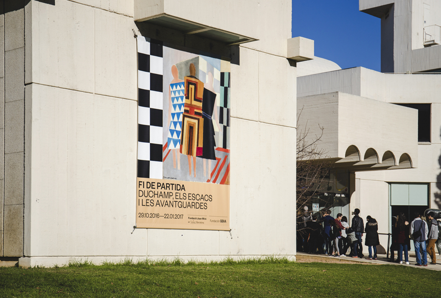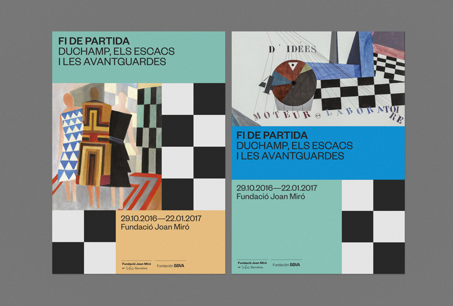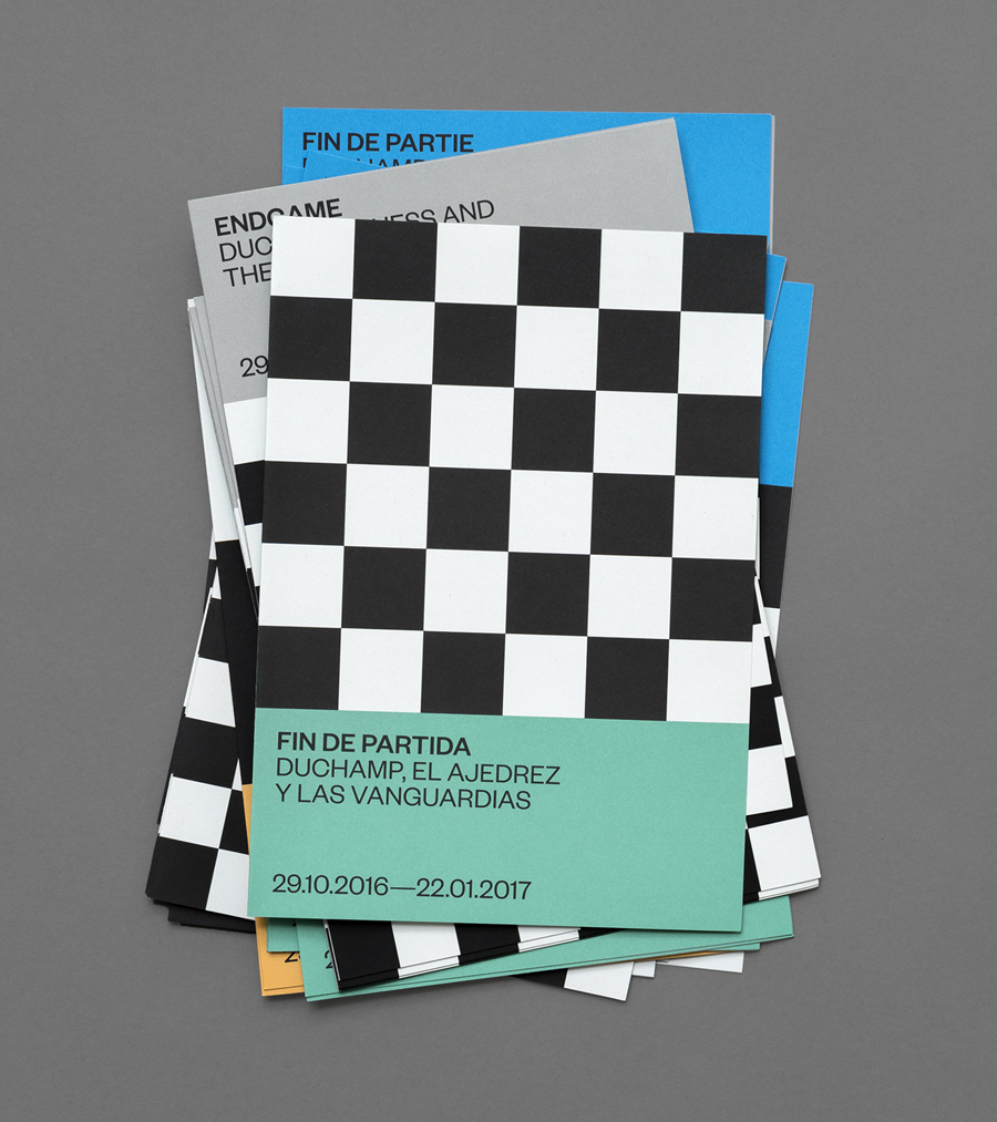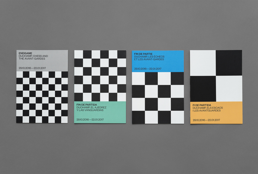 Endgame: Duchamp, Chess, and the Avant-Garde was a temporary exhibition that took place at Barcelona’s Fundació Joan Miró between October 2016 and January 2017. It was curated by Manuel Segade, explored the history of modern art through the lens of its relationship to chess, and featured a variety of works by 20th century artist. These included Marcel Duchamp’s La Partie d’échecs, Max Ernst’s Chess Set, and Mercè Rodoreda’s Untitled (Composition IX), amongst many others. Fundació Joan Miró commissioned Spanish graphic design studio Hey to develop a visual identity for the exhibition. This linked a variety of printed materials, from large format posters, banners and indoor signage to opening night invitations and a programme set in four languages.