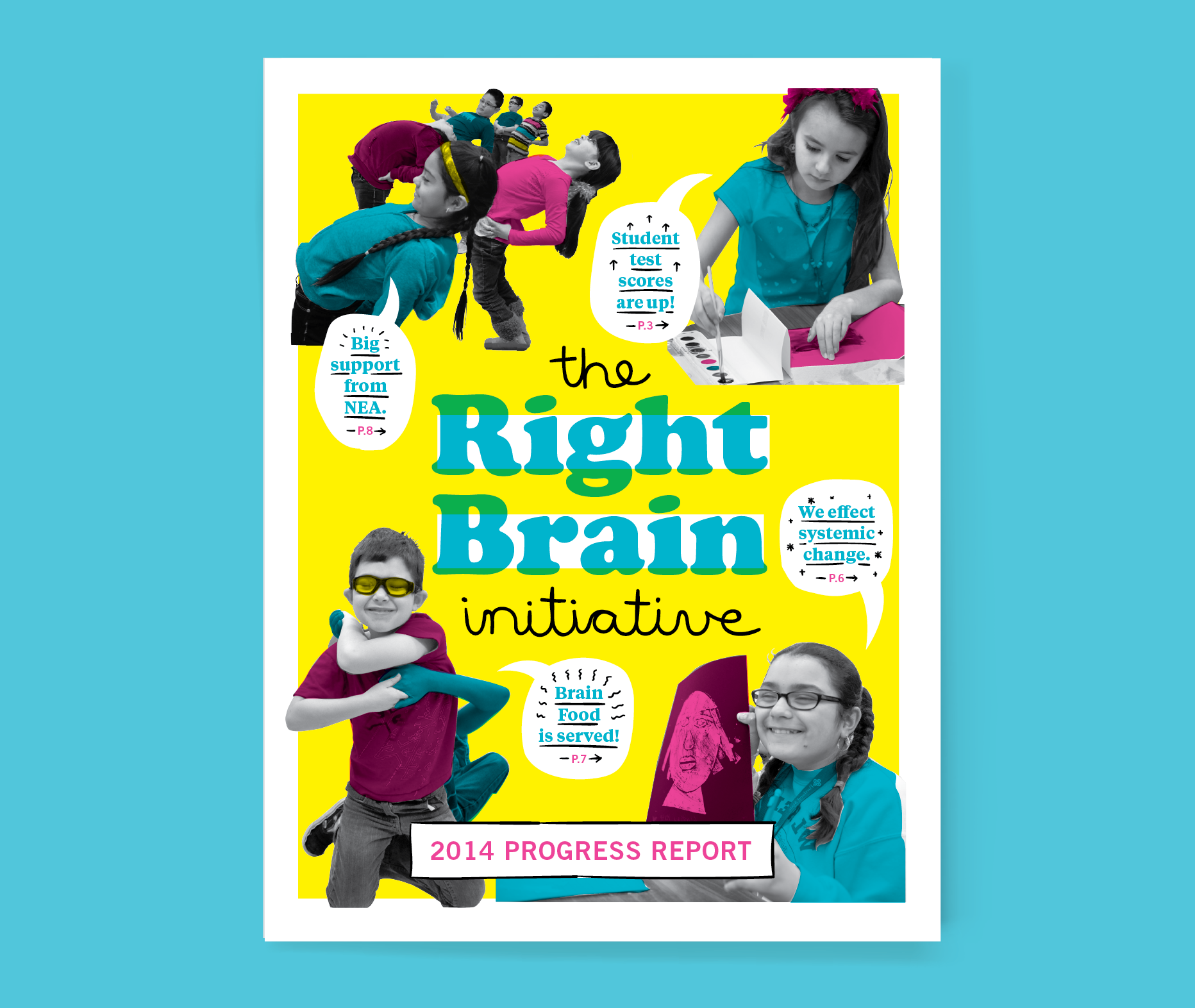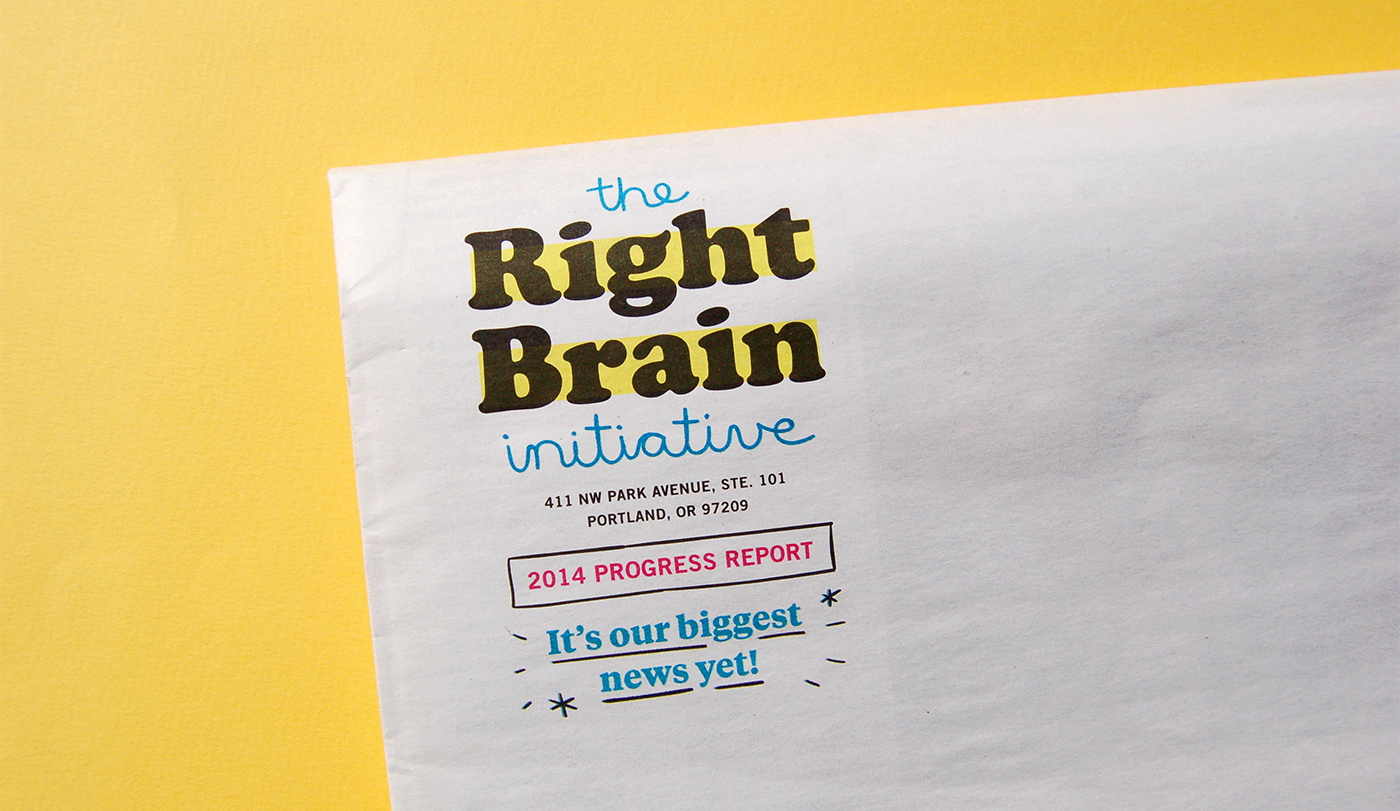 Constructing an annual editorial report for the Right Brain Initiative meant activating both sides of the brain. It takes some serious lifting from the left side to distill complex data into clear and compelling infographics, while playful hand-drawn, hand-cut elements and an energetic color palette come straight out of the right. The mix of editorial Tiempos, sturdy Trade Gothic and Cooper Bold may seem funky, but here it works.