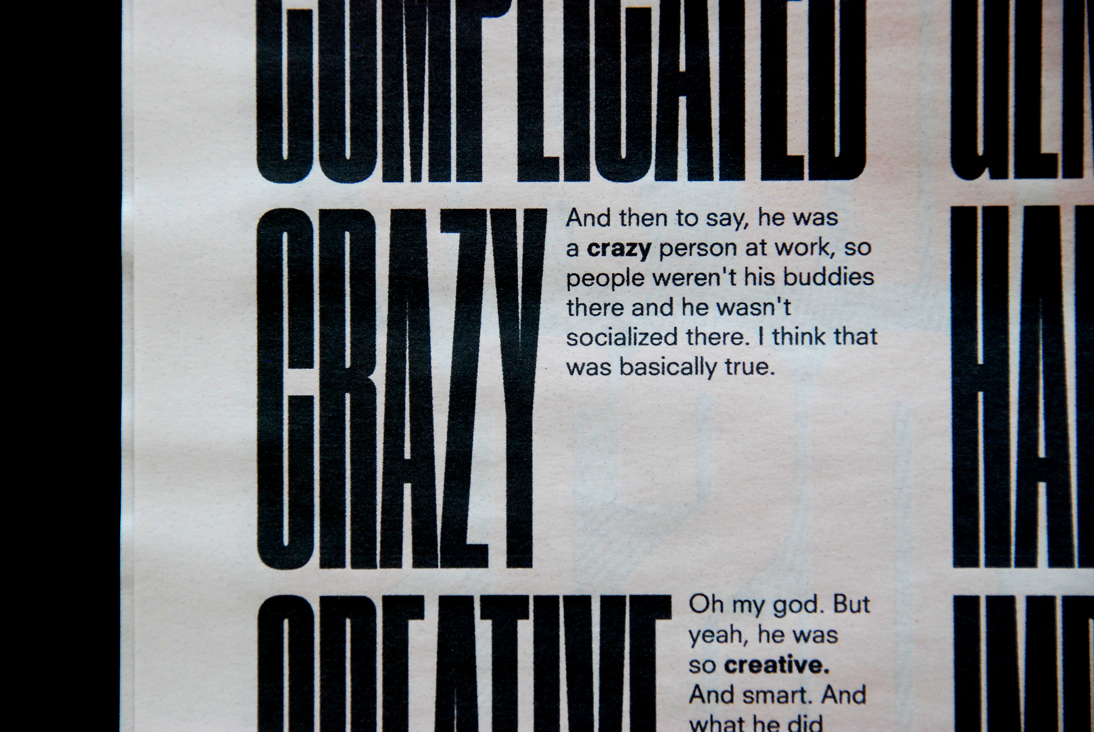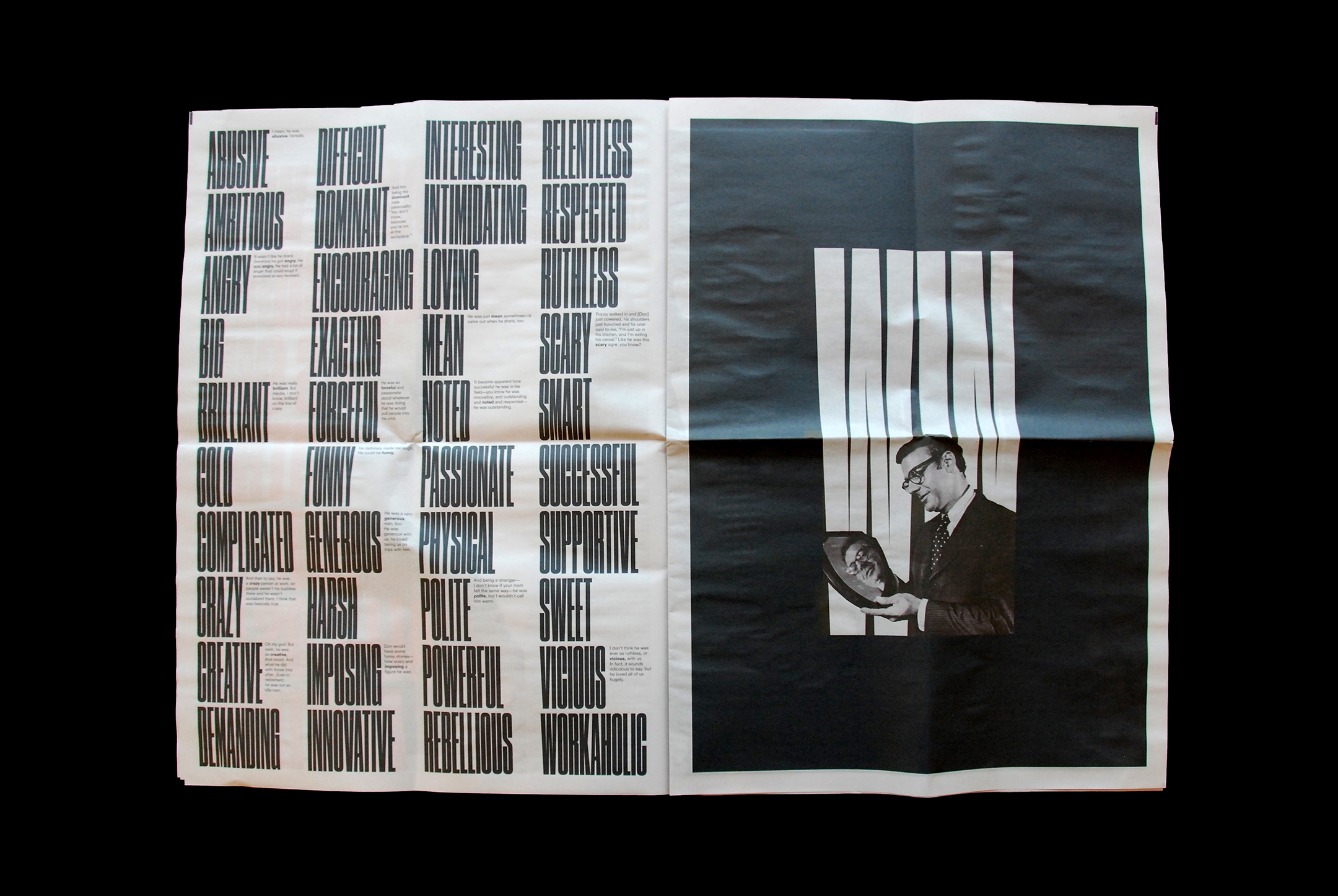 The rich typographic palette is consistent across the three pieces, though each adopts a different visual system according to the tone of its content. The newspaper makes special use of the extremity of Berton Hasebe’s Druk Super Condensed to portray its brash, swaggering content, especially in a full-spread section that compiles every word used to describe Win in the extensive interviews throughout the project. Commercial Type’s Publico Text is used for the body of the newspaper as a workhorse news face.