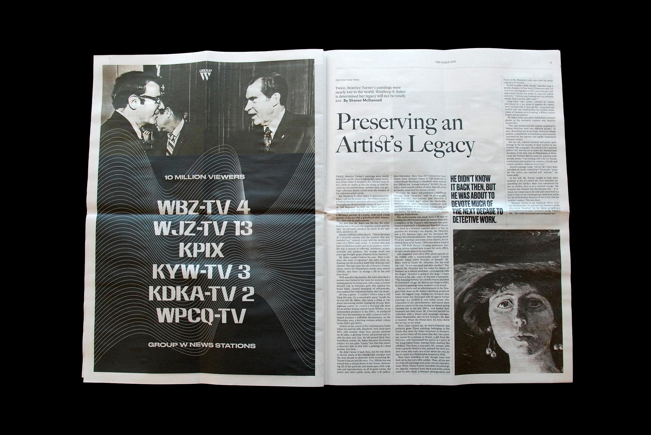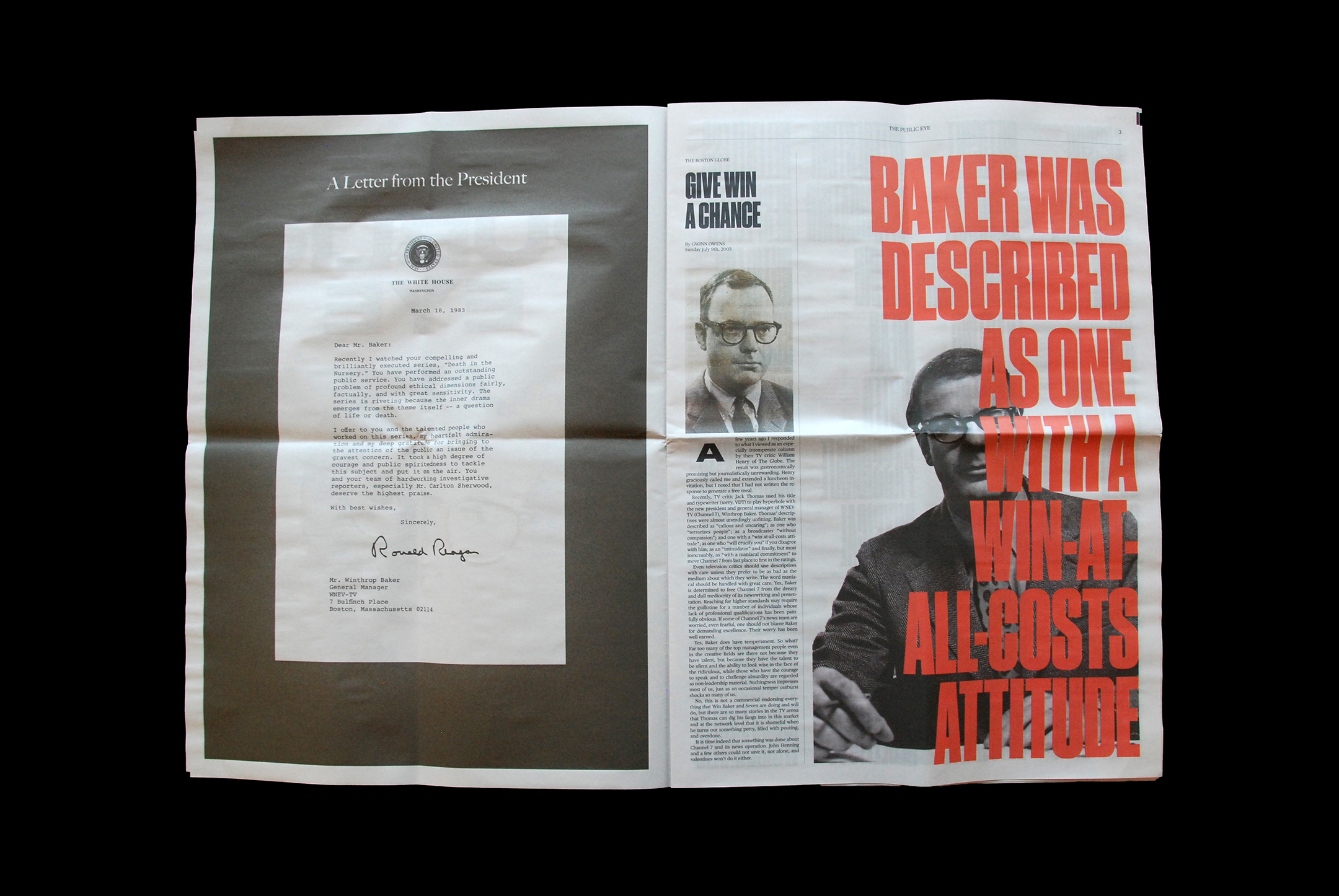 The Public Eye is one piece of a three-piece undergraduate thesis project called “Win: Reconciling a Legacy”. The project takes the form of a printed archive that investigates the life of a polarizing executive in the world of 1980’s Broadcasting, who was also a polarizing figure within the designer’s own family: his grandfather, Win.