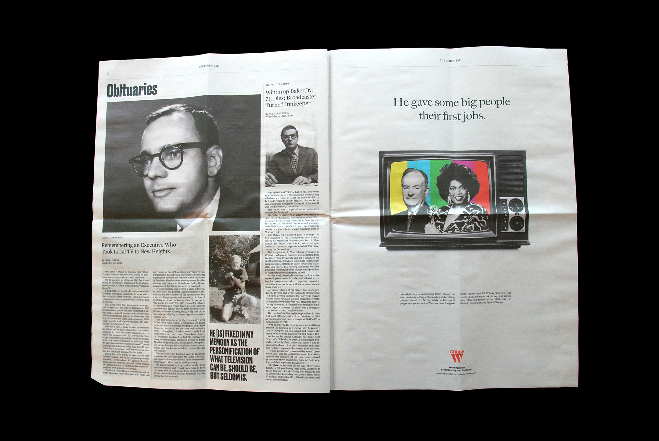 The Public Eye focuses on a specific piece of that legacy: instead of family records or stories, the content is all from newspapers of the time that published editorials, photos, and obituaries for Win, especially during his time as the President of Westinghouse Broadcasting. The design references the visual language of advertising, magazines and television at the time. It captures the achievements of a man, but also shows the values of men of the time, whose careers and achievements were especially important to their self-image.