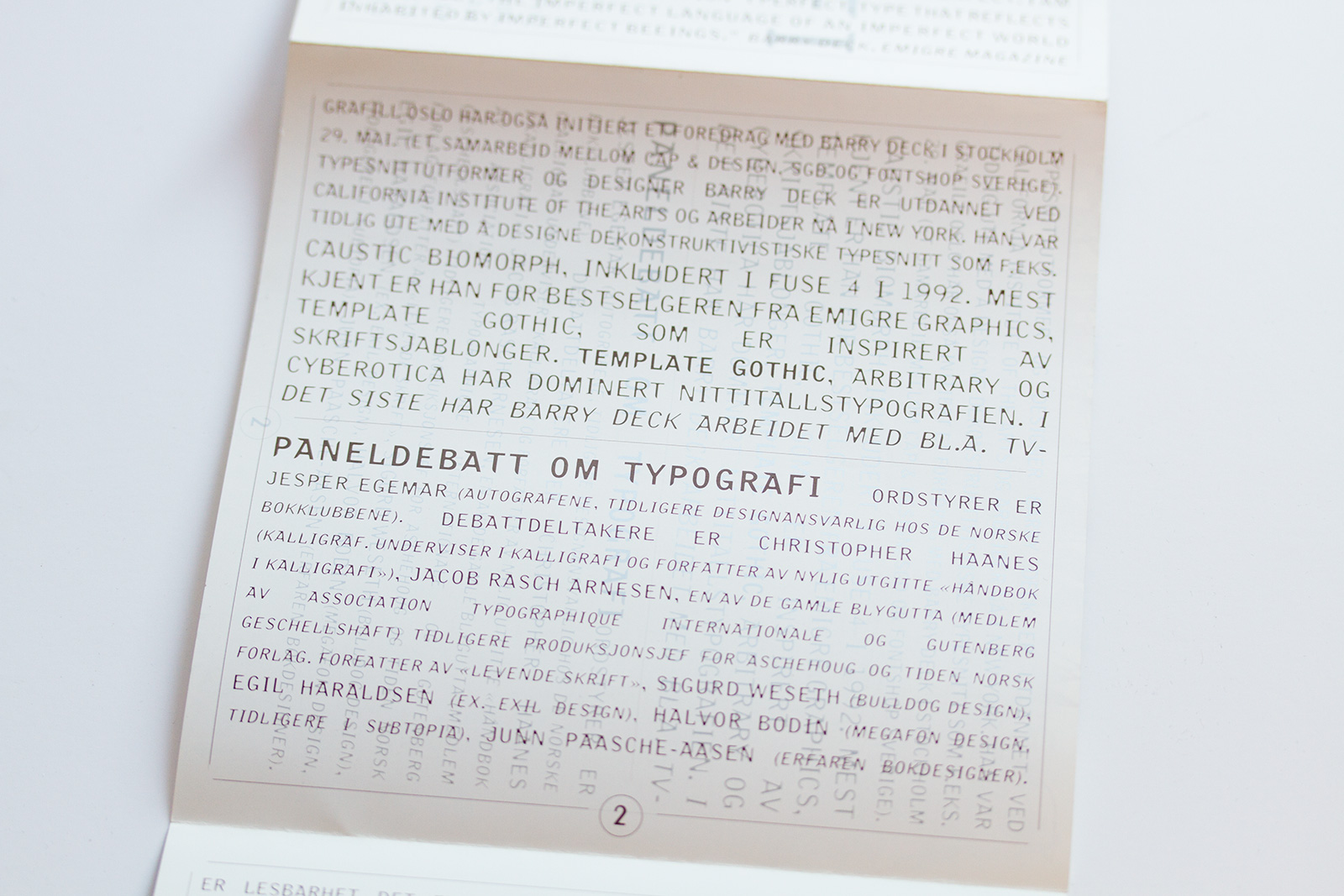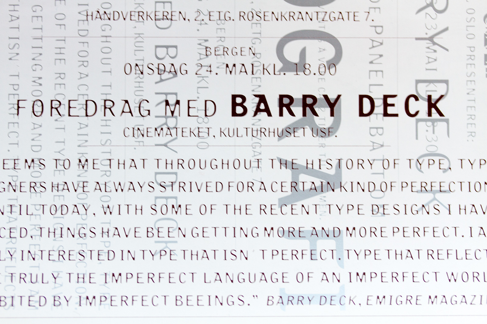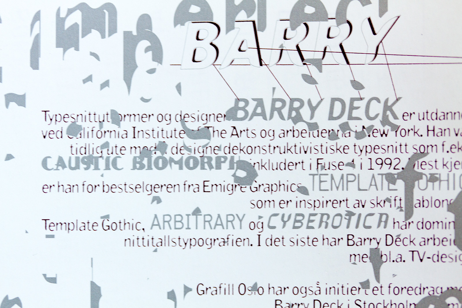 … invited Barry Deck while at the board of Grafill Oslo. In addition to the lecture in Oslo and Bergen we initiated a lecture in Stockholm in collaboration with Cap&Design, SGD and Fontshop Sweden. In the aftermath an interview with Barry Deck was the cover story for Cap&Design with the legendary capture: “Designers hinner inte med sex”.