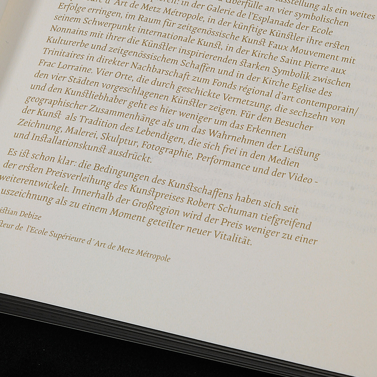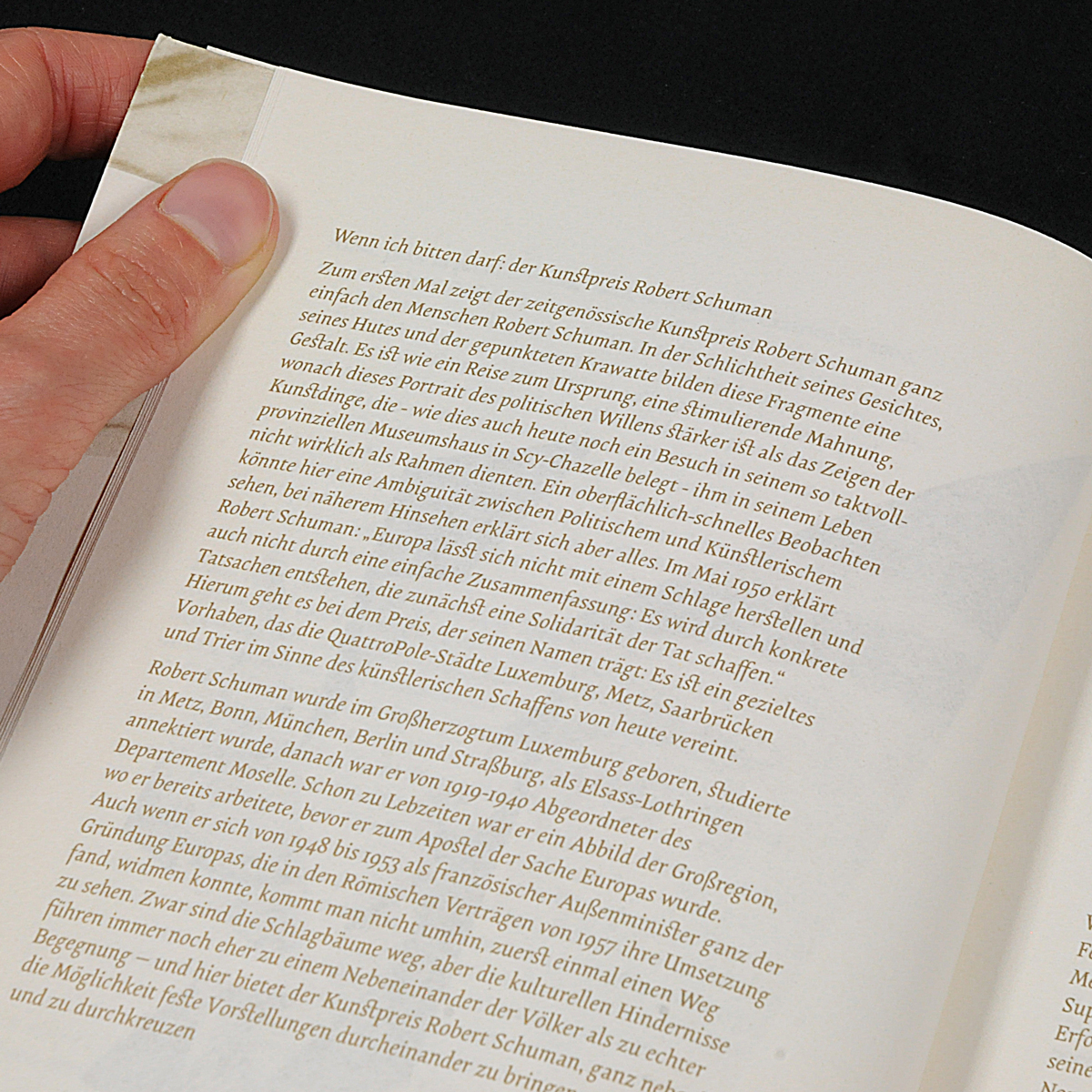 Since 1991, the cities of Luxembourg, Metz, Saarbrücken and Trier have awarded the Robert Schuman Art Prize. Each city appoints an expert to select four visual artists. Jérome Knebusch, for the 2009 edition, chose the Stockmar typeface, designed by Matthieu Cortat.