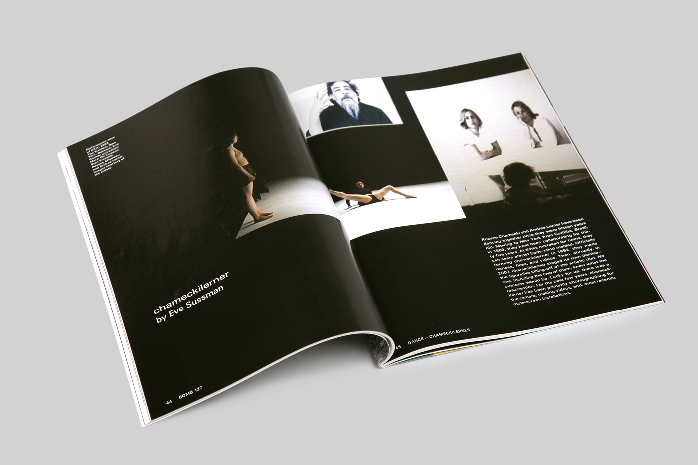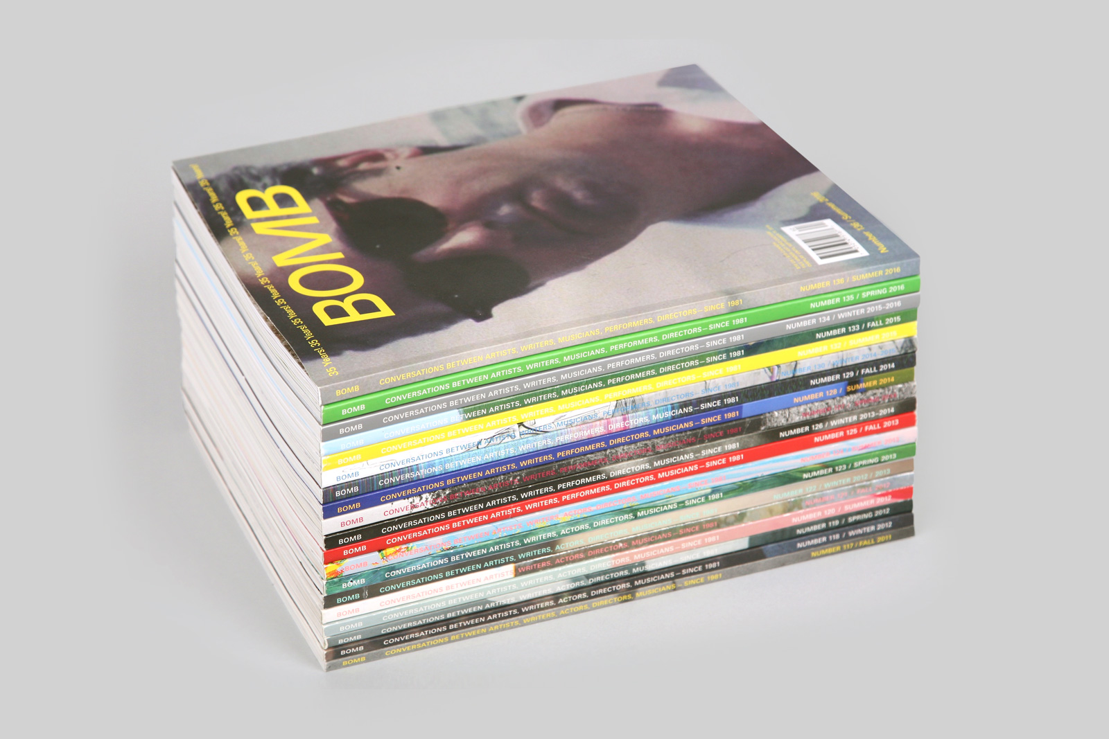 Before we started designing BOMB magazine, we went to the office to research its history. The archive we found was like a fossil record of graphic design evolution; spanning three decades, BOMB’s mutation of style was redefined by successive strata of designers. Magazines, perhaps more than most forms of design, indicate a precise history of graphic innovation because publishing cycles catch the micro-trends of the moment.