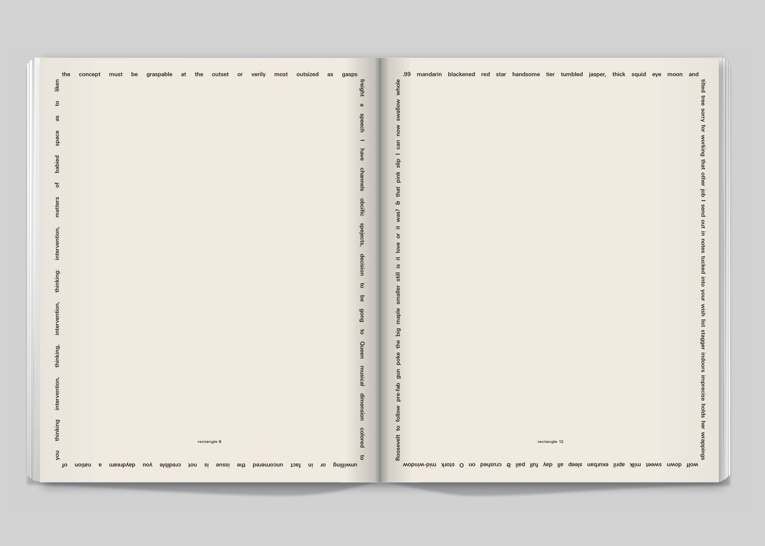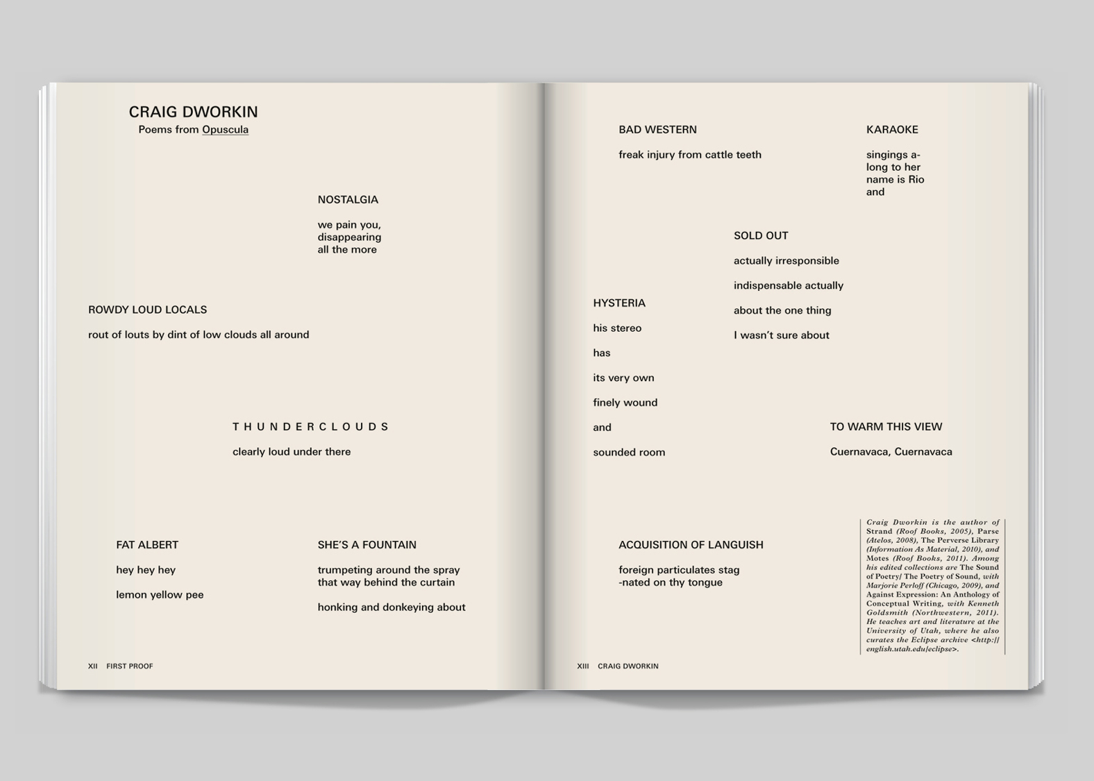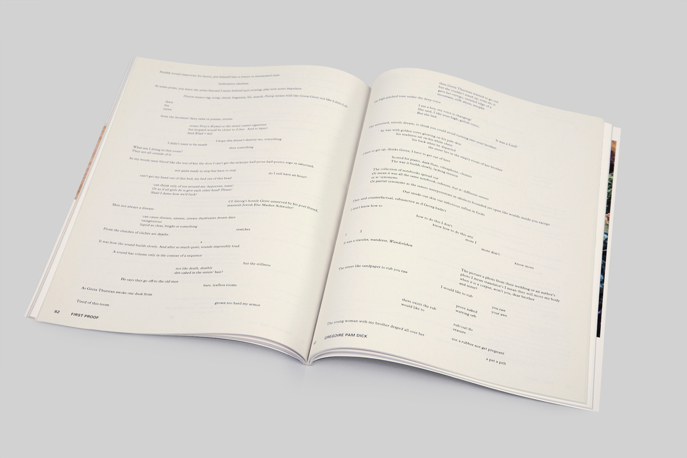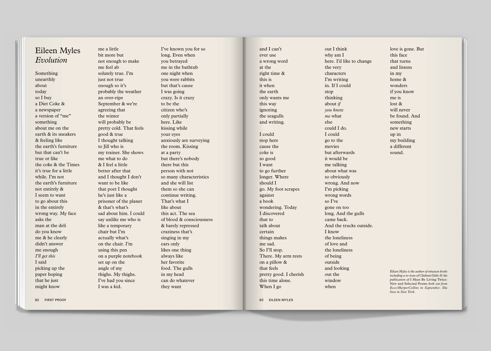 Our favorite section in the magazine is First Proof, BOMB’s literature and poetry supplement. To contrast this with the glossy white pages of the Art section, we used a rough newsprint-like stock. Also, we introduced a serif type [Plantin] to put the reader in a slightly different frame of mind. The design is less edgy, and has a slightly more old-fashioned spirit.