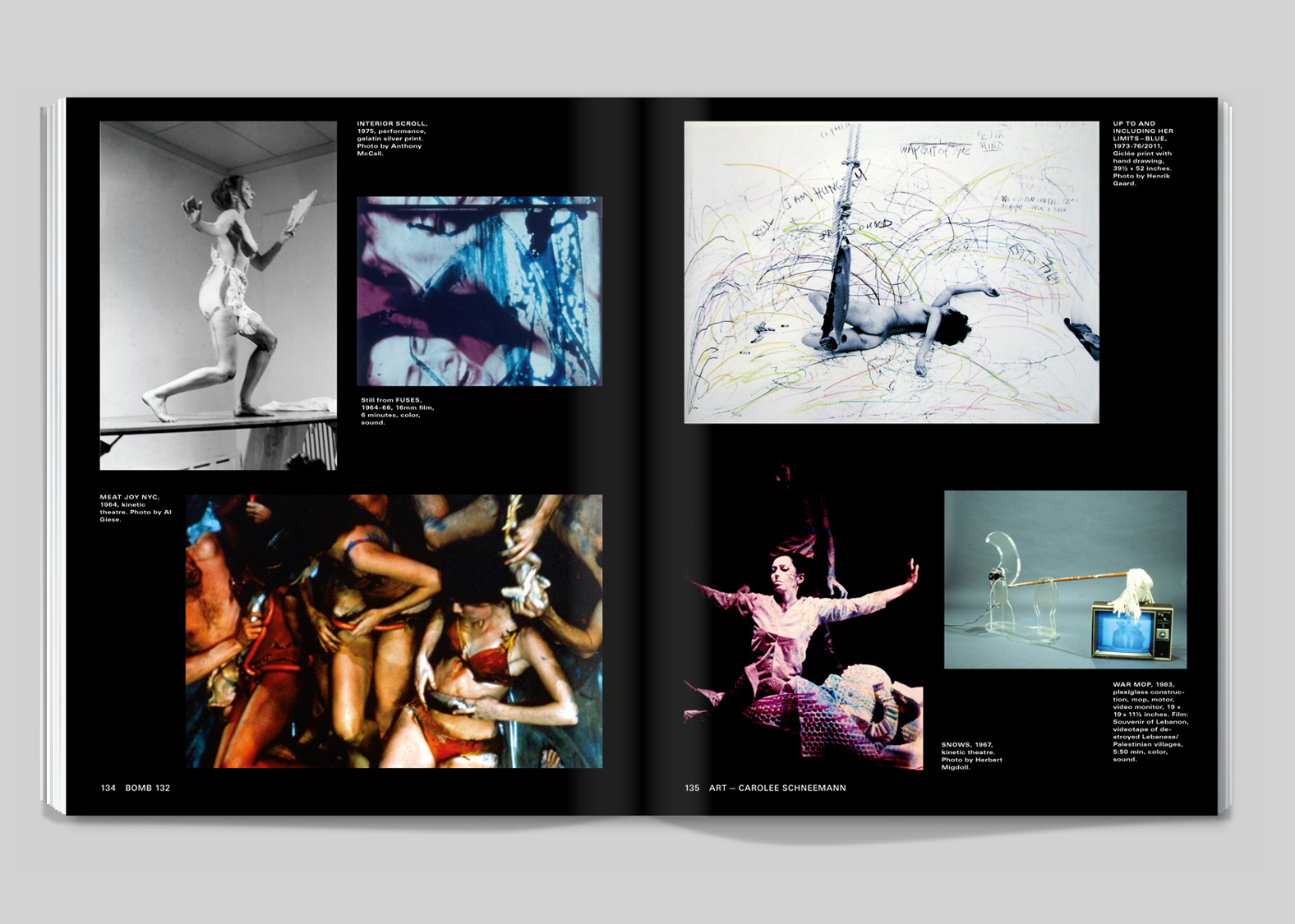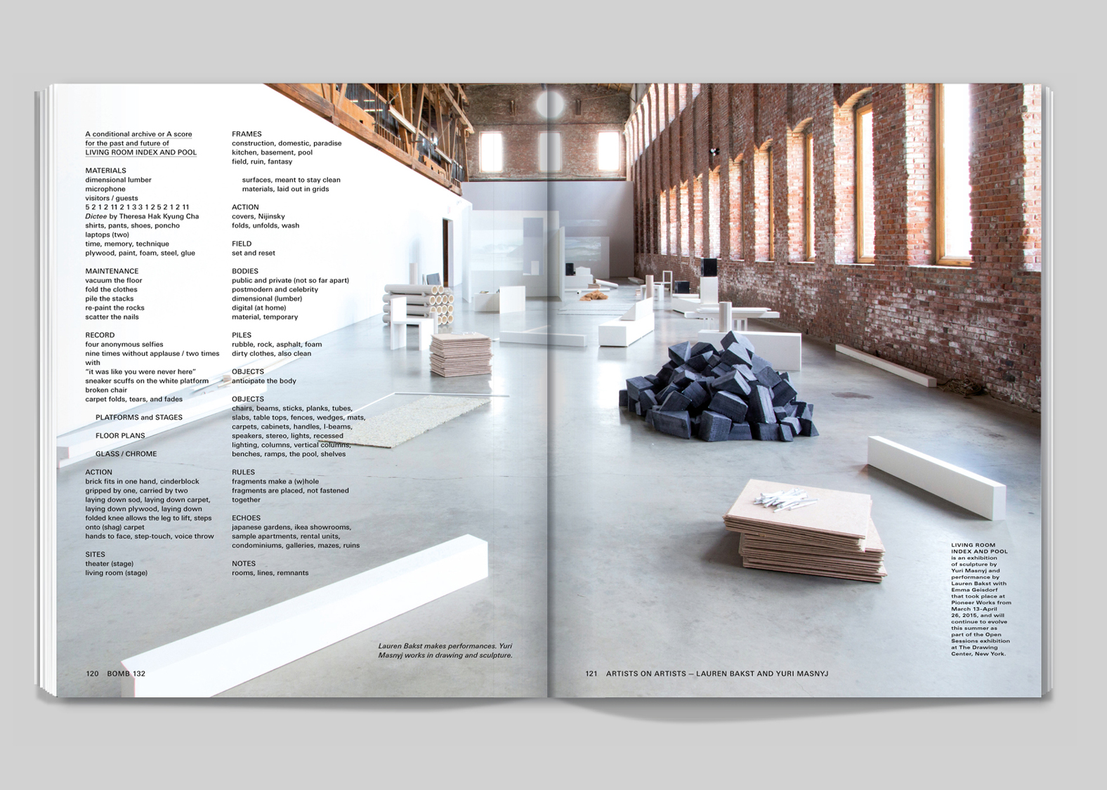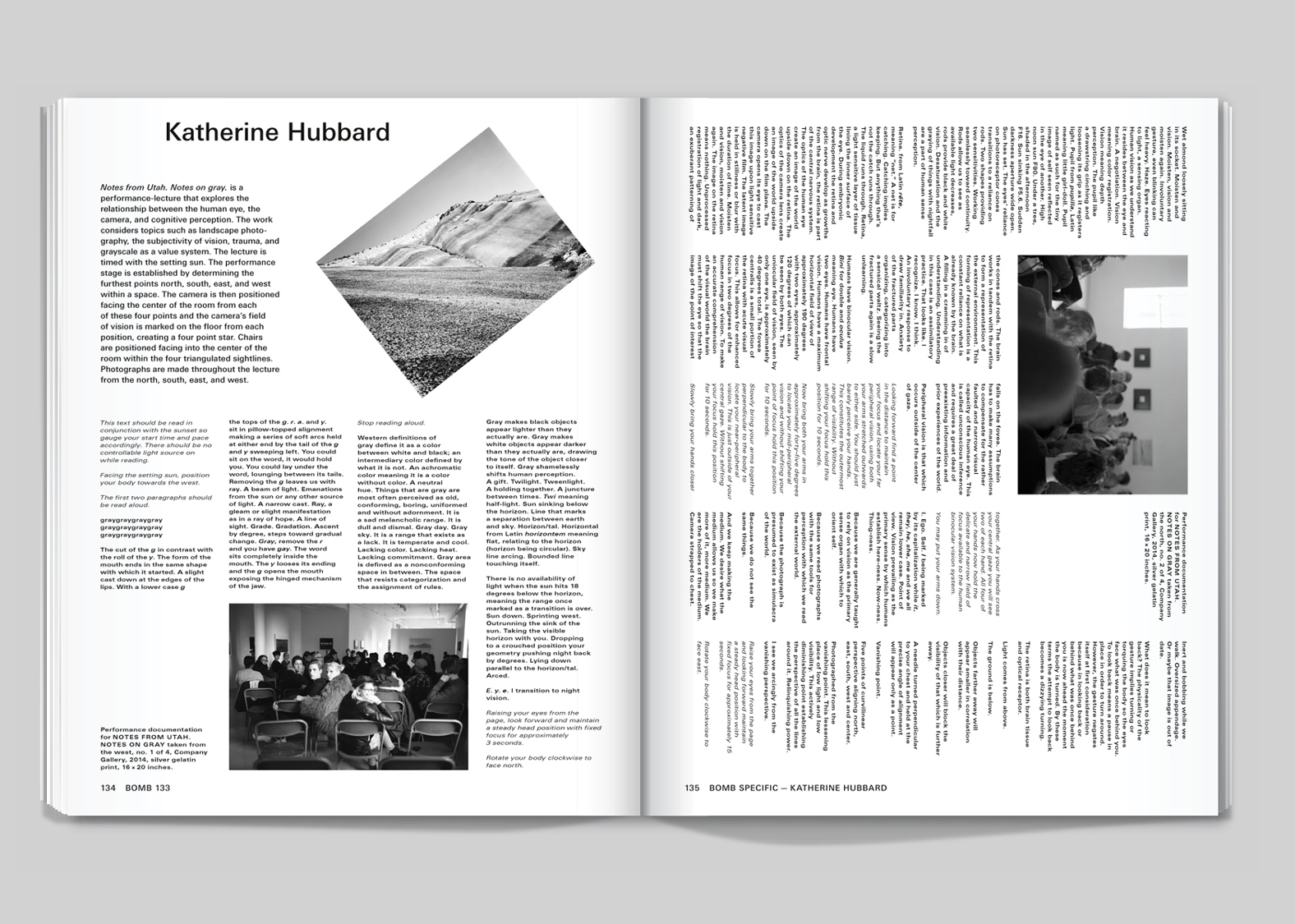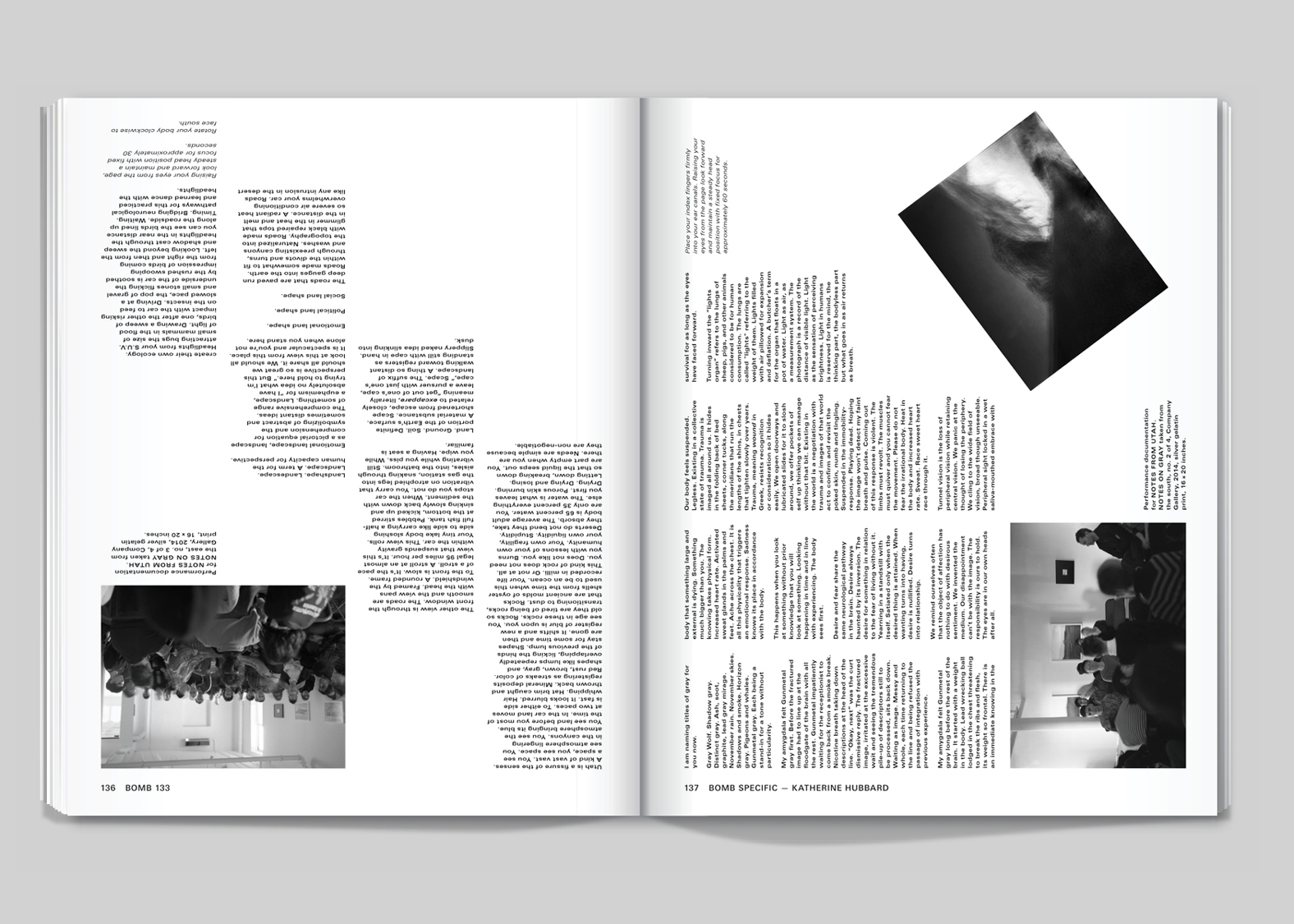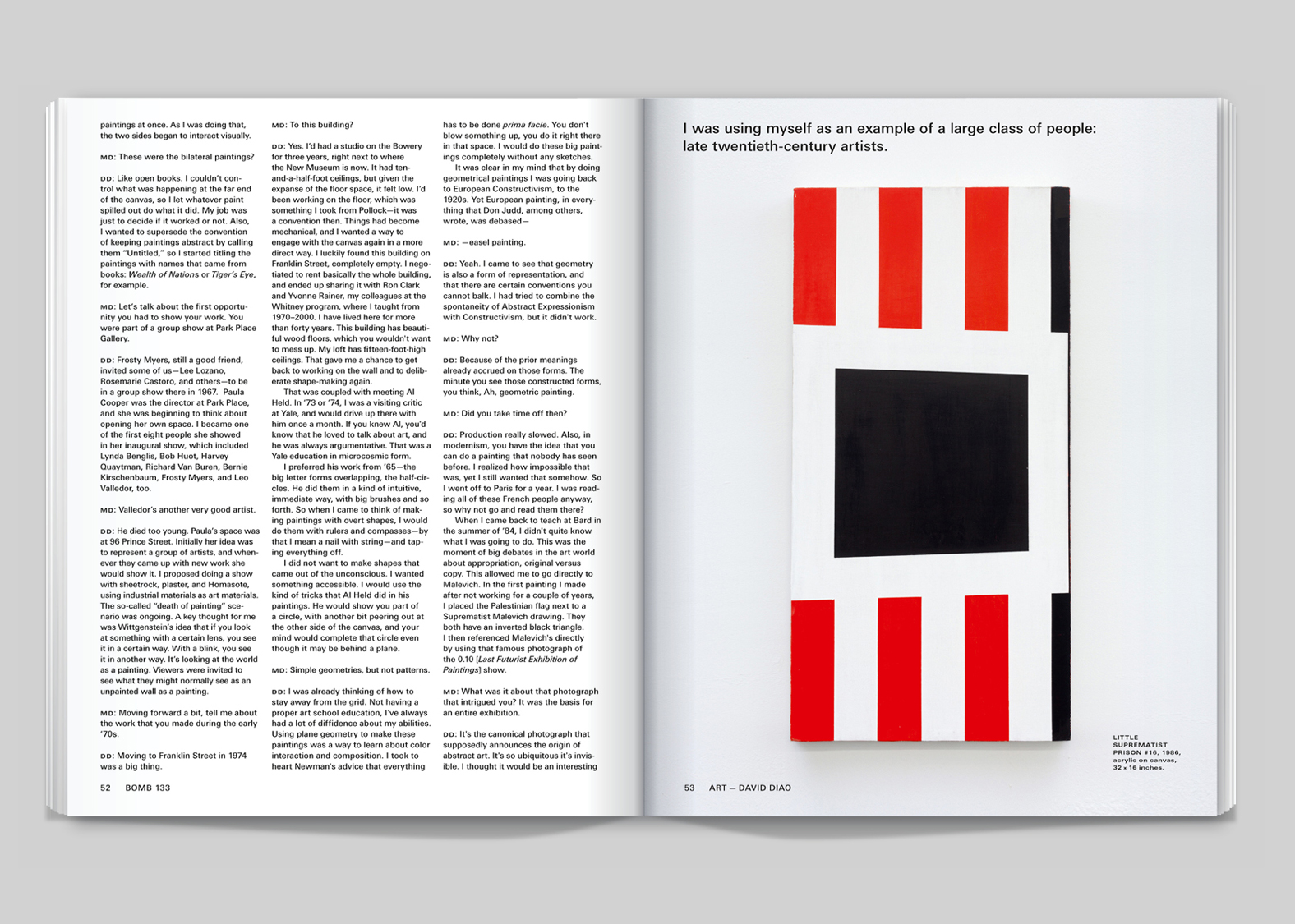 Rather than try to find the ideal form for BOMB’s content, our approach attempted to capture what we had experienced on the shelves of their archive — the sense of ephemerality and scrappiness. To begin with we designed every issue with a different layout. The building blocks of the magazine — the caption, the column, the headline, the footer — we imagined would change in scale and placement for every issue. The only constant we gave ourselves was the use of the typeface Univers, simply because it has so much stylistic variety. As the years passed we settled into layouts with longer timespans. We stopped frantically remaking the grid from scratch for each issue, and would allow the same template to be repurposed for a year at a time.