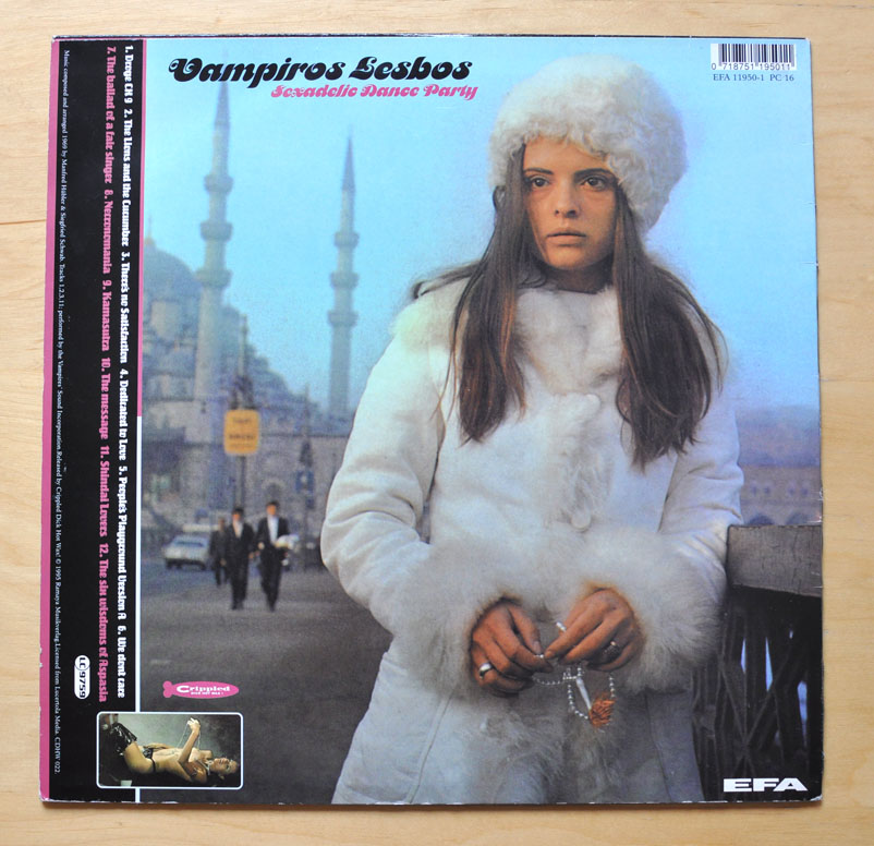 Intrigued by the vintage record covers with Motter Ombra on this very website I explored the Motter website and checked out some of the luscious variants. One of them was instantly familiar to me — Motter Femina — the one used for the titling on this sizzling cover for the soundtrack compilation Vampiros Lesbos Sexadelic Dance Party released in 1995 by excellent specialist label Crippled Dick Hot Wax!