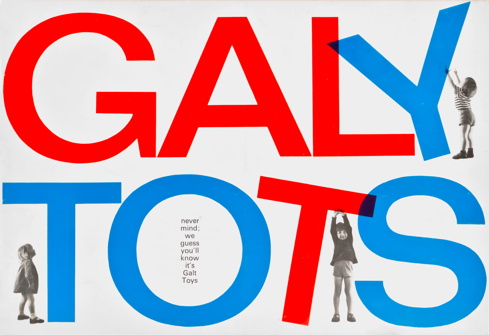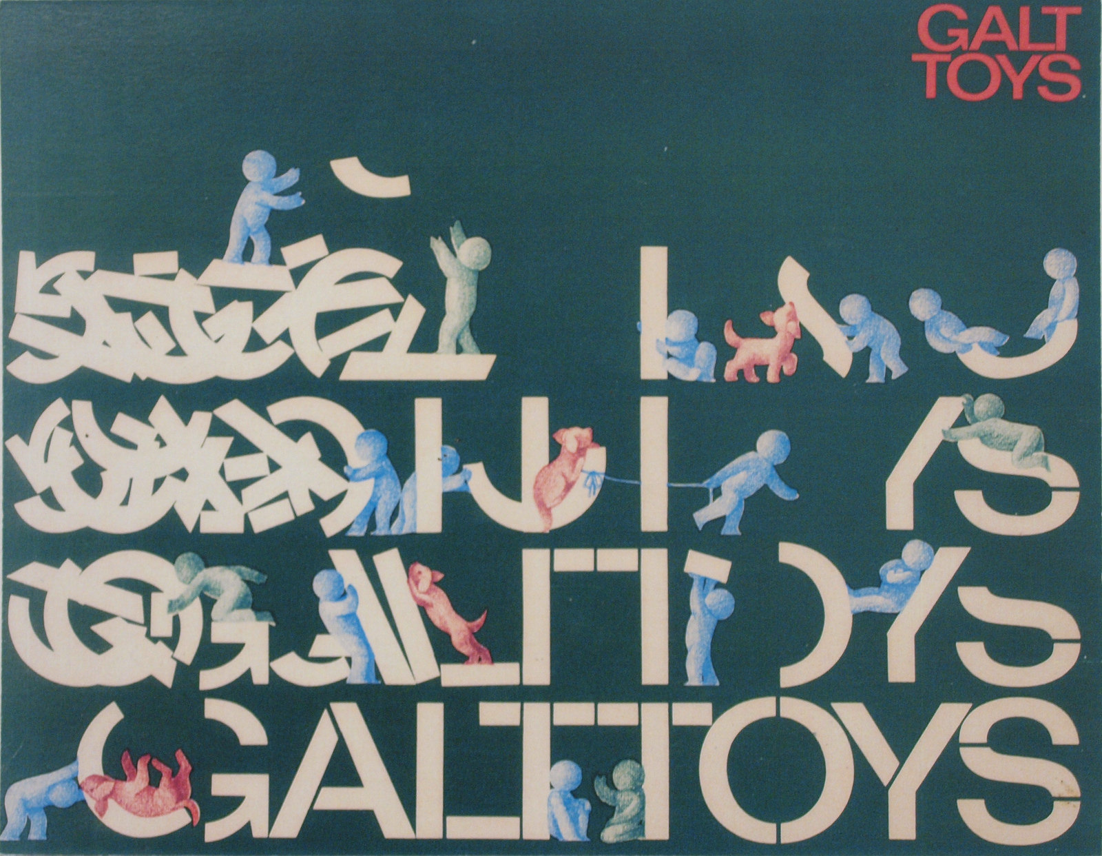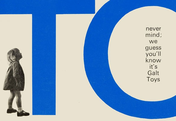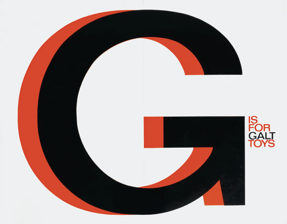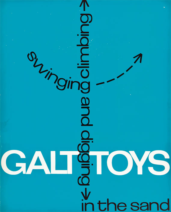 The style was maintained consistently for 20 years. The letterforms chosen for GALT TOYS were from a very recently issued typeface, Folio Medium Extended. … [We] were determined not to let the Galt Toys logo become a sacred cow, not to be mucked about with (as was decreed with so many logos in the 50s and 60s). It would, indeed, be mucked around with, but only by us. — Ken Garland, Galy Tots