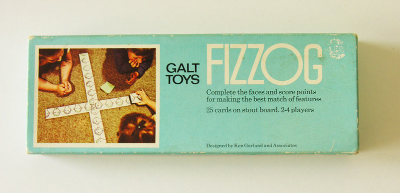 Ken Garland & Associates designed the original Fizzog matching game in 1969. This is a mid-1970s edition. The designer of this box is unclear, but it seems to have been released during Garland’s tenure.