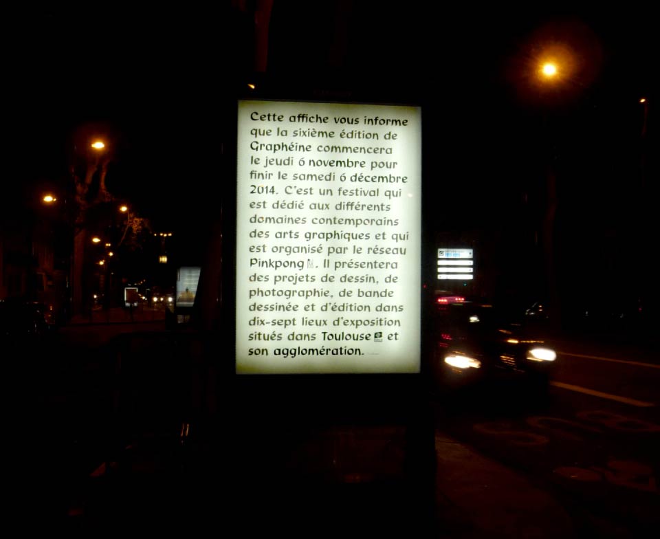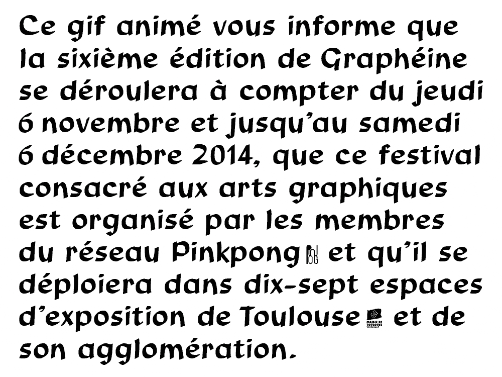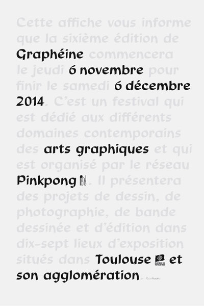 Graphéine 2014 Contributed by Florian Hardwig on Jul 6th, 2017. Artwork published in 2014. Source: www.gaelle.sandre.free.fr Gaëlle Sandré. License: All Rights Reserved. “This poster informs you that the sixth edition of Graphéine starts on Thursday, 6 November, and ends on Saturday, 6 December 2014 […]” Event identity for the Graphéine festival, dedicated to the contemporary practices of graphic arts and organized by the Pinkpong network, an association of art centers in the Toulouse region. The self-referential, purely typographic campaign uses a single typeface in one size. It is Adams Bold, a revival of Dick Dooijes’ Flambard (Amsterdam, 1954). Source: www.rovo.fr Rovo. License: All Rights Reserved. Gaëlle Sandré. License: All Rights Reserved. Source: www.gaelle.sandre.free.fr Gaëlle Sandré. License: All Rights Reserved. Typefaces More about AdamsGet Adams Formats Posters/Flyers (5869) Film/Video (1081) Topics Event (3286) Graphic Design (3041) Designers/Agencies Sébastien Dégeilh (3) Rovo (2) Gaëlle Sandré (1) Tagged withonly type (1296)black and white (2038)one typeface, one size (415)self-referential (30)design festivals (57)French (language) (2593)gray (160)announcements (6) Artwork location France (2904) Toulouse (71) Post a comment Name Email – will not be published Website Your response Submit Comment More in Event Australian Grand Prix2012Photo(s) by Stephen Coles on Flickr. Seoul YouthHub public research project poster series2020우미숙moonanhanContributed by Sandoll Inc. Staff Pick London Design Festival 20122012PentagramDomenic LippaContributed by Nick Sherman Sponsor More in Posters/Flyers Palm Springs Life, February 20262026unknownContributed by Jan Maack Pavec gallery2025Juliette BaillyTomes StudioContributed by Gwennina Moigne Earth’s Edge flyer, Aug. 27, 19831983Phase 2Contributed by Stephen Coles Staff Pick Austrian Fashion Auctionc. 2014studio VIEContributed by Markus John More Fonts In Use Sweden Summer Stamps2011Fellow DesignersContributed by Stephen Coles Staff Pick George Nelson On Design1978PentagramColin ForbesContributed by Stephen Coles Staff Pick Leeds Street rain garden2011HeineJonesContributed by Emtype Foundry Staff Pick Au Bon Pain logo / brandingContributed by Nick Sherman Staff Pick Posters for Musée des Beaux-Arts, La Chaux-de-Fonds (2010–2013)2013OnlabThibaud TissotJosh SchaubContributed by Florian Hardwig Staff Pick Roy Haynes – Cymbalism album artc. 1963Don SchlittenContributed by Florian Hardwig Staff Pick Helvetica and the New York City Subway System2010Paul ShawAbby GoldsteinContributed by Stephen Coles Staff Pick “welkom, welcome, benvenuto, willkommen, velkom, dobro dosjlie” — poster for De Bijenkorfc. 1969Total DesignBen BosContributed by Florian Hardwig Staff Pick