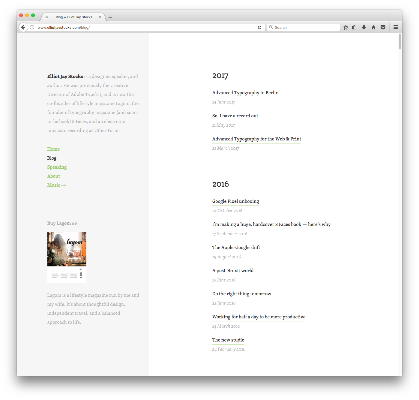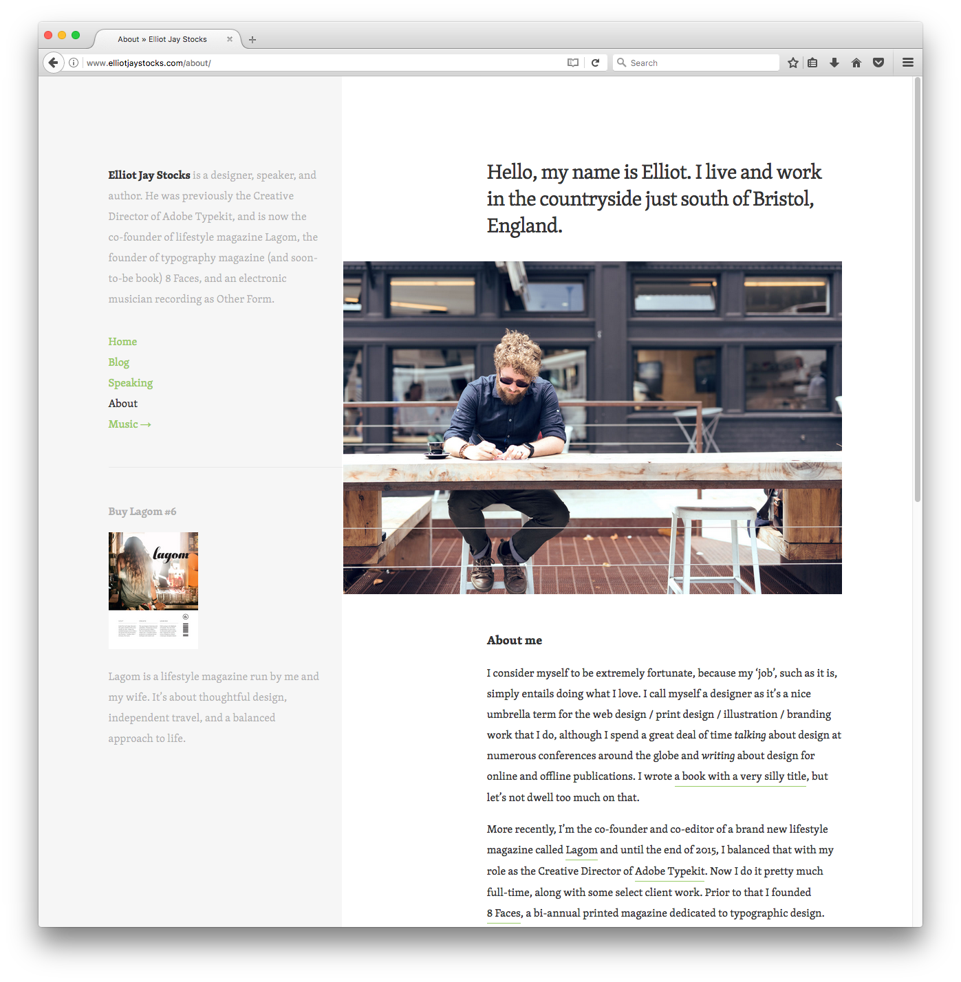 Blog of Elliot Jay Stocks Contributed by Rosetta on Jul 7th, 2017. Artwork published in 2017. Source: www.elliotjaystocks.com Photo: Rosetta. License: All Rights Reserved. Designer, speaker, and author Elliot Jay Stocks is a long-time fan of Skolar, hence it comes as no surprise he uses it on his personal blog. Source: www.elliotjaystocks.com Photo: Rosetta. License: All Rights Reserved. Source: www.elliotjaystocks.com Photo: Rosetta. License: All Rights Reserved. Typefaces More about SkolarGet Skolar Formats Web (5557) Topics Graphic Design (2980) Other (257) Designers/Agencies Elliot Jay Stocks (4) Tagged withblogs (121)personal websites (261)simple (60)minimalist (526)one typeface family (1662) Artwork location United Kingdom (3261) In Setslists (Arjun Dhillon) (48) Post a comment Name Email – will not be published Website Your response Submit Comment More Skolar in use Manual verde by Cosas Maravillosas2024Sergio RamírezContributed by Quintana-Font Muni magazine2011Petr HrnčířContributed by Anna Giedryś Large Hermes Head stamps2017George TriantafyllakosContributed by Rosetta Staff Pick Sponsor More in Other Die Epilog, issue 6: “Wir kommen. Thema Generation”2017Oh No Oh YesContributed by Die Epilog Die Epilog, issue 4: “Humor. Mehr als Spaß”2014Oh No Oh YesContributed by Die Epilog Bilingual Design 101: Punctuation2023Lihao ZhuContributed by Lihao Zhu Apocalyptic Witchcraft by Peter Grey2013Alkistis DimechContributed by Kai Büschl More in Web MANAc. 2023MANAContributed by Ivo Gabrowitsch Bas & Chris2021Mark Blacklerhow by whyContributed by how by why Staff Pick Beirut Re-Store2020Antoine RouxContributed by Production Type Kilómetro Cero brandingc. 2019César SesioContributed by Kontour More Fonts In Use Lentil Space. Recipes from Artists’ Homes2025Cecilia MurgiaManuel RaederStudio Manuel RaederContributed by Naïma Ben Ayed Staff Pick Industrial Design Magazine (1968–70)1968Massimo VignelliContributed by Stephen Coles Staff Pick Humbug October 2020 program poster series2020Berger + Co.Contributed by berger + Co. Staff Pick Virei movie posters, titles, trailer2024Studio DobraContributed by Dobra Staff Pick