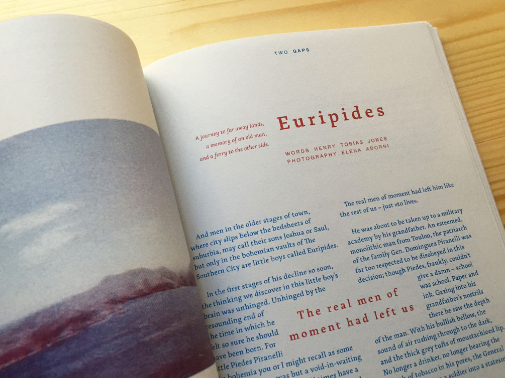 NOUS magazine is a Manchester based publication dedicated to conversations about mental illness. With each issue NOUS is taking its readers on a journey in three parts featuring short stories, interviews, poetry, and essay exploring one chapter of our mental health. Published biannually with changing topics related to mind culture, philosophy, mental illness, and the everyday. The magazine is printed by Team Trident Press in everchanging dualcolour variations. Issue No. 6 comes in blue and red and is set in Arek by Khajag Apelian.