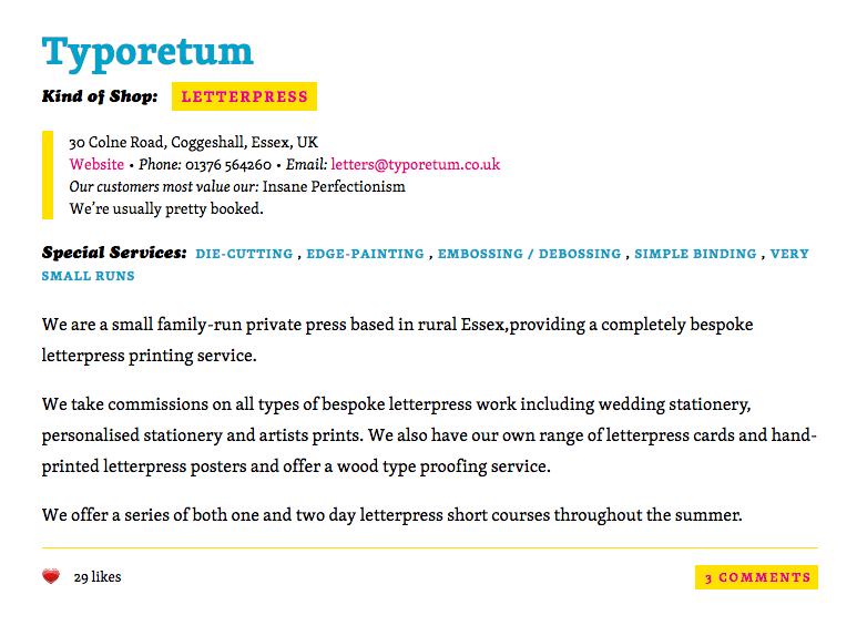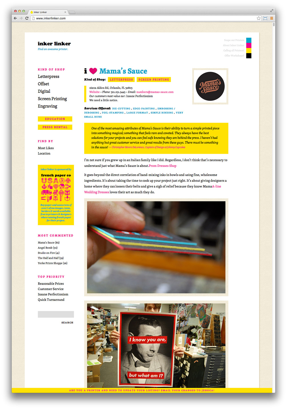 Inker linker is a web listing of various printing establishments. It claims to help in finding “printers based on what they do best or what’s most important to you”. Designed by Jessica Hische, the website uses our Skolar for text, combined with Cooper Black by Oswald Bruce Cooper for the logo and various captions.