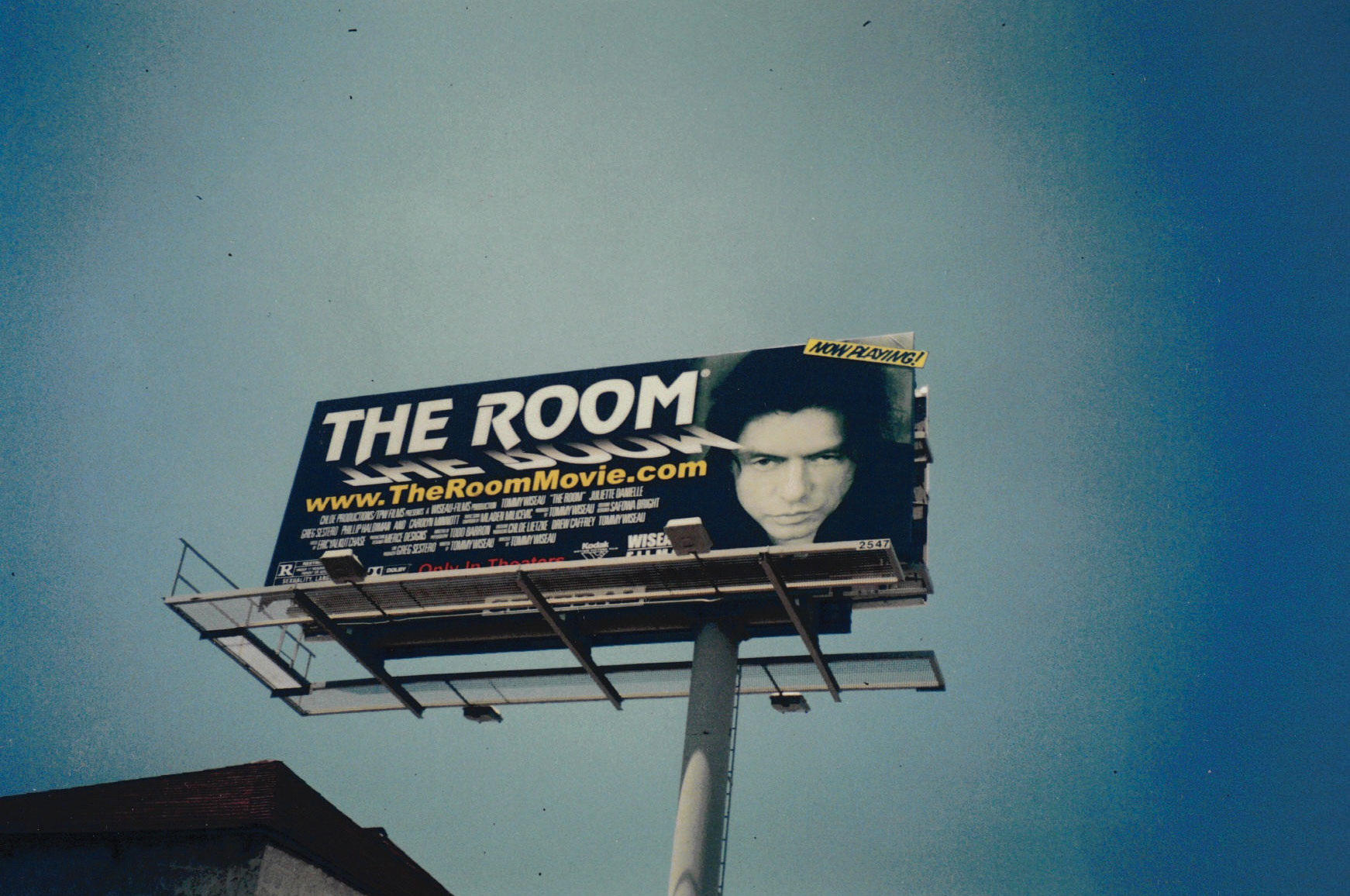 The film was promoted almost exclusively through a single billboard in Hollywood, located on Highland Avenue just north of Fountain, featuring an image Wiseau refers to as “Evil Man”: an extreme close-up of his own face with one eye in mid-blink. Although more conventional artwork was created for the film, featuring the main characters’ faces emblazoned over the Golden Gate Bridge, Wiseau chose the “Evil Man” for what he regarded as its provocative quality; around the time of the film’s release, the image led many passers-by to believe that The Room was a horror film. […] Despite the film’s failure to enjoy immediate success, Wiseau paid to keep the billboard up for over five years, at the cost of US$5,000 a month. Its bizarre imagery and longevity led to it becoming a minor tourist attraction.