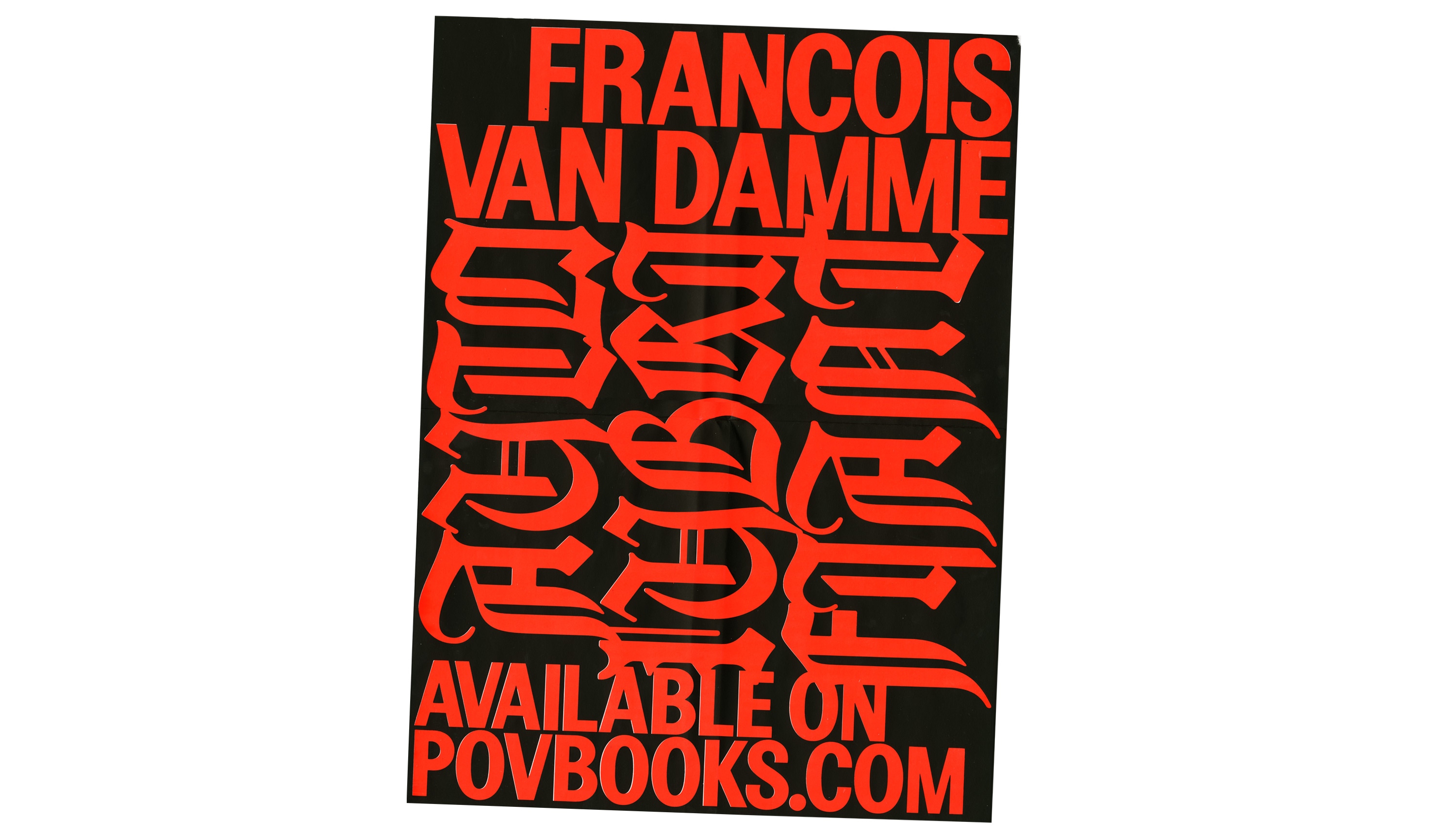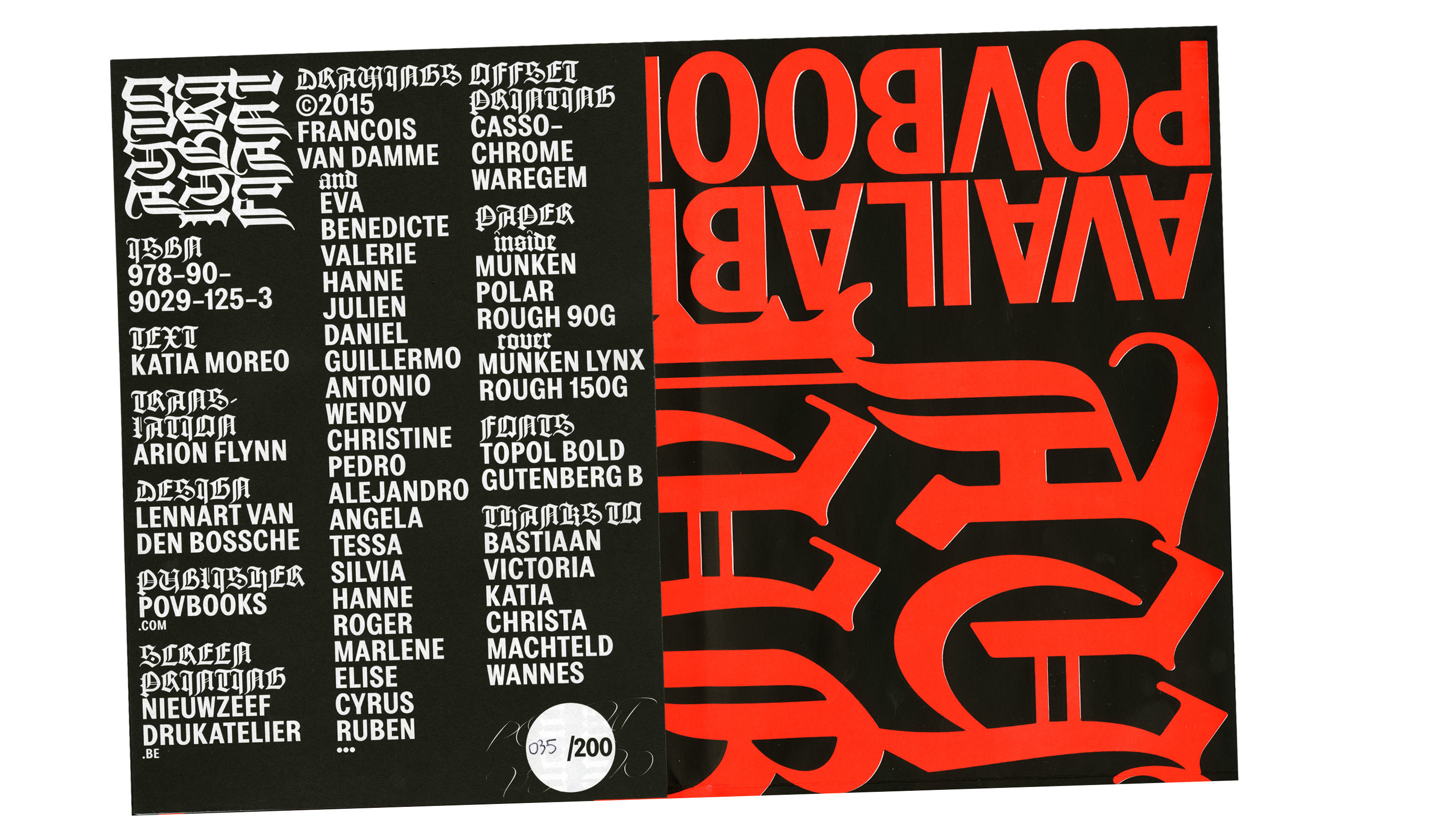 POV’s first book is a collection of drawings from artist François Van Damme. For the cover designer Lennart Van den Bossche used Topol Bold by Heavyweight in combination with Gutenberg B on a fluorescent red and black screenprinted poster wrap. The typography is also used inside for the colophon.