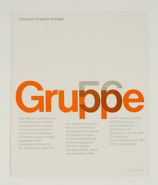 Invitation from the officers and directors of The American Institute of Graphic Arts to an exhibition of German Graphic Design. It featured the work of the members of “Gruppe 56”, the Stuttgart chapter of the German Graphic Desiners Club, which was founded in 1956. The Exhibition was held in 1964 at the AIGA gallery and was organized by the International Center for the Typographic Arts Inc.
