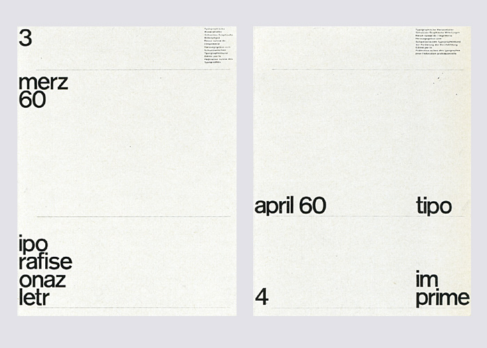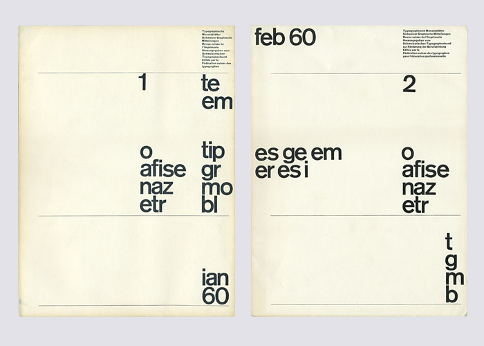 Stylistically different than Zimmermann’s earlier TM covers in 1958, these new designs have a stronger purpose, evoking words as they are spoken and not as they are written. For example in issue No. 1 reading the right-hand column first, the letters spell out the title phonetically: te – em – 1 / tip – o / gr – afise / mo – naz / bl – etr. In issue No. 2 it should be read as: es – ge – em (as in SGM, short for Schweizer Graphische Mitteilungen) / er – esi (or RSI Revue Suisse de L’imprimerie) / t – o / g – afise / m – naz / b – etr (or Typographische Monatsblätter).”