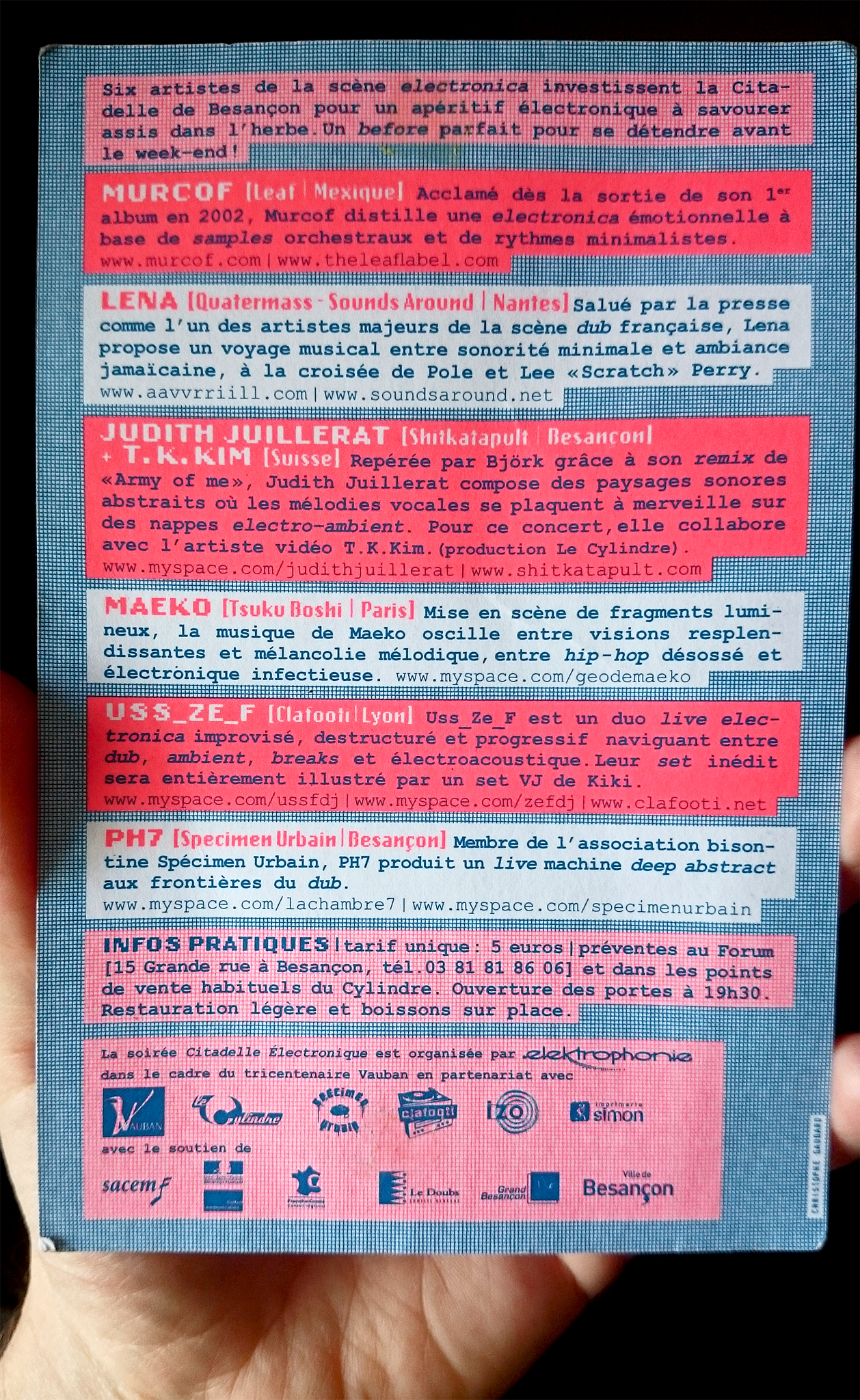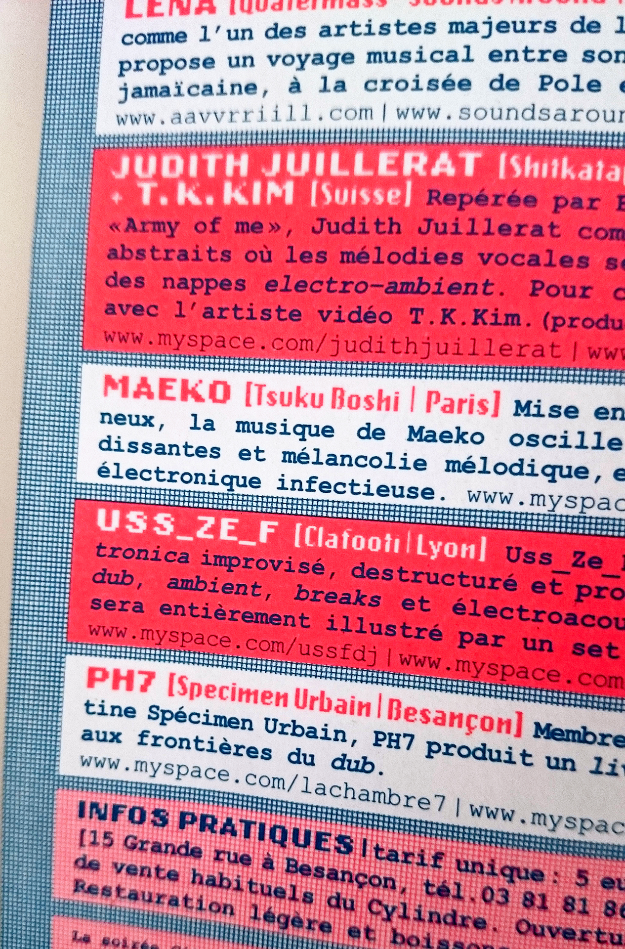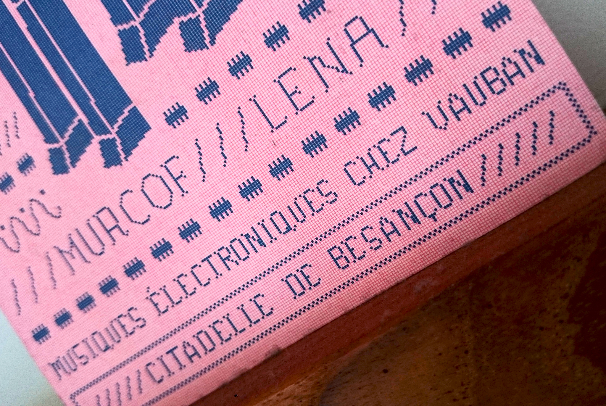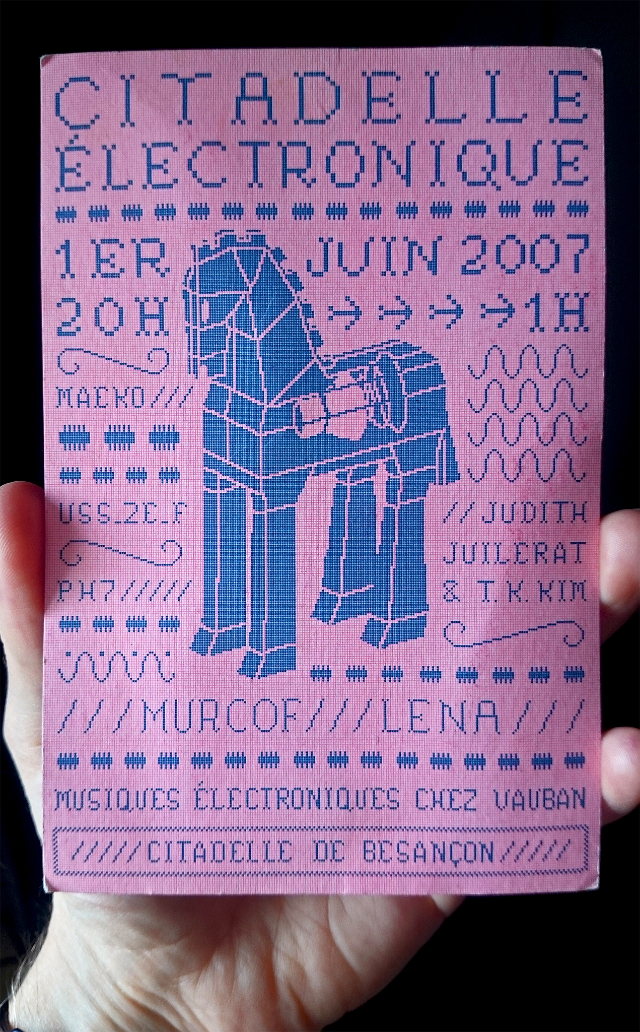 On this flyer for Citadelle Électronique, a music festival that took place in Besançon in 2007, Gaudard combines various styles of Emigre’s Lo-Res series of bitmap fonts with Courier New. The front side is reminiscient of embroidery samplers. It shows a number of additional monolinear pixel fonts with bifurcated serifs. These are unidentified and might be custom [see comment below].