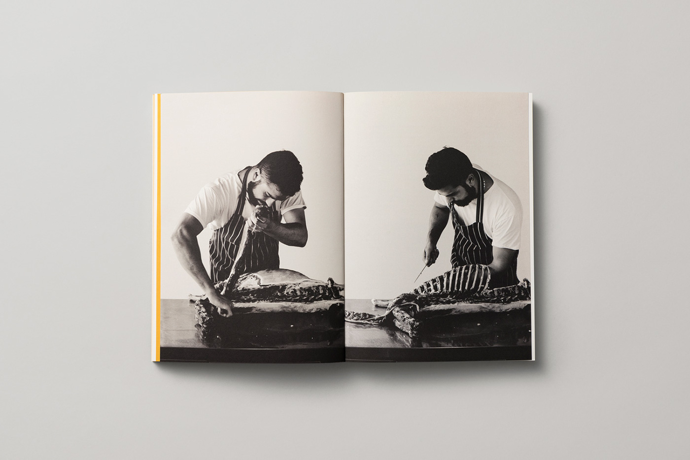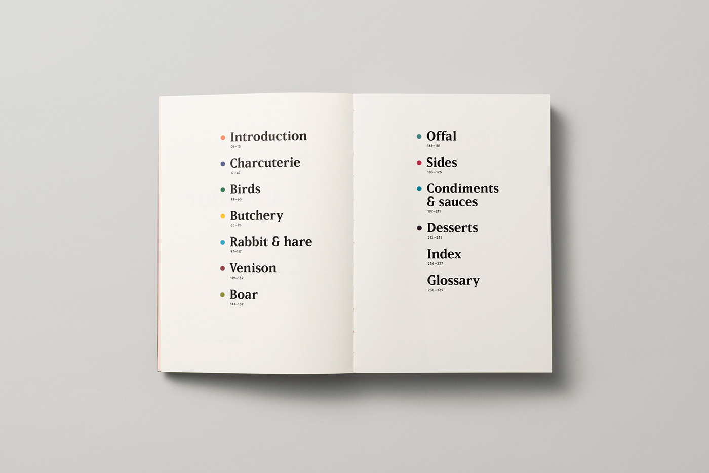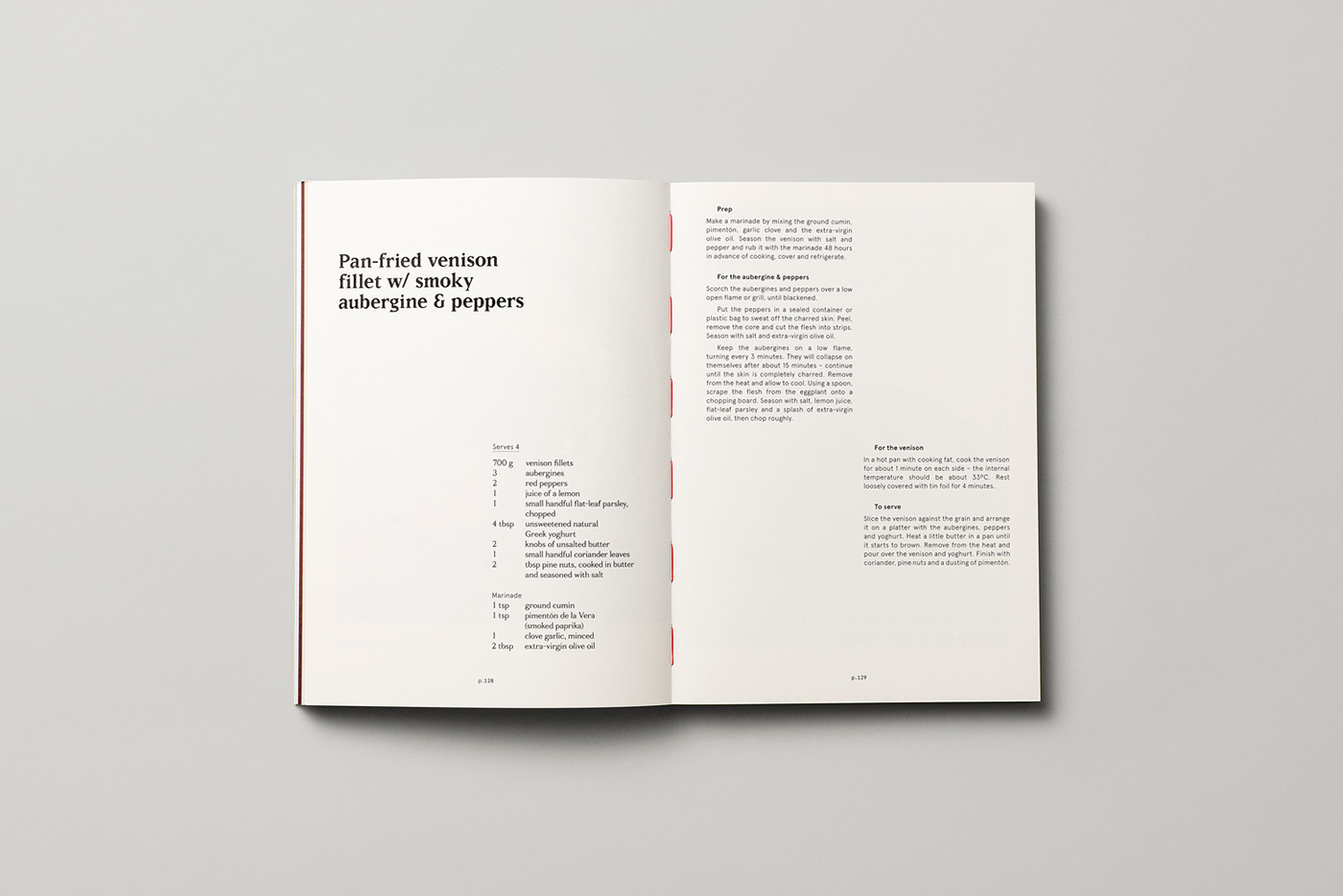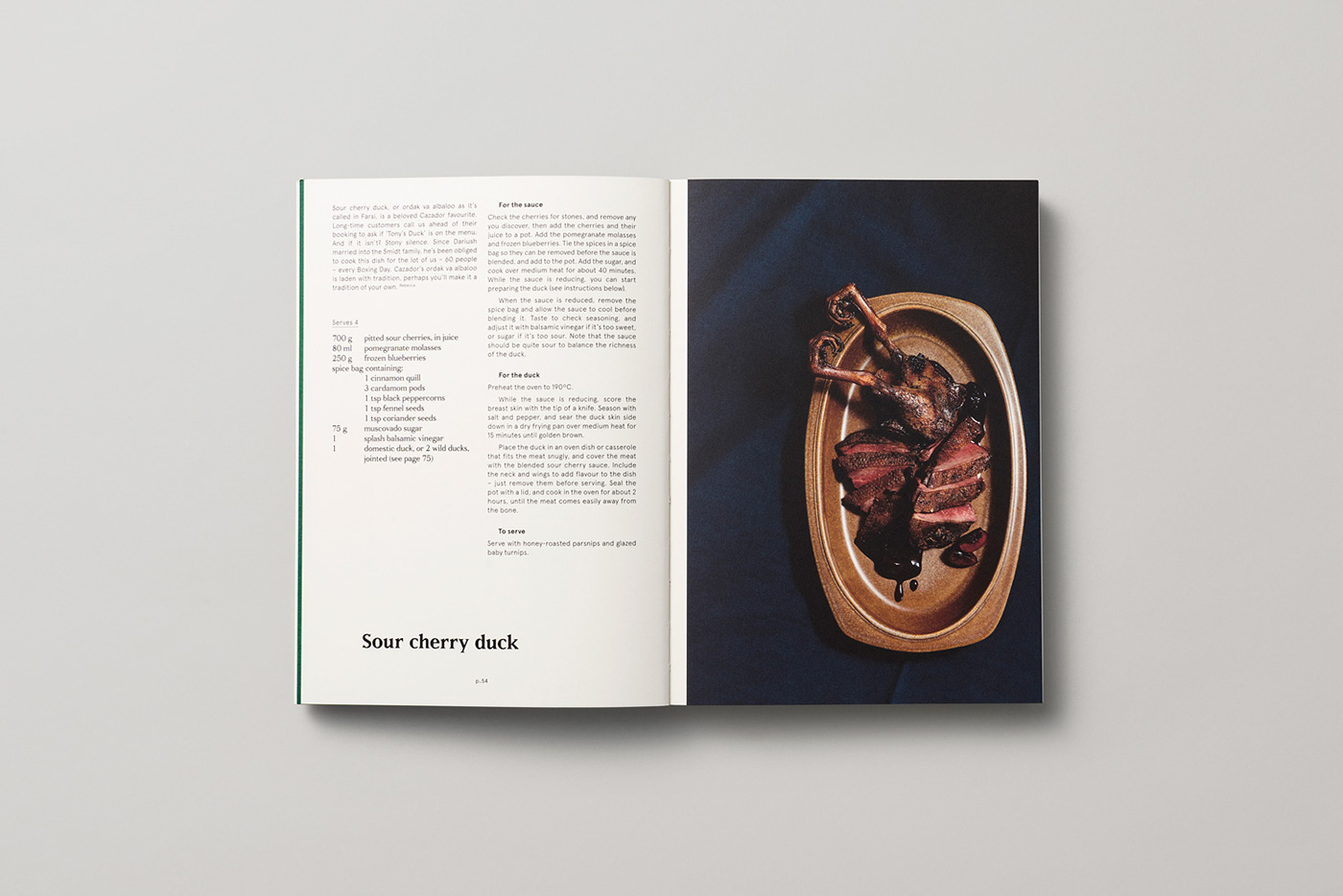 Sea Studio: The overall typographic design references field guides and art catalogues in showcasing the game and recipes in all their glory. The display typeface Matrix, is a forgotten serif typeface, that reflects the raw, stripped back aesthetic of the food and restaurant. The use of a flexible broken grid means every single recipe has a unique typographic layout. This is to reflect that each recipe is deeply personal and unique to the Cazadors.