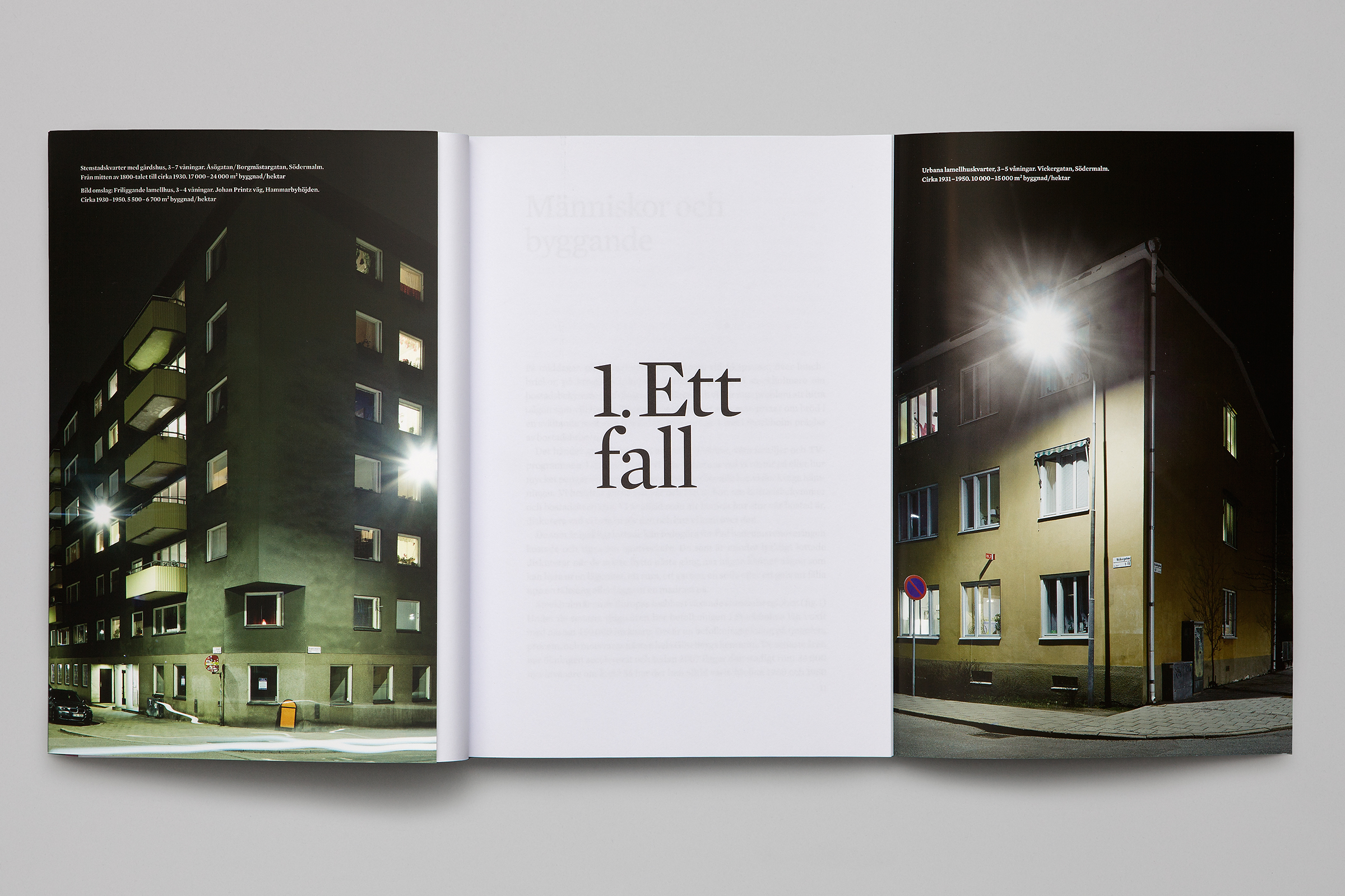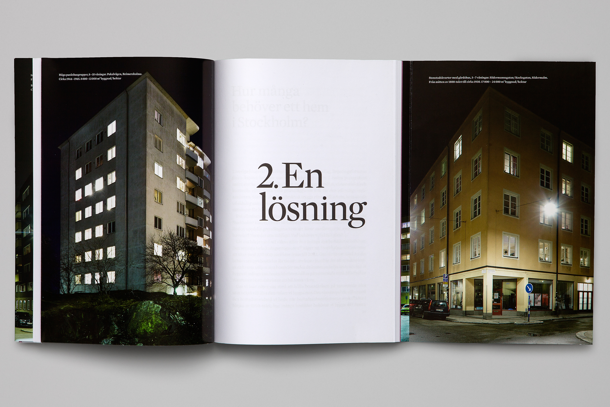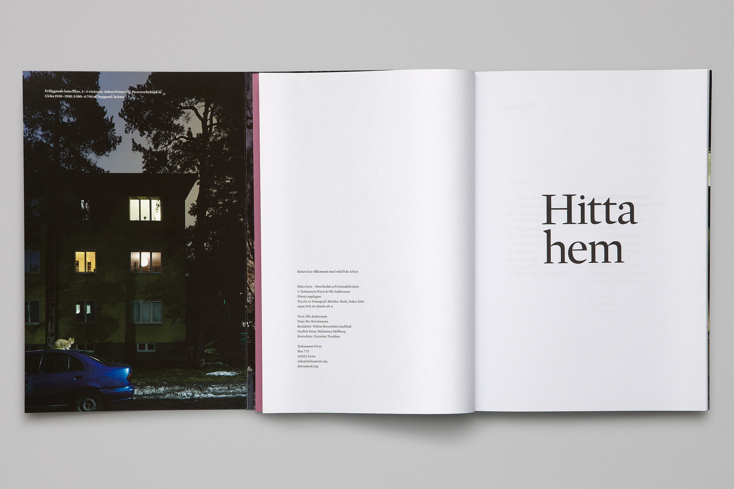 Hitta hem (Find your way home) is a book about Stockholm, published by Dokument Press and with nocturnal photography by Per Kristiansen where architect and writer Ola Andersson delivers the definitive solution to the housing situation. The soft cover book has flaps and a foldout section in the middle. All set in Mercury.