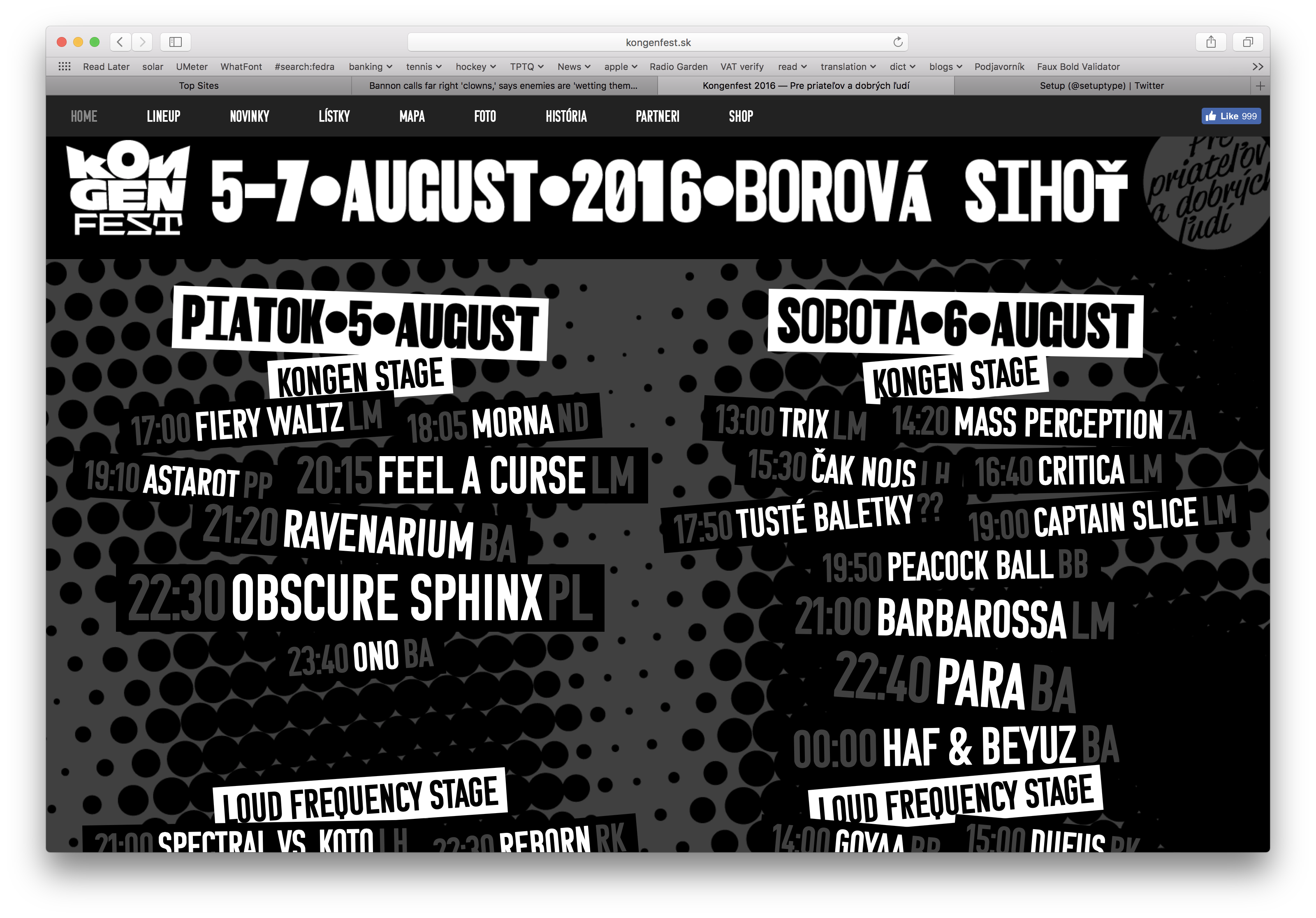 Posters and website for the Kongenfest, a two day open air music festival in Borová Sihot, Slovakia. Woodkit from Typotheque plays an important part in the festival’s visual identity. Woodkit Letterpress includes five different forms for each basic alphanumeric character. For Kongenfest, Ondrej Jób exclusively uses the condensed alternates — a look that can be achieved by activating the OpenType feature Discretionary Ligatures. Since 2011, the festival’s logo features another typeface by Job, Bismuth.