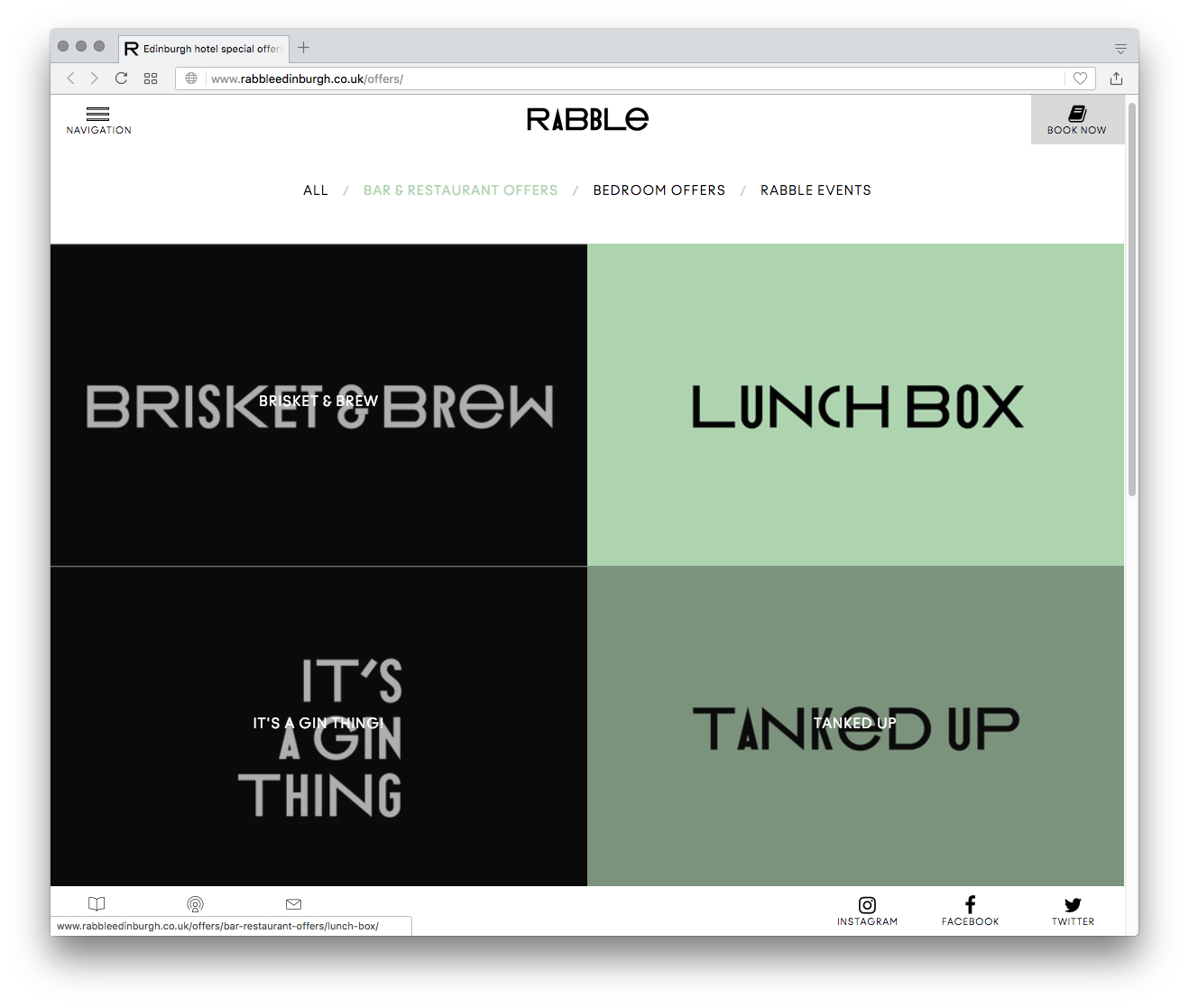 Rabble is “a boutique hotel, restaurant and bar located in the heart of Edinburgh.” The identity was designed by Touch, making use of various members of the Alias Ano family including its Wide styles where upper case characters are the width of a square, and lower case half the width of a square: