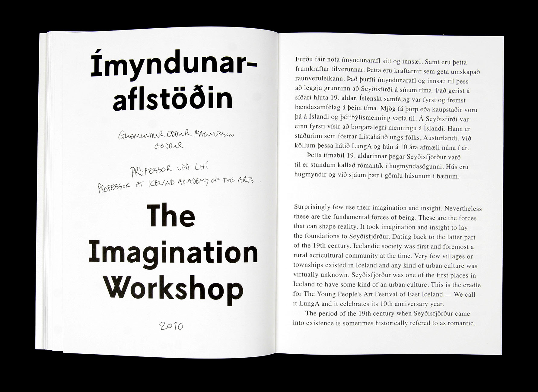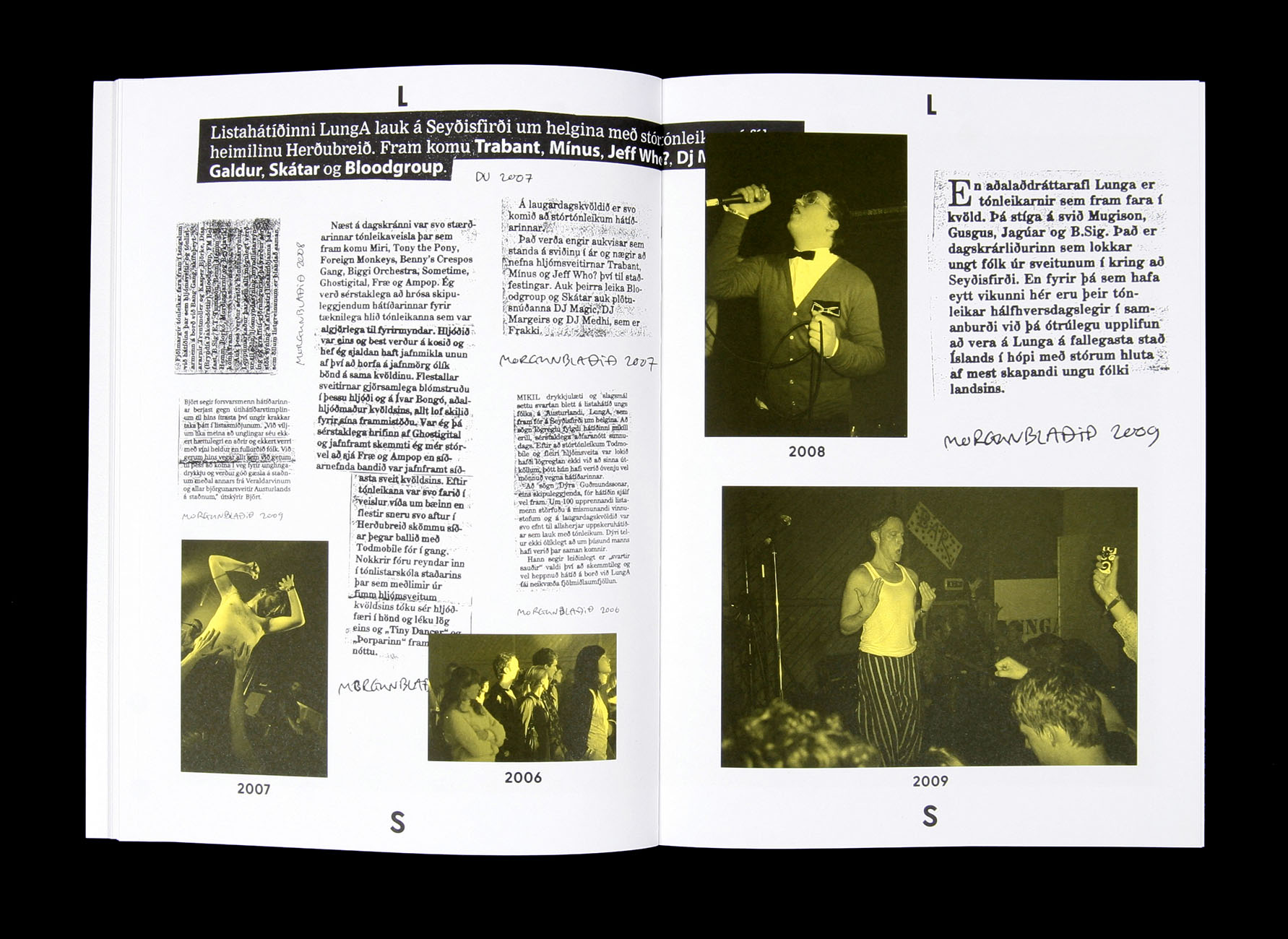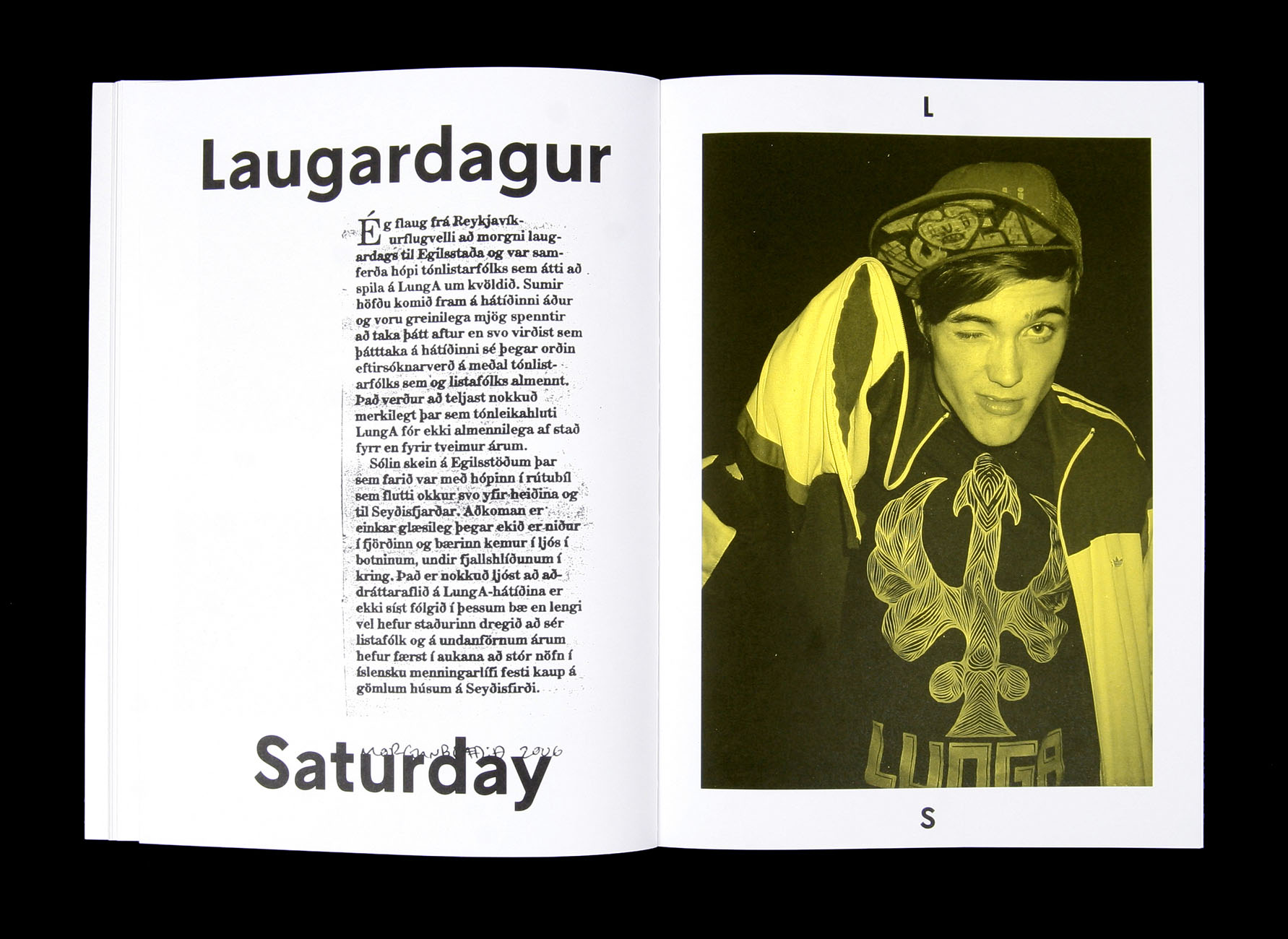 LungA 2000–2010 Contributed by Or Type on Sep 5th, 2017. Artwork published in 2010. License: All Rights Reserved. Design, concept and editing of a book on the occasion of the tenth anniversary of LungA, an art festival for young adults on the east coast of Iceland. The book was designed and edited in they same way as the festival unfolds, from Sunday to Sunday. License: All Rights Reserved. License: All Rights Reserved. License: All Rights Reserved. License: All Rights Reserved. License: All Rights Reserved. Typefaces More about L10Get L10More about TimesGet Times Formats Books (6600) Topics Event (3247) Music (6399) Art (4738) Performing Arts (1001) Designers/Agencies GUNMAD (9) Tagged withLungA (1)music festivals (344)workshops (138)yellow (404)yellow and black (477)handwriting (205)newspaper clippings (1)black and white (2033)center-aligned text (1929)Icelandic (language) (39)cultural festivals (135)anniversaries (362)first use (444)uses by the typeface’s designer (1284)book covers (5928)book interiors (3715)chapter openings (886) Artwork location Iceland (61) In SetsOriginal Use (Florian Hardwig) (341)cool (Karo Konieczna) (871)soulu (Karo Konieczna) (35)Unaffected (jipjam) (44)Times (Rodrigo) (10)Distinctive Sans (Lucas Bevilaqua) (167) Post a comment Name Email – will not be published Website Your response Submit Comment More L10 in use Babette book series, U Press2021Rikke VagnerContributed by Or Type Europarque2016PM DesignContributed by Or Type The Wire magazine, 2014–2018c. 2014Ben WeaverContributed by Or Type Staff Pick Sponsor More in Music Moondog & Moondog 2 album art1969Ron CoroTeresa AlfieriContributed by Stephen Coles Staff Pick Welcome2018Contributed by Matthijs Sluiter Włodzimierz Nahorny – Jej portret album art1971Marek KarewiczContributed by Florian Hardwig Klaus Schulze – Irrlicht1972Klaus SchulzeContributed by Matthijs Sluiter Staff Pick More in Books TIME: 85 Years of Great Writing2008Arthur HochsteinContributed by Jeremy Tankard Collection “Écrivains de Toujours”, Éditions du Seuilc. 1954unknownContributed by Florian Hardwig Staff Pick My Own Account2017Mother DesignContributed by Gareth Hague Do You Compute? book cover2019John ZabawaContributed by Ryan Mungia More Fonts In Use Rencontres Internationales de Genève 2021c. 2021Chris GautschiDennis Moya RazafimandimbyContributed by Dennis Moya Razafimandimby Staff Pick Tar Baby by Toni Morrison (Alfred A. Knopf)1981R.D. ScudellariContributed by Florian Hardwig Staff Pick Mary Arantes – As Preciosas Coisas Banais2017Gabriel FigueiredoContributed by Gabriel Figueiredo Staff Pick WESS Exhibition \ Publication 20252025Everyday PracticeJoonho KwonContributed by Gabriel Richter Staff Pick