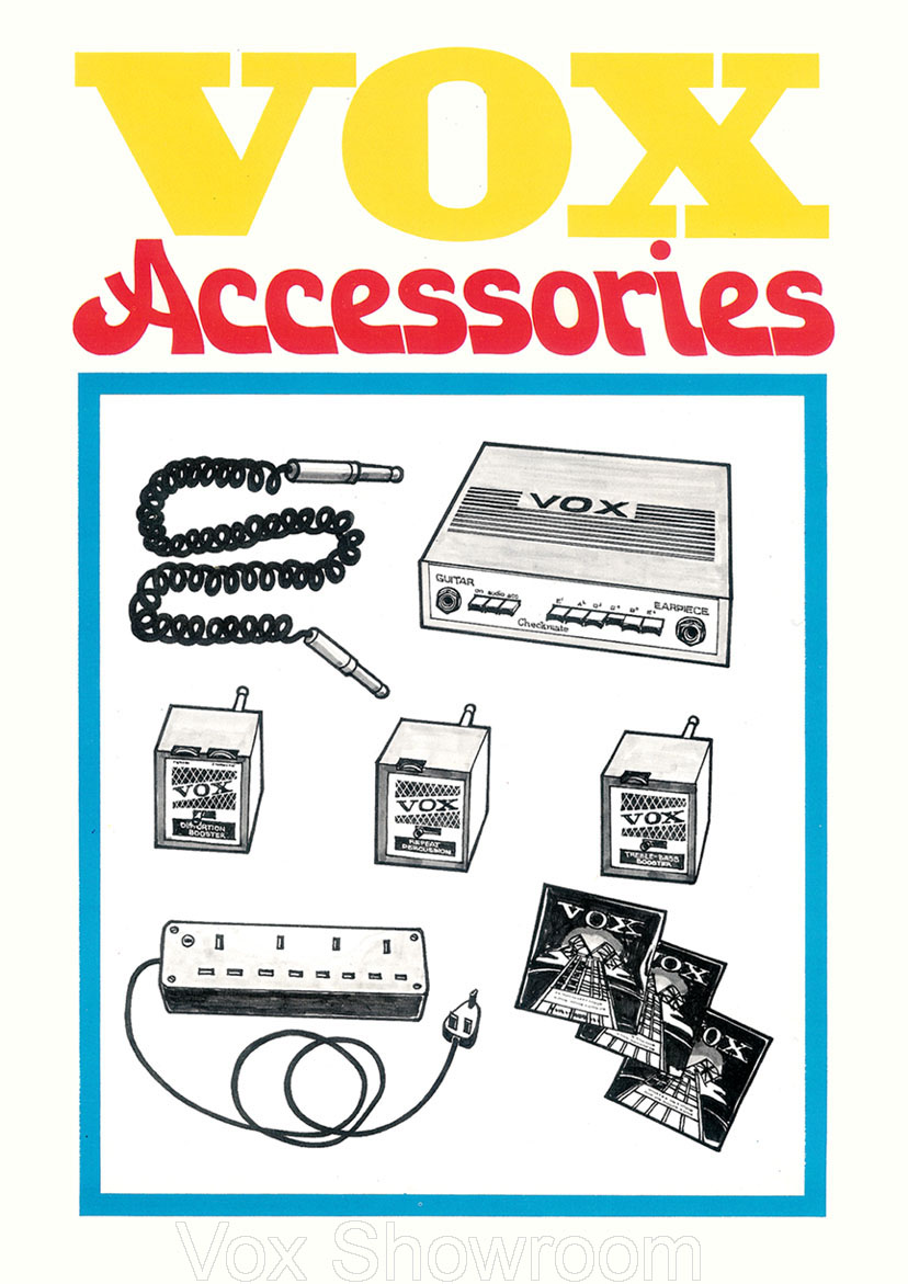 Selected pages of a 1971 catalog from Vox, the British manufacturer of audio equipment. These scans come from Vox expert Gary Hahlbeck, of North Coast Music, who writes about the groundbreaking gear shown in the first image: