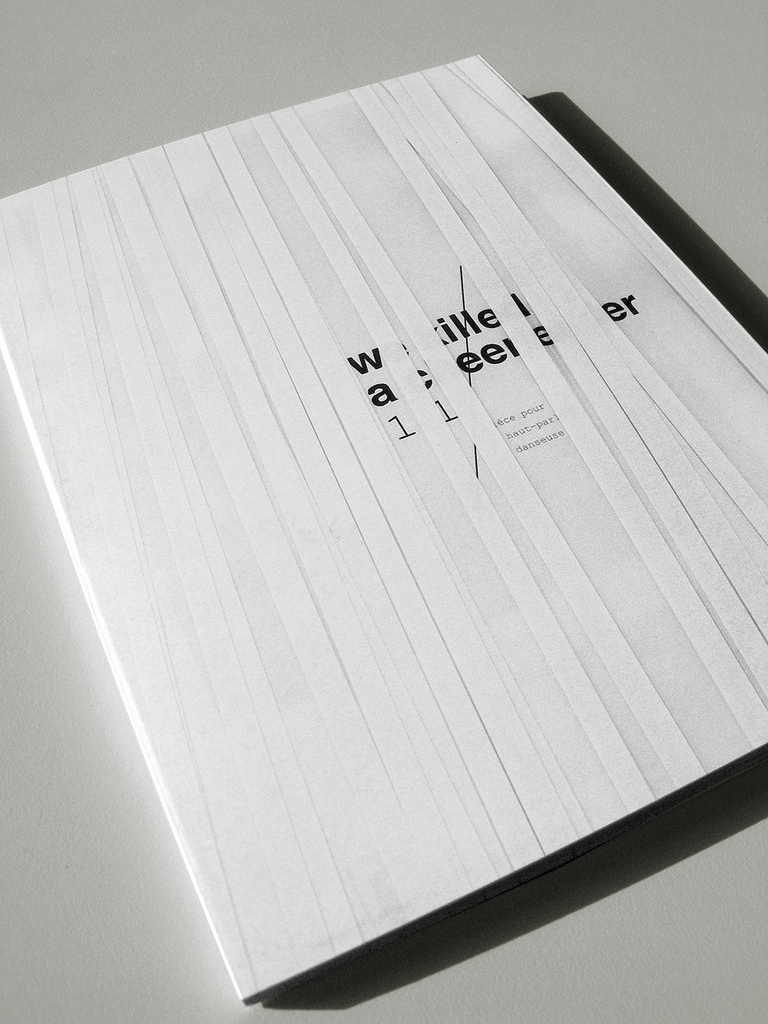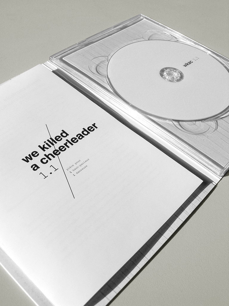 We killed a Cheerleader 1.1 is a performance by Marie Cambois (choreographer) and Jean-Philippe Gross (musician), based on decomposition of cheerleading movements (the numbering 1.1 means one dancer and one loudspeaker). The cover design translates that idea, using the iconic pom, reduced to its most minimal aspect : white flat stripes. The piece confronts two radical bias : minimalist dance and noisy feedbacks. Therefore, the typefaces should follow that contrasting combinaison : Helvetica, straight and minimal, and Courier New, rough.