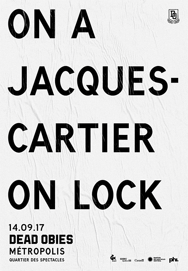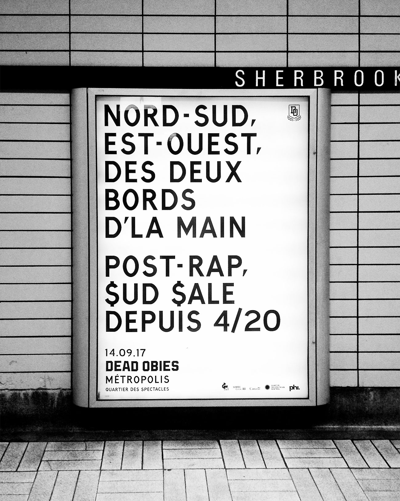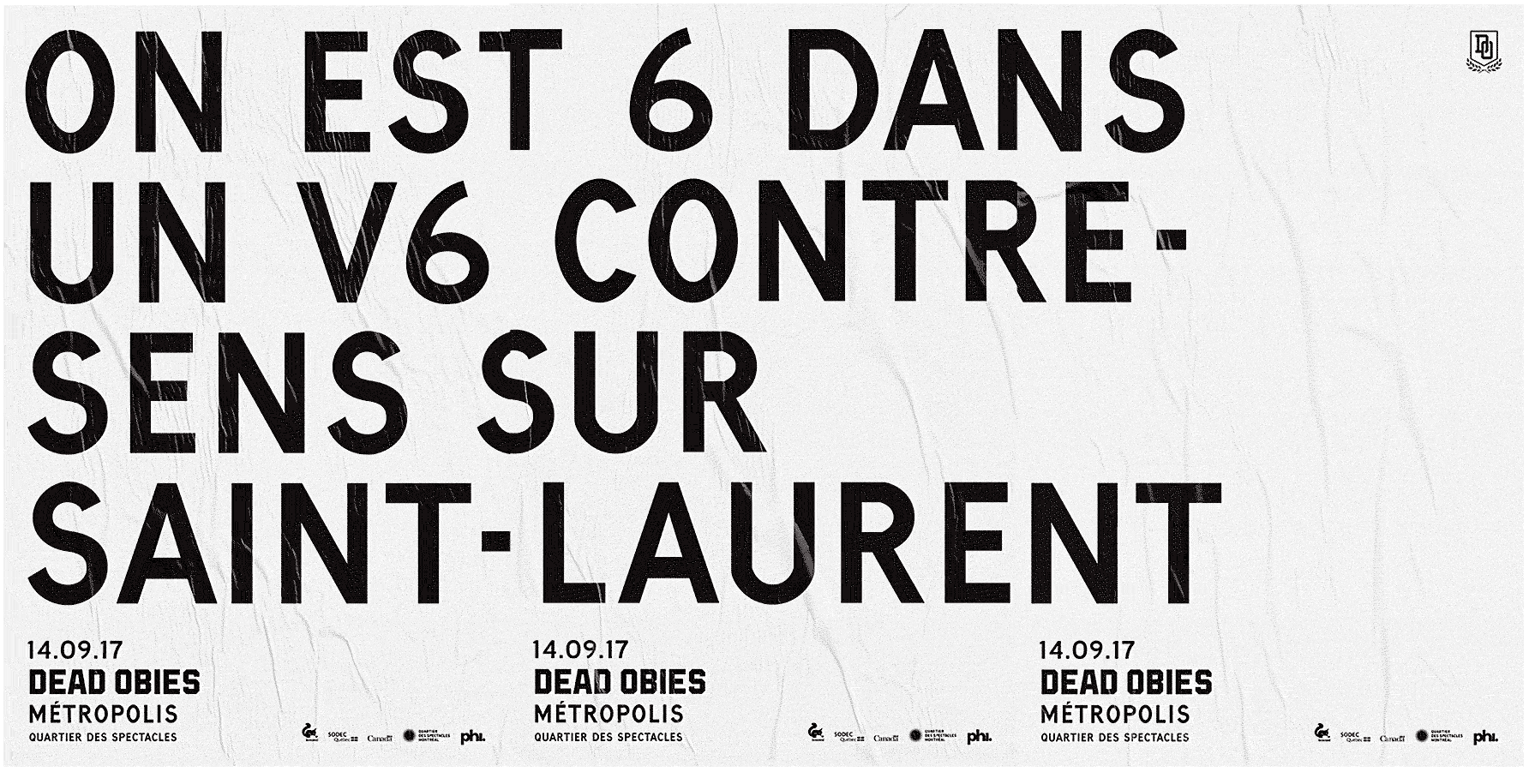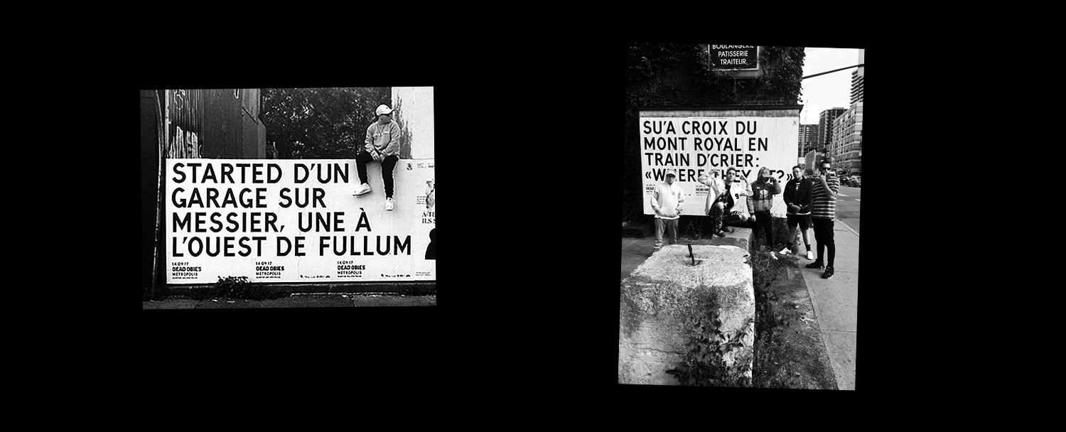 Ad campaign in collaboration with music label Bonsound and Frenglish speaking rap band Dead Obies to promote the last stop of their 2017 tour. The idea is raw and simple: plaster quotes from their songs explicitly referencing some neighborhoods and streets at said locations.