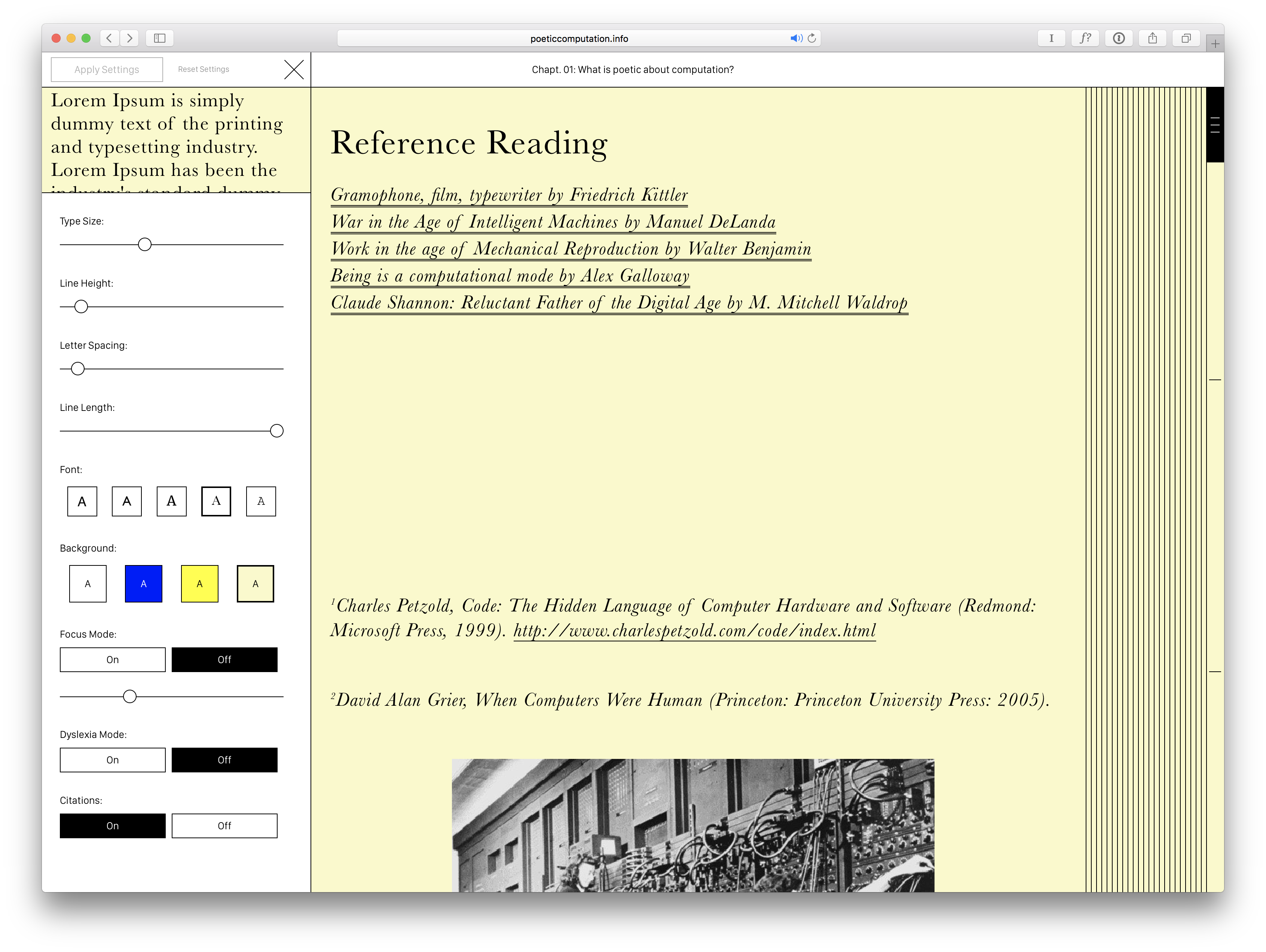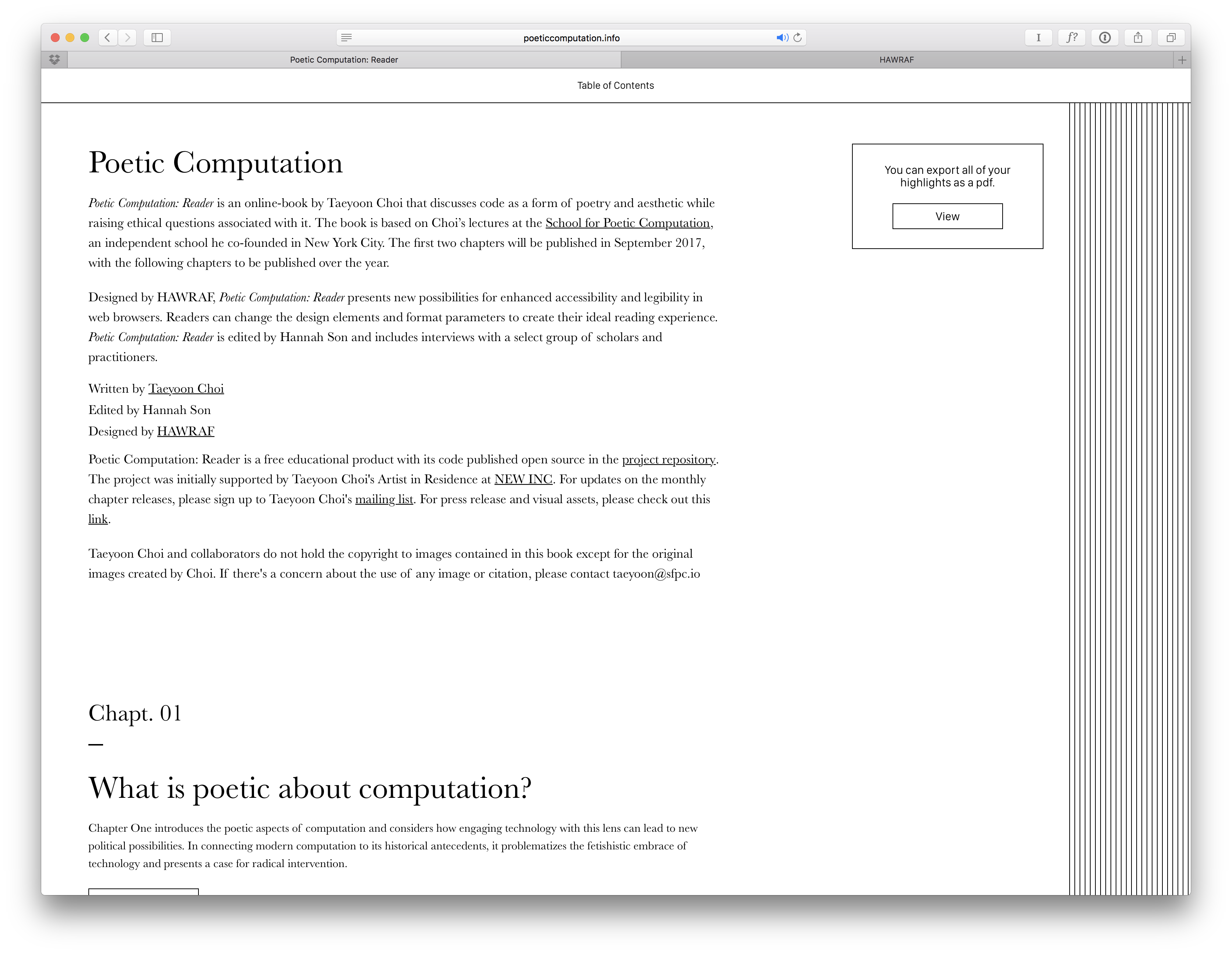 Designed by HAWRAF, Poetic Computation: Reader presents new possibilities for enhanced accessibility and legibility in web browsers. Readers can change the design elements and format parameters to create their ideal reading experience. Poetic Computation: Reader is edited by Hannah Son and includes interviews with a select group of scholars and practitioners.