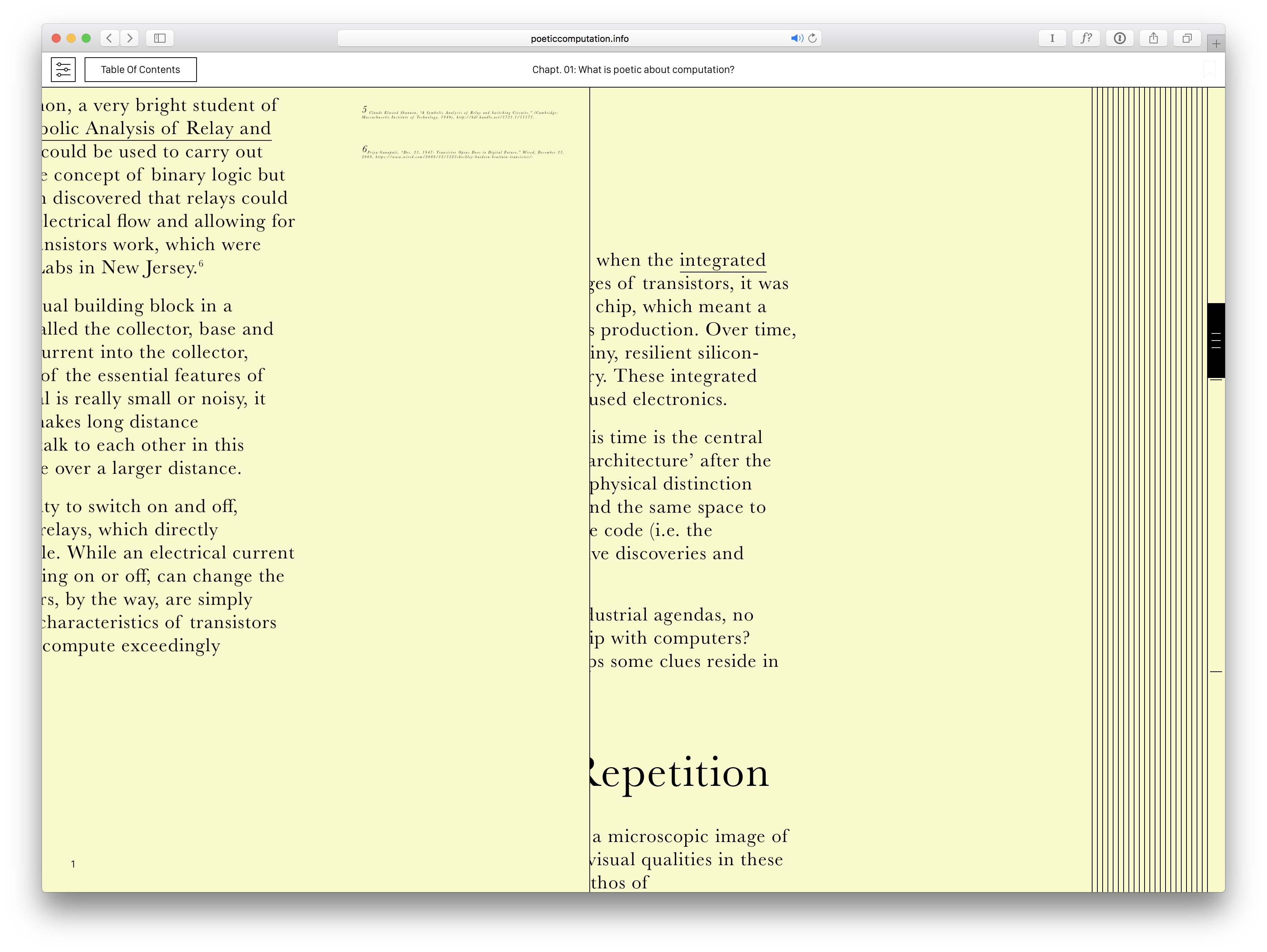 The typography seems unpolished often and mediocre at best, although the consideration for fully-customizable leading / type sizes would potentially have hindered attempts of finessing. The side note is so small as to lead one to believe it was a simple oversight in CSS instead of an intentional decision. There is also a serious usability issue: upon clicking and expanding the side note, there is also no immediate indication of how to go back to the main reader.