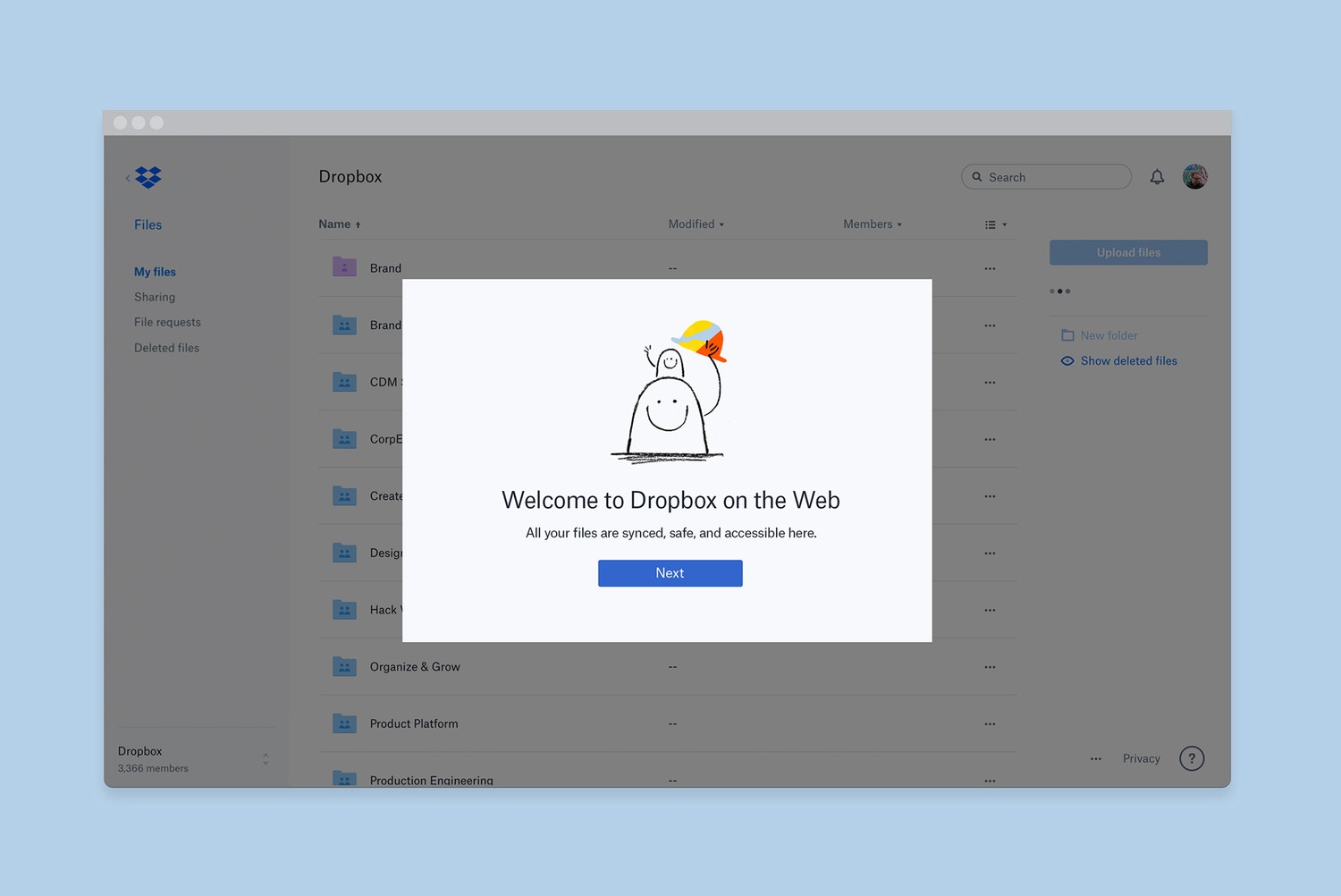 As our mission has evolved from keeping files in sync to helping keep teams in sync, we realized our brand needs to change, too. Our new brand system shows that Dropbox isn’t just a place to store your files—it’s a living workspace that brings teams and ideas together. The look is expressive, with vibrant colors, rich imagery, a versatile typeface, and playful illustrations.