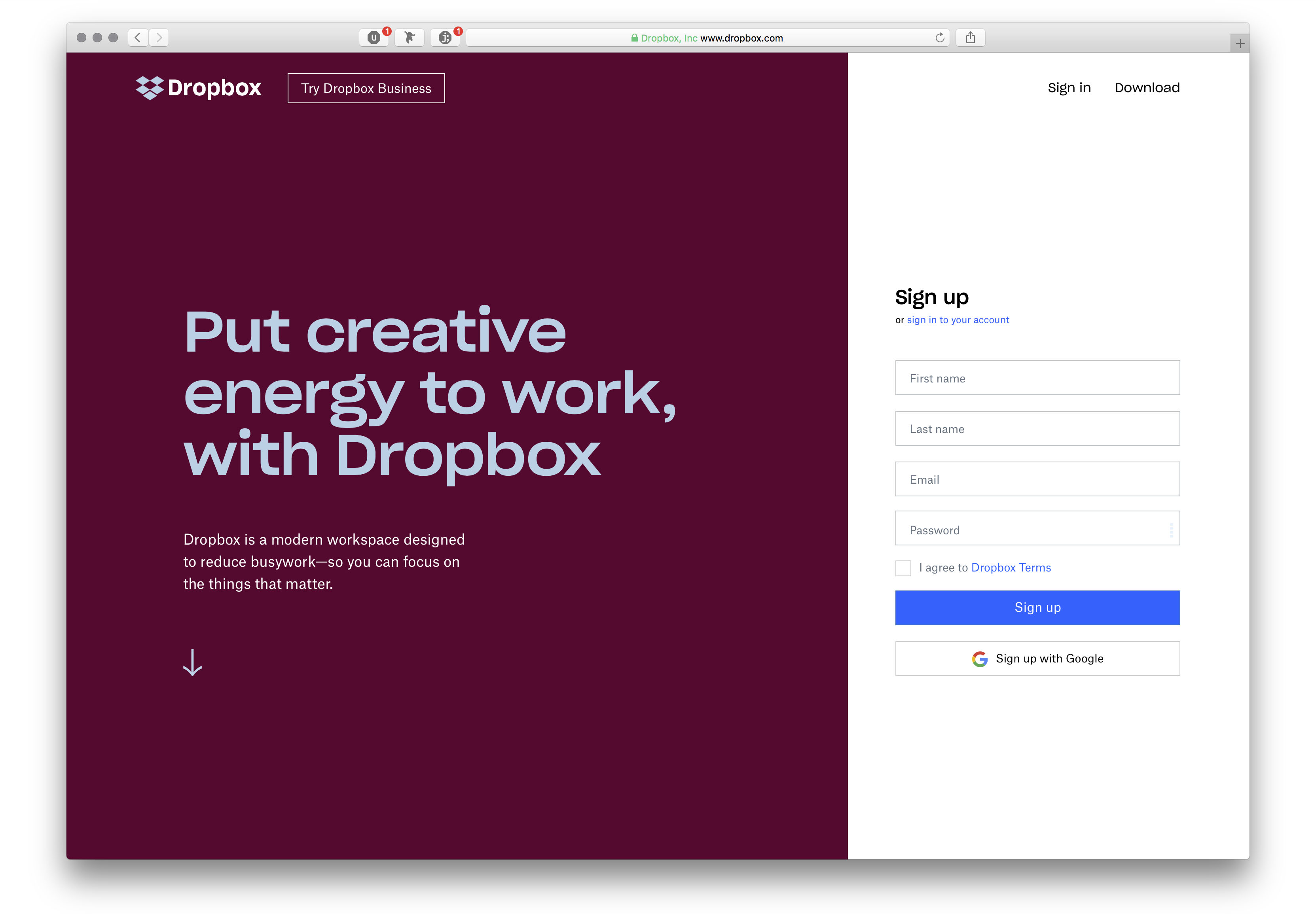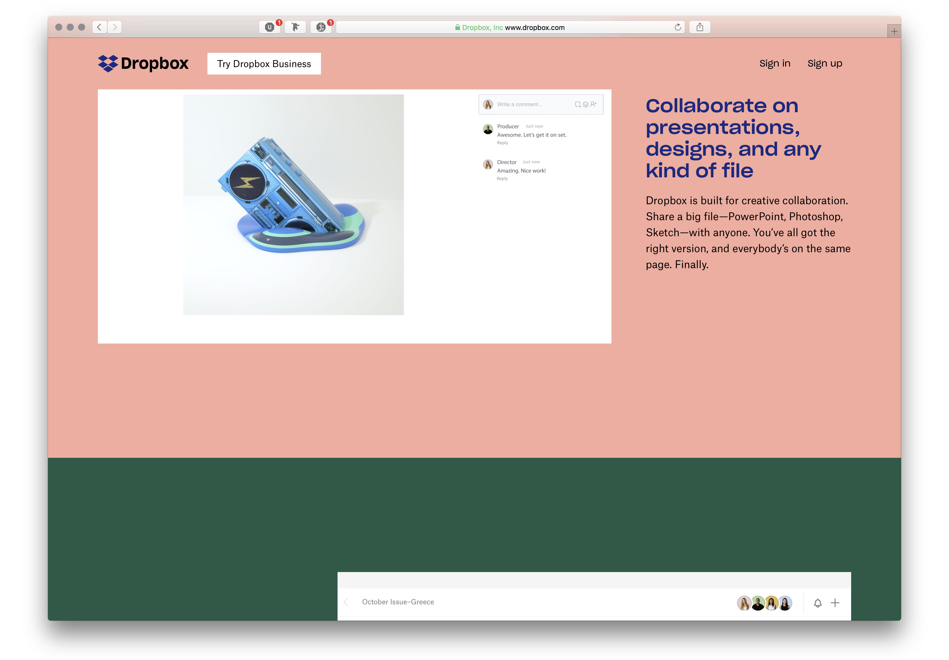 Our new system lets us pick the right amount of expressiveness for the situation. Color can go from a standard Dropbox blue to “whoa.” Same for type, photography, and illustration. In a marketing campaign, we can dial things up to provoke and inspire creative energy. But in our product, where people need to concentrate on their work, we can dial it down.