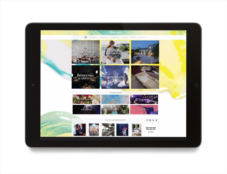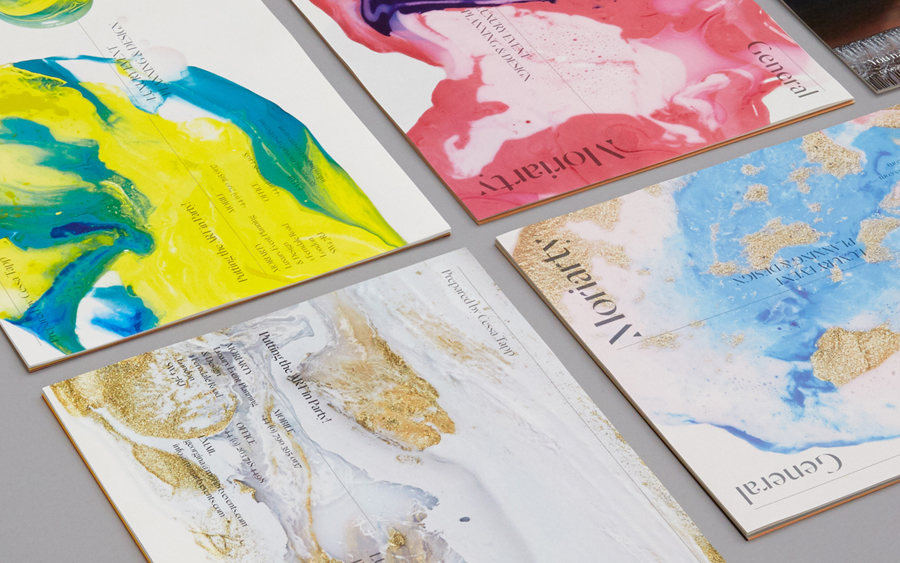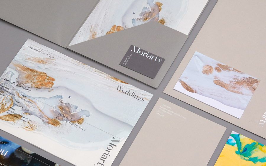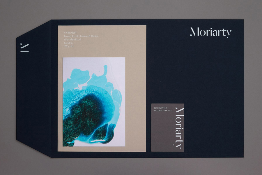 Inspired by the spontaneity and celebratory energy of parties and exploring the idea that curating great events is an art form, design studio Bond crafted a visual identity for new luxury event planning business Moriarty based around a series of abstract ink illustrations. These are used alongside high quality dyed papers and boards, bringing a measured and distinctive contrast to printed assets, and paired with Dala Moa. These link printed assets that included folders, business cards and pitch documents.