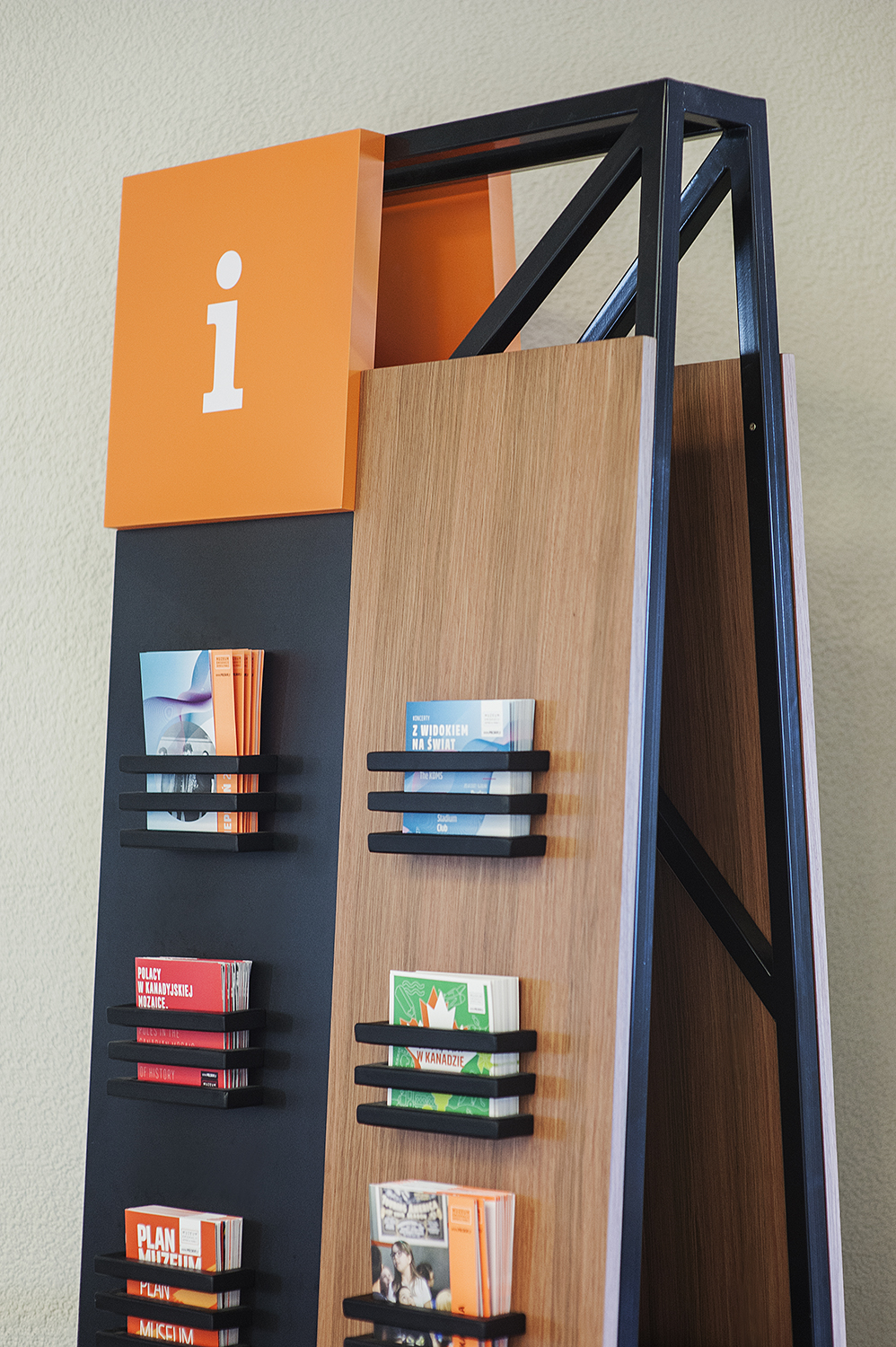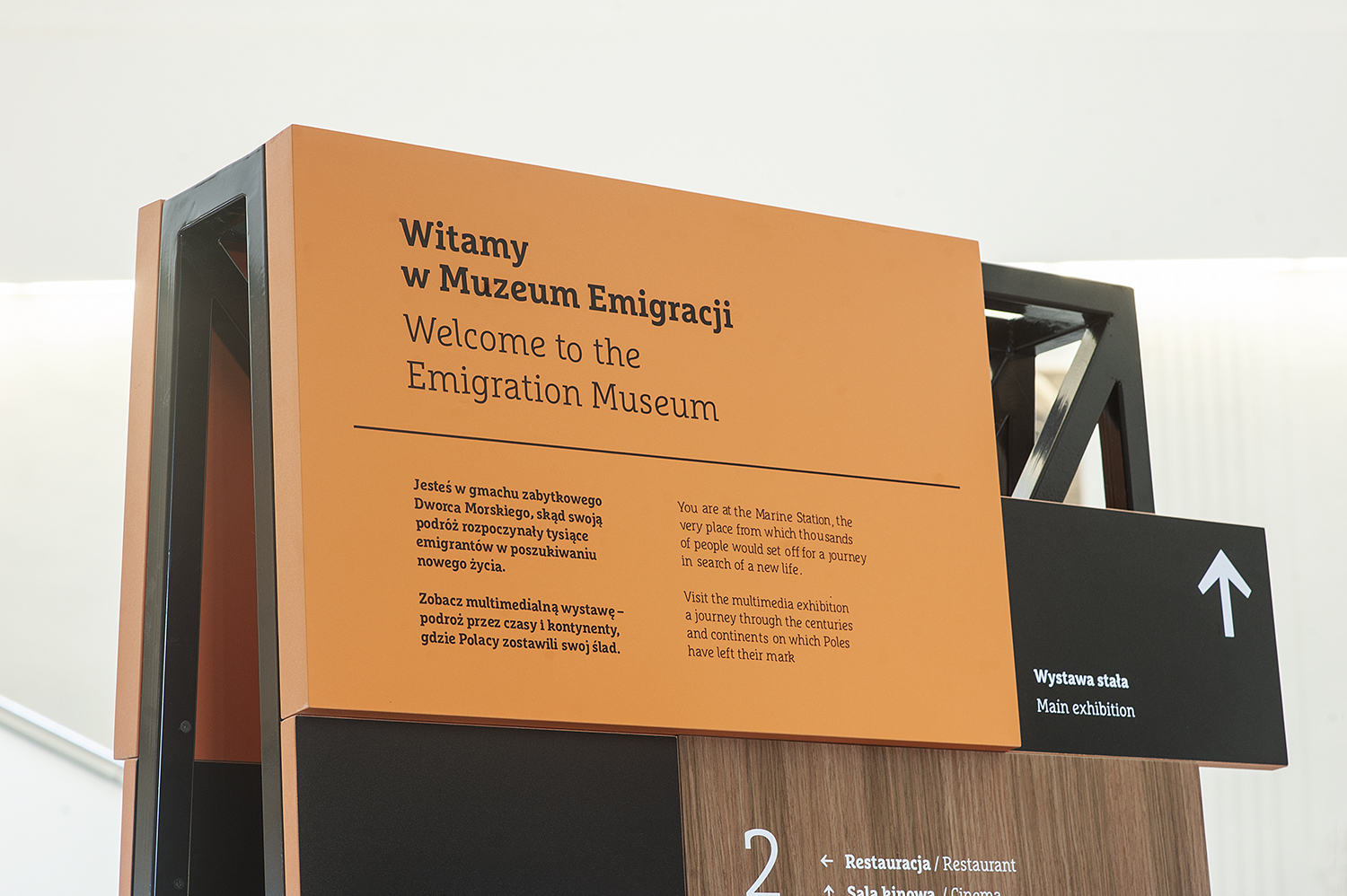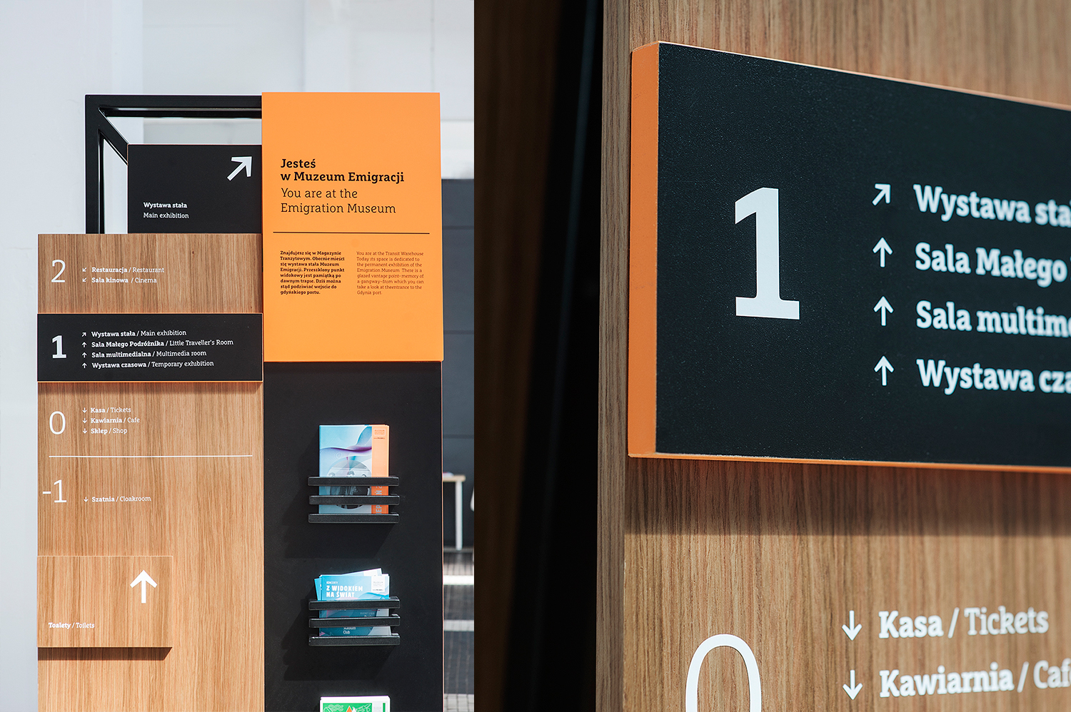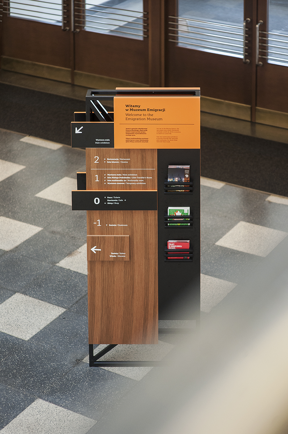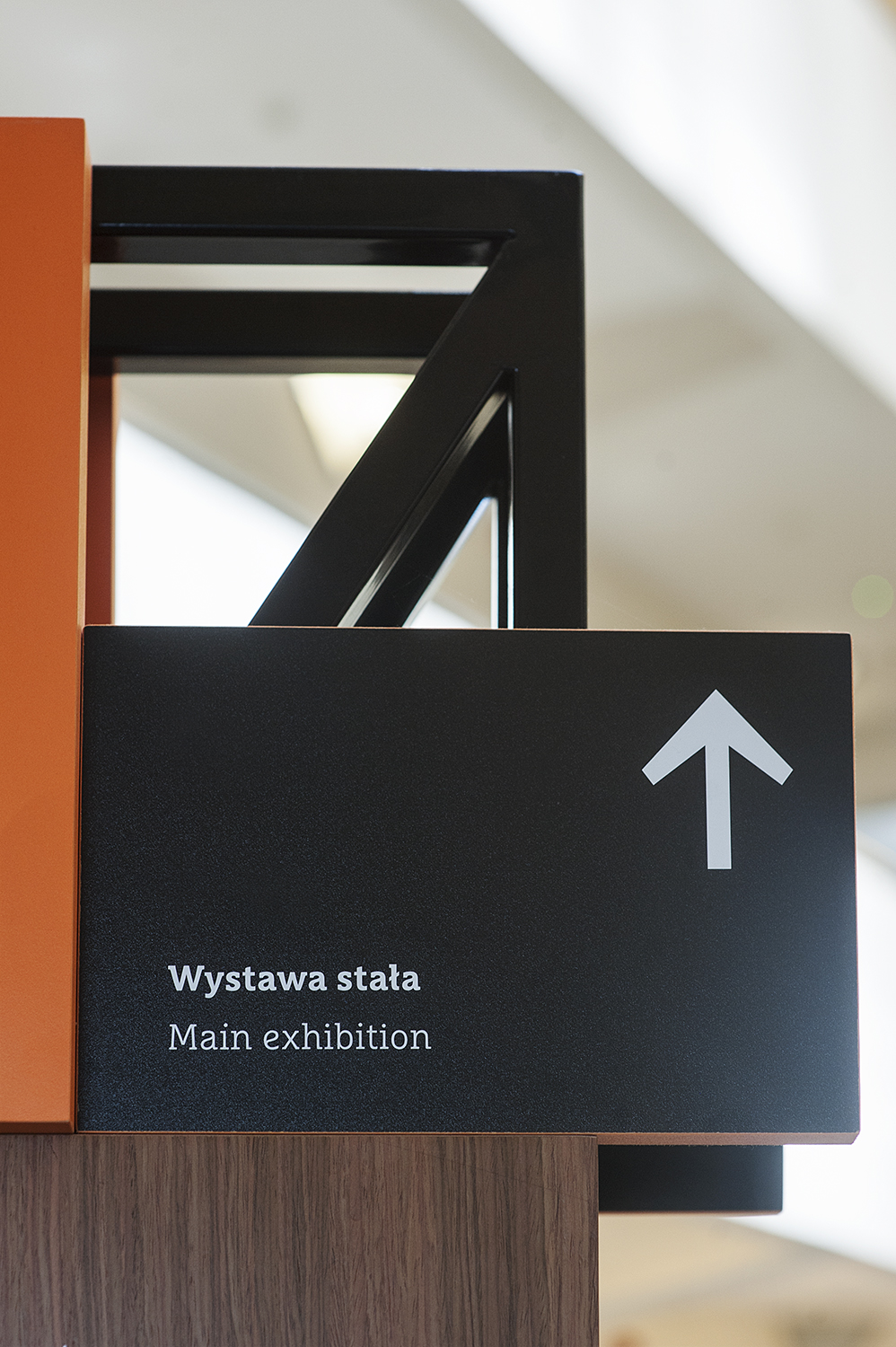 Our task, as designers of the wayfinding elements, was to emphasize and complement the beauty of the modernist building – to make the final product look like an inseparable element of the existing space. These assumptions have lead us to use materials (wood, steel, etc.) and a design that are characteristic for the 1920s and 1930s. We decided to make the carriers playful and pleasant to look at, that’s why we have chosen modularity. We also have chosen an elegant font with a modernist look: FF Marselis Slab. As a result we developed both the product (3D carrier design, construction) and graphic look of the presented elements.