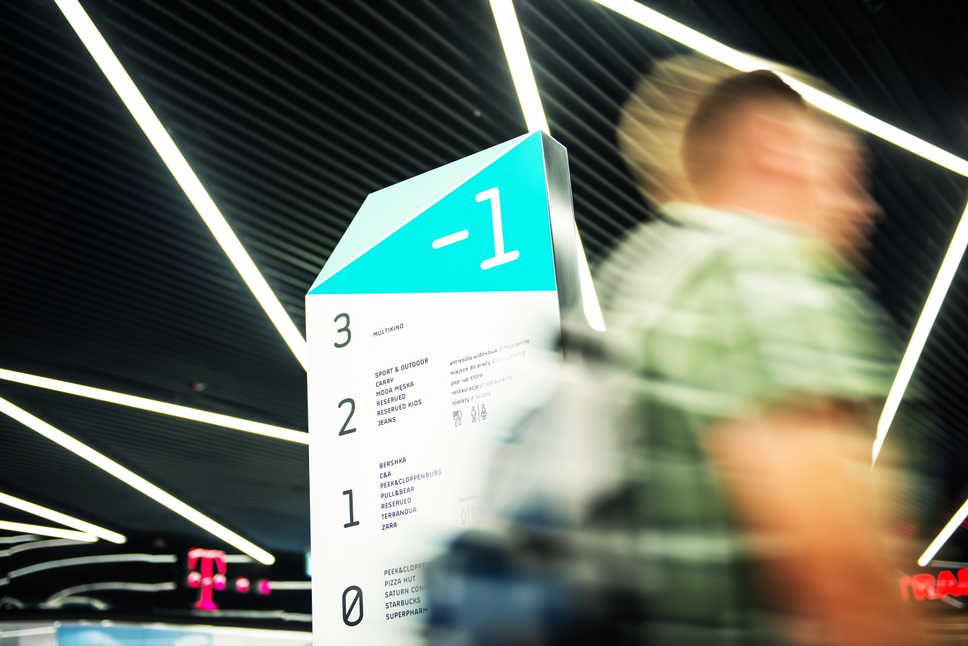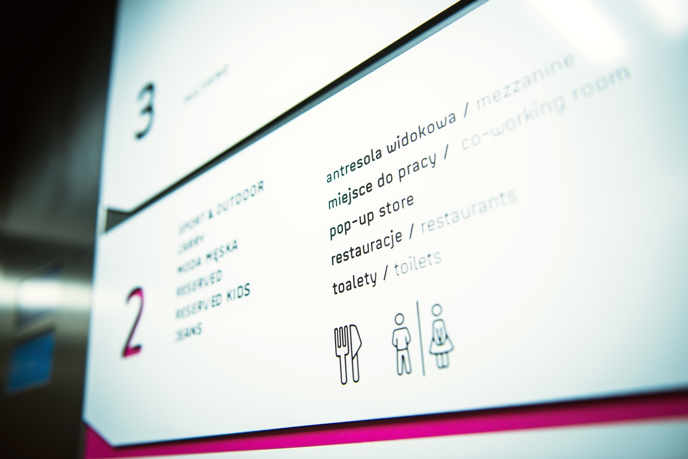 The photos presented here document the complex redesign of the wayfinding system in the Galeria Katowicka Shopping Center in Katowice, Poland. Our role as designers was to fit in the existing scheme and make the system more playful. We had the opportunity to use the beautiful Carbon – a typeface family in six weights specially designed by Kamil Kurzajewski for Galeria Katowicka Shopping Centre. The font was applied in the wayfinding system all across the shopping mall and in all their advertising materials. Because of its technical style, the font finds its place in the industrial atmosphere of the city. With its characteristic round edges and the specific construction of a few characters, Carbon is distinctive and warm in reception. See more images of the wayfinding system and the pictograms on Behance.