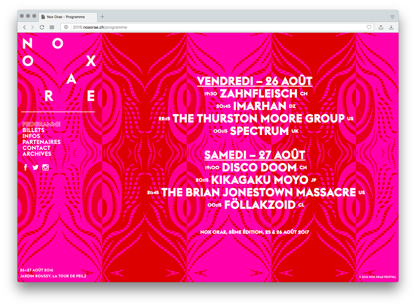 Nox Orae 2016 Contributed by Swiss Typefaces on Nov 9th, 2017. Artwork published in circa 2016. License: All Rights Reserved. Poster design for the 2016 edition of music festival Nox Orae. Designed by Ultra Studio, Vevey. Euclid Flex typeface is available from Swiss Typefaces. License: All Rights Reserved. Source: 2016.noxorae.ch License: All Rights Reserved. Web adaptation by Simon Pinkas Typefaces More about Euclid FlexGet Euclid Flex Formats Web (5553) Posters/Flyers (5687) Topics Event (3165) Music (6261) Designers/Agencies ultra:studio (2) Tagged withmusic festival (1)Nox Orae (1)pink (400)concert & gig posters (508)all caps (7478)reversed type (3328)center-aligned text (1874)one typeface (1746)local type (261) Artwork location Switzerland (1108) Vevey (18) In SetsTrendy sans (Josep) (24) Post a comment Name Email – will not be published Website Your response Submit Comment More Euclid Flex in use Basel Sinfonietta 2015/2016c. 2015Hauser, SchwarzContributed by Swiss Typefaces Staff Pick Desdémone. Entre désir et désespoir2015PrototypeAurore JanninLaurent PinonContributed by Swiss Typefaces Modernités plurielles. 1905–1970 catalog2013PrototypeAurore JanninLaurent PinonContributed by Swiss Typefaces Sponsor More in Event Strike a Pose festival 2023c. 2023BY STUDIOContributed by Sebastian Johansen Slim Cessna’s Auto Club at Močvara concert poster2023Krunoslav NemčićContributed by Hrvoje Živčić Staff Pick Fig Festival 20232023Benjamin DupuisContributed by Oudin Romain HBKsaar “link” lecture series2018Indra KupferschmidContributed by Florian Hardwig Staff Pick More in Web Inker linker2011Jessica HischeContributed by Rosetta Plum Organicsc. 2018Plum OrganicsContributed by Darden Studio Gunnar Harrison portfolio2018Gunnar HarrisonContributed by Gunnar Harrison Coucou magazine2013Büro FaxContributed by Seán Kennedy More Fonts In Use Emancipation Proclamation stamp2012Gail AndersonAntonio AlcaláContributed by Chris Purcell Staff Pick Gothic Condensed(Sample unavailable)Antique Extra Condensed(Sample unavailable) Guglhupf Bar2023AcuteContributed by Hrvoje Živčić Staff Pick New York magazine’s ‘Television in Crisis’ series2020New York MagazineContributed by Nick Sherman Staff Pick Rhythm Machine – Rhythm Machine album art1976James CoxHerschel CaldwellContributed by PampaType Team Staff Pick