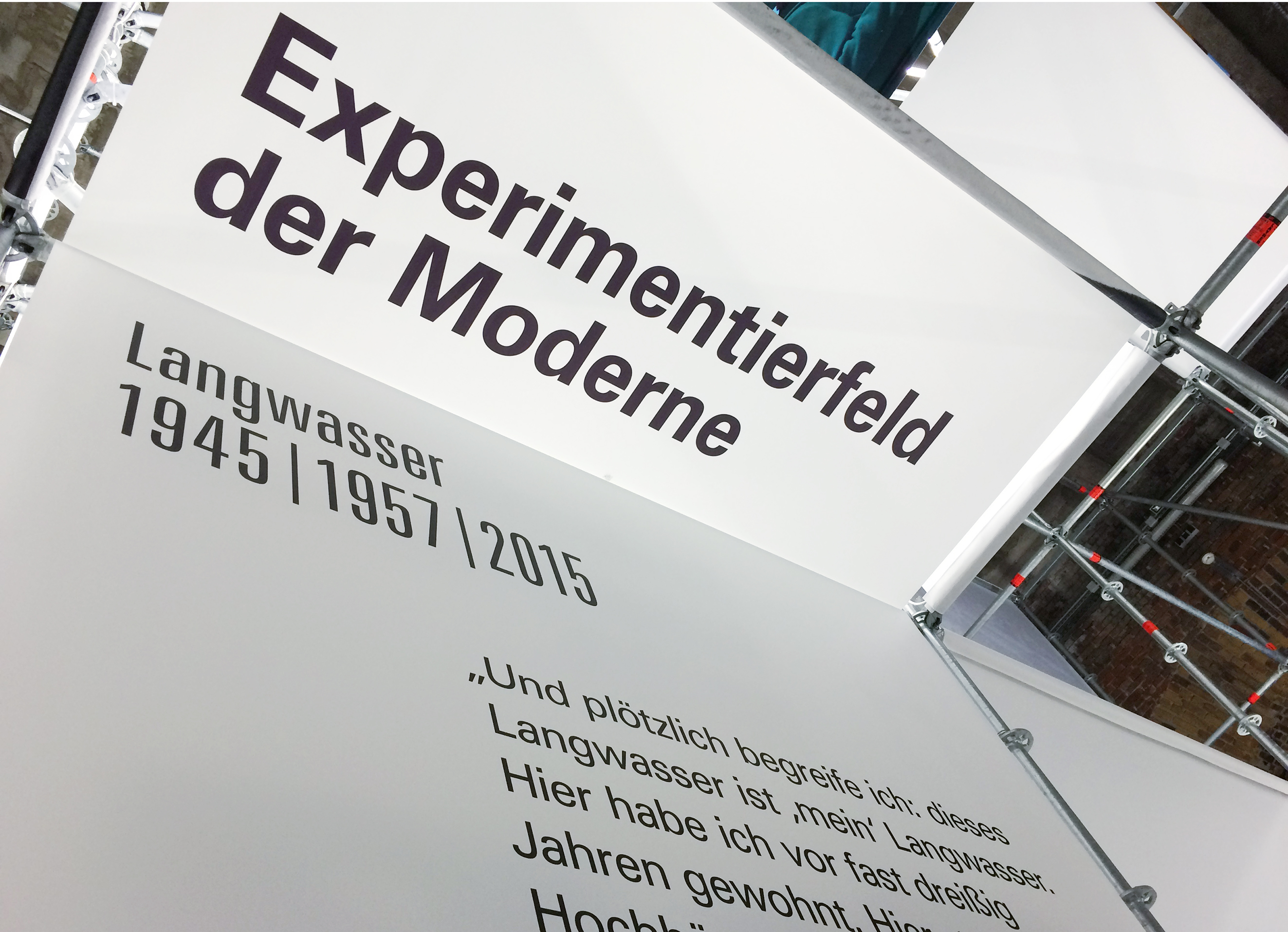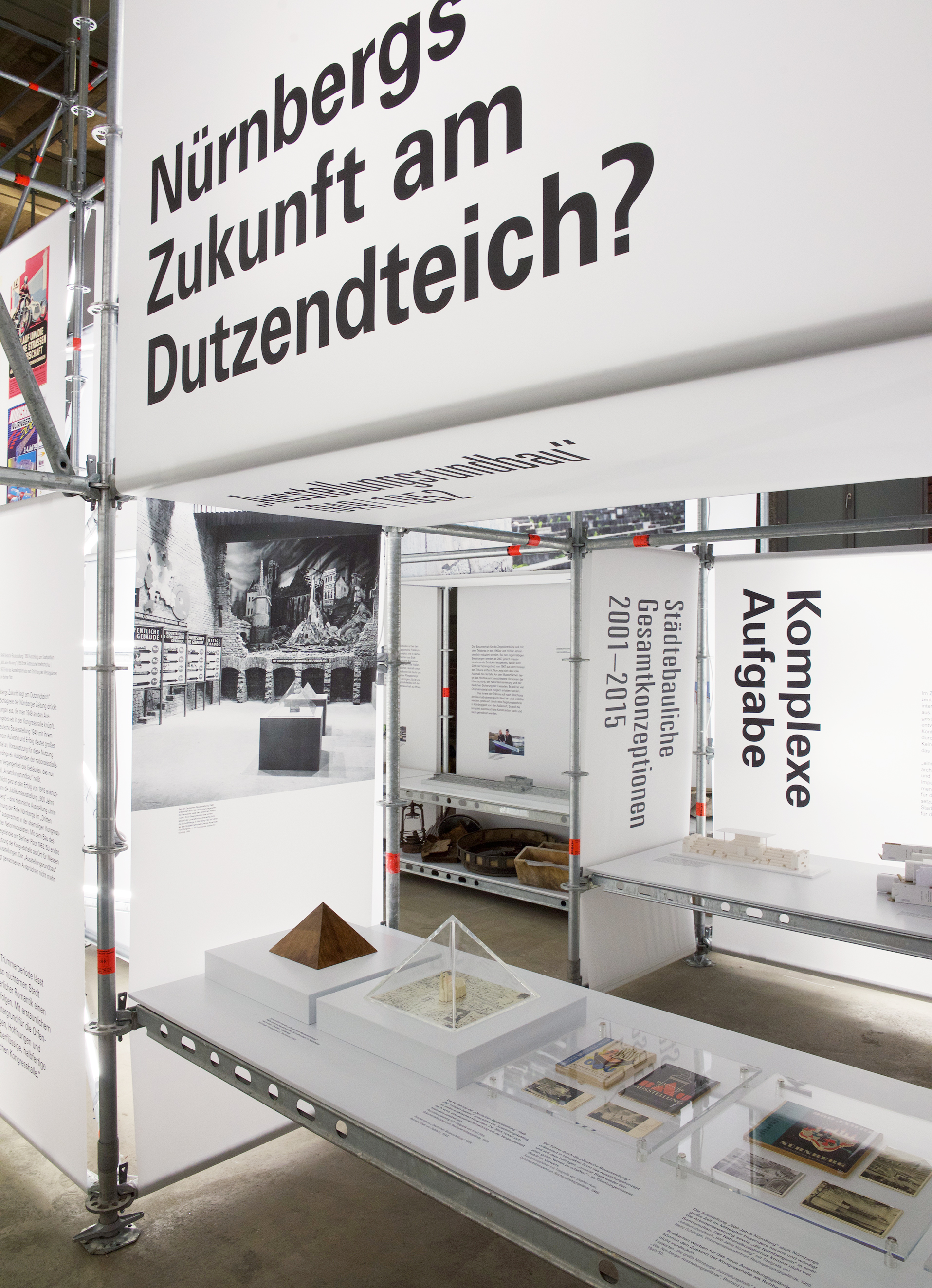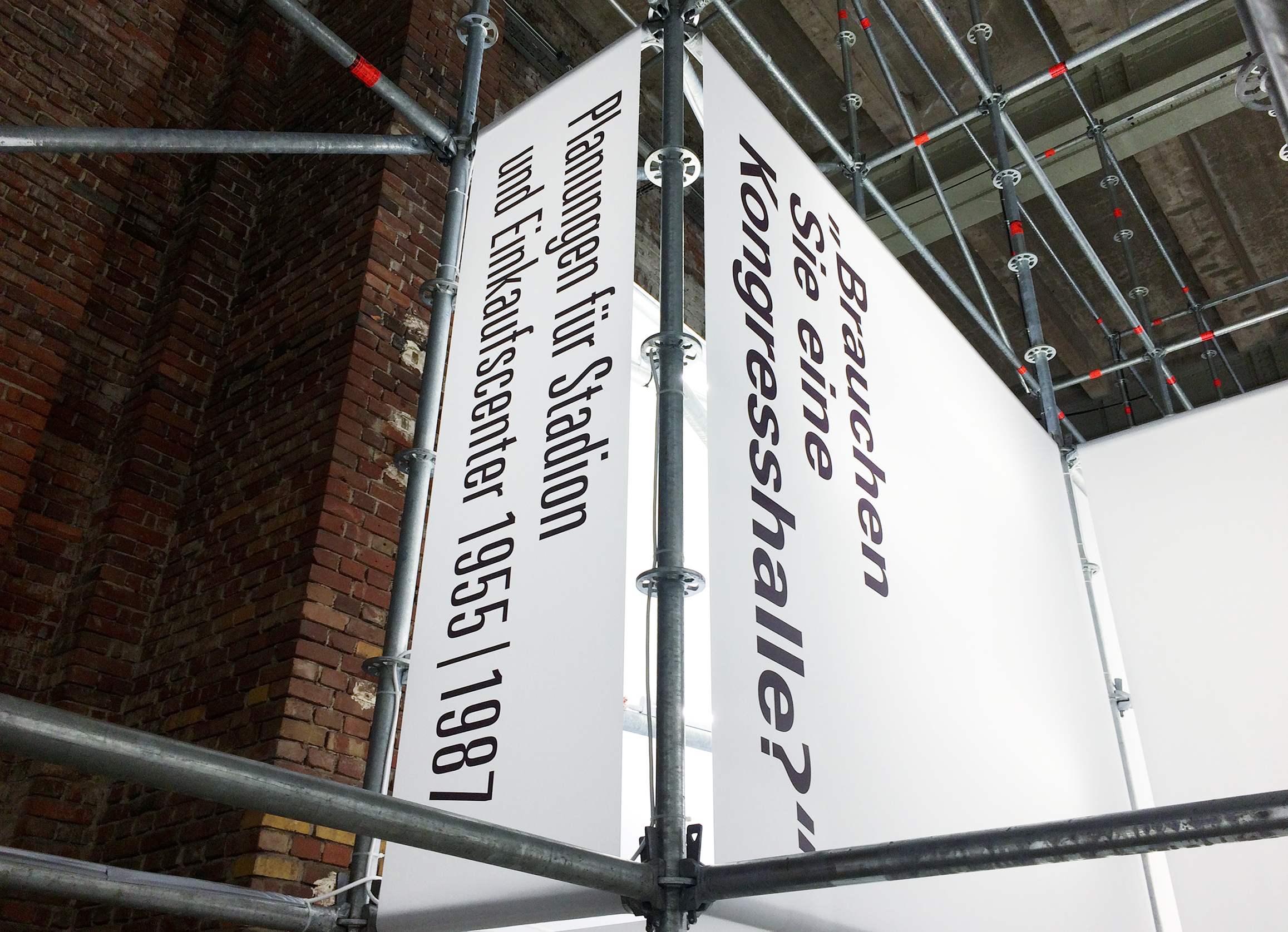 The temporary exhibition “Das Gelände: Dokumentation. Perspektiven. Diskussion.” at the Documentation Centre Nazi Party Rally Grounds takes a look at potential uses for the enormous Third Reich-era buildings in Nuremberg. The typography is printed on large panels hanging from scaffolding at different heights and on different layers, thus giving visitors many different perspectives. The exhibition typography that features in the exhibition is bold and clear.
