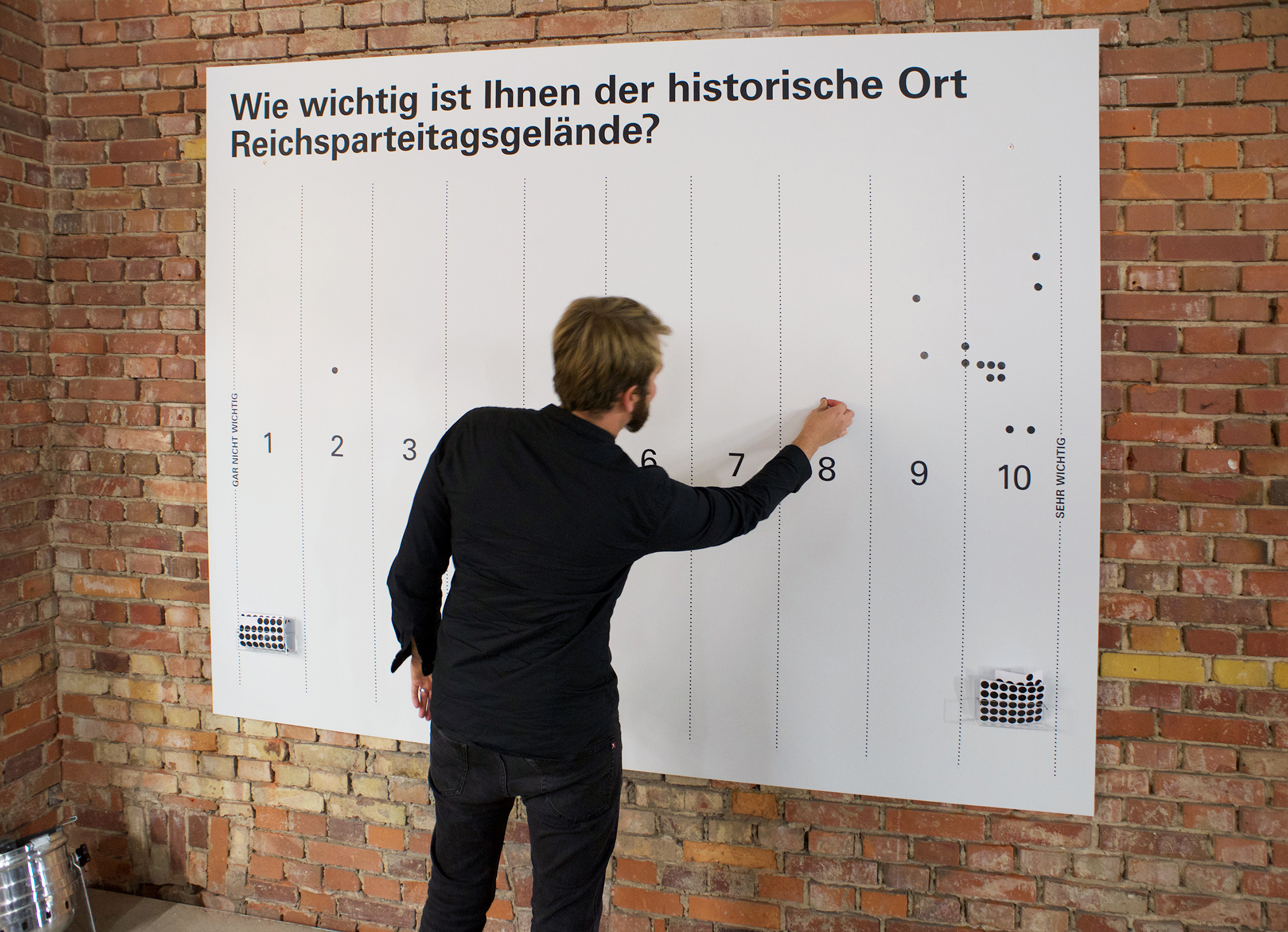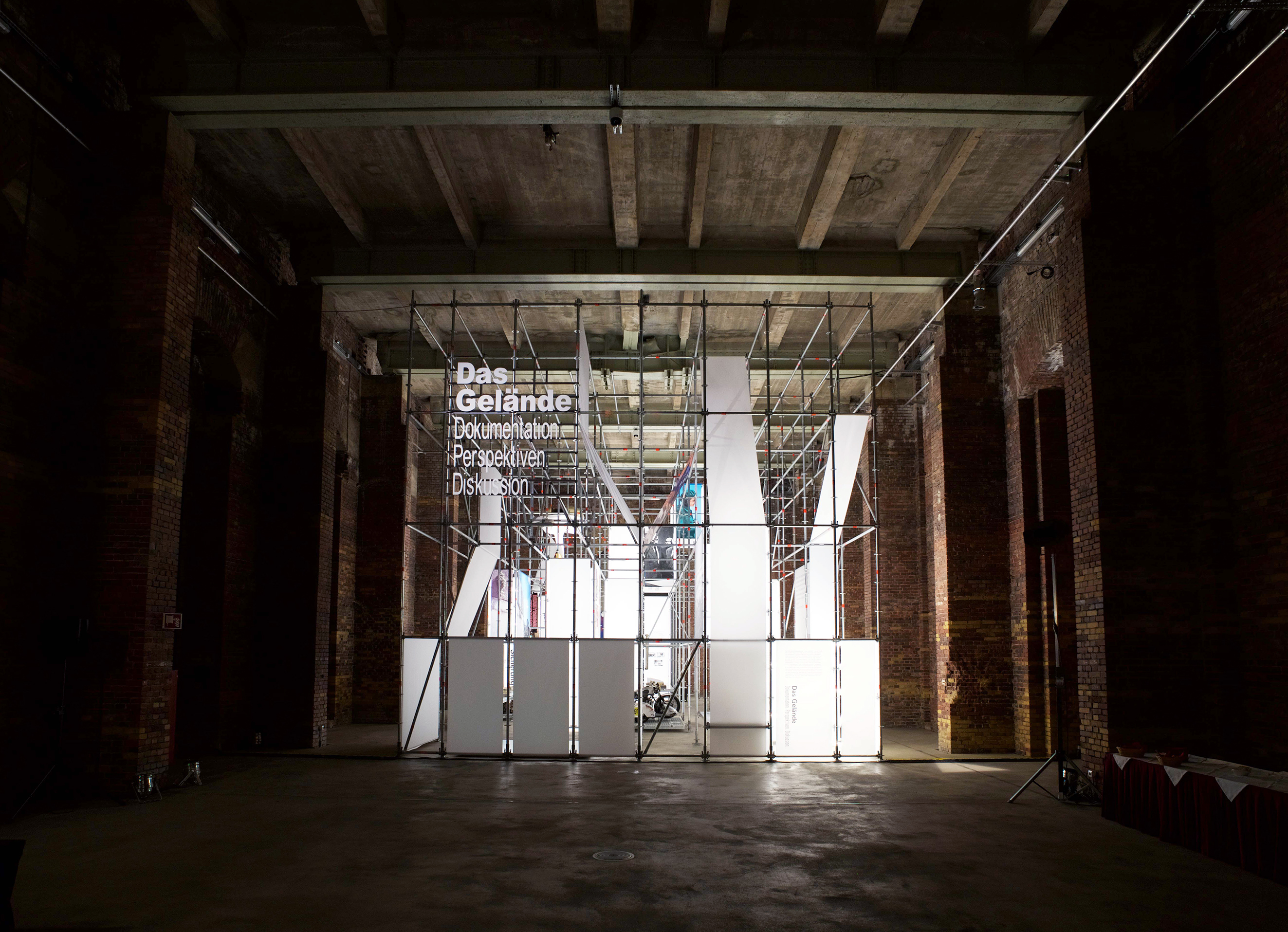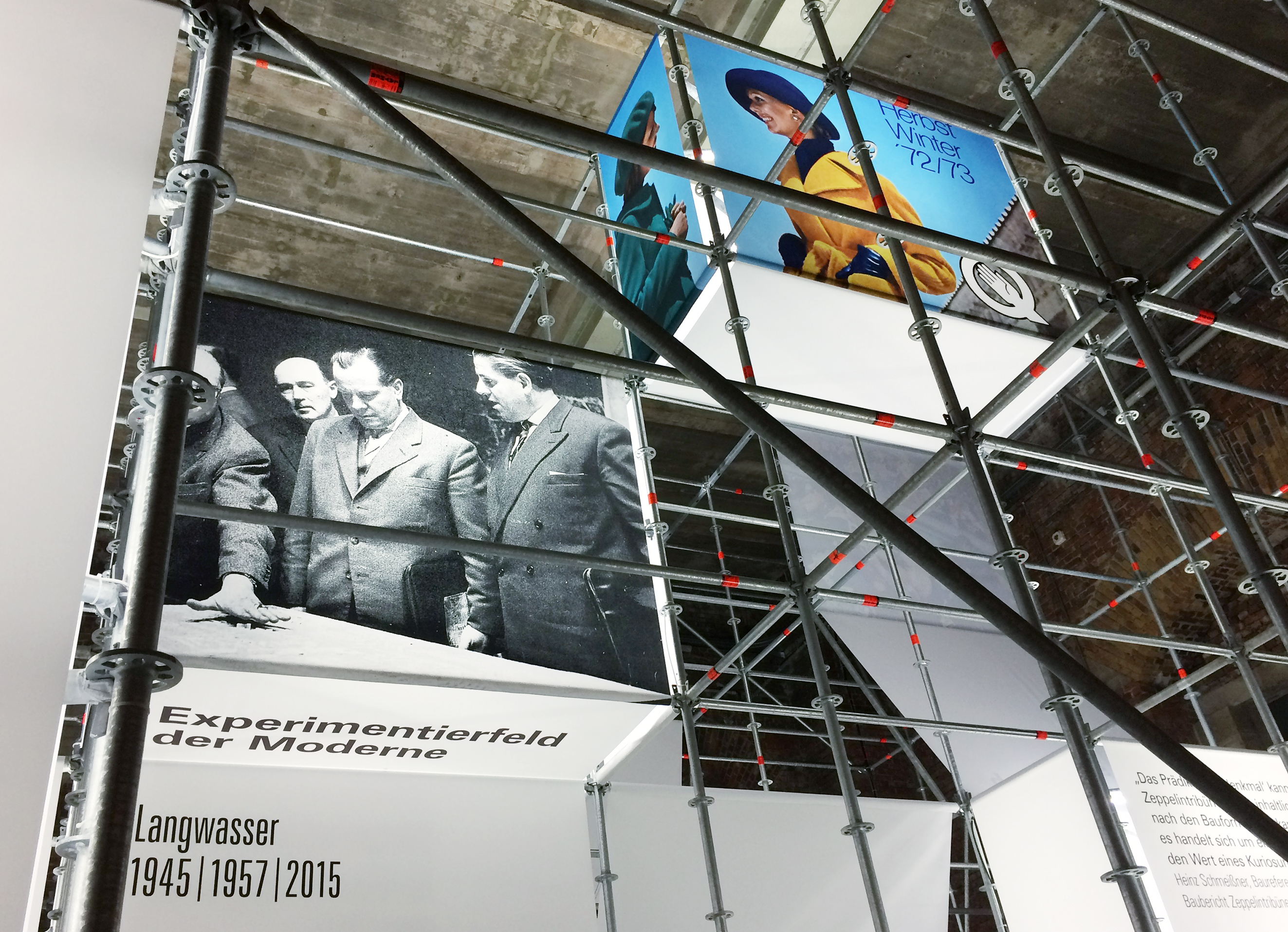 The temporary exhibition “Das Gelände: Dokumentation. Perspektiven. Diskussion.” at the Documentation Centre Nazi Party Rally Grounds takes a look at potential uses for the enormous Third Reich-era buildings in Nuremberg. The typography is printed on large panels hanging from scaffolding at different heights and on different layers, thus giving visitors many different perspectives. The exhibition typography that features in the exhibition is bold and clear.